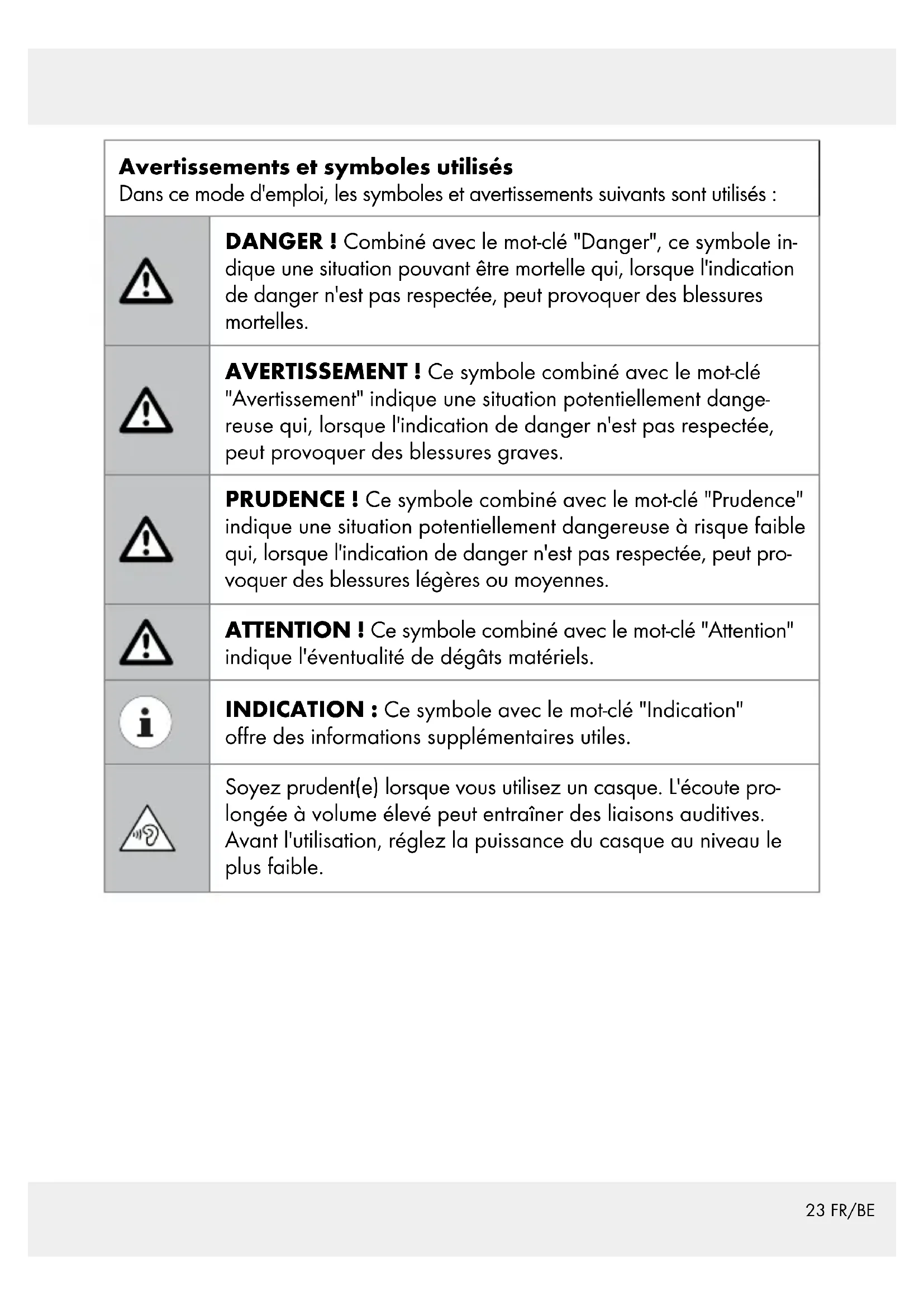 Arceau Caractéristiques techniques Dimensions : env. 162 mm x 145 mm x 63 mm Poids : env. 105 g Longueur du câble audio : env. 175 cm Température de fonctionnement : 5 °C – 35 °C Humidité de l‘air (pas de condensation) : 10 % – 70 % Température de stockage : 0 °C – 40 °C Tension caractéristique de la large bande (WBCV) : 3,6 V ± 10 %26 FR/BE Enceinte Taille de haut-parleur : 30 mm Impédance : 32 Ω ± 10 Ω Sensibilité : 80 dBA ± 5 dB Réponse en fréquence : 20 Hz à 20 kHz Consignes générales de sécurité Prenez connaissance de toutes les indications de maniement et de sécurité avant d’utiliser l’appareil pour la première fois! Si vous remettez le produit à un tiers, veuillez également lui transmettre tous les documents s‘y rapportant! DANGER DE MORT ET RISQUE DE BLESSURE POUR LES EN- FANTS ET LES ENFANTS EN BAS ÂGE! DANGER Risque d‘asphyxie! Ne jamais laisser les enfants sans surveillance à proximité de l’emballage. Il existe un risque d’étouffement par le matériel d’emballage. Les enfants sous-estiment souvent le danger. Le matériel d‘emballage n‘est pas un jouet. Le produit peut être utilisé par des enfants âgés de 6 ans et plus ainsi que par des personnes ayant des capacités physiques, sensorielles ou mentales réduites ou manquant d‘expérience ou de connaissances, s‘ils sont surveillés ou s‘ils ont été informés de l‘utilisation sûre du produit et comprennent les risques liés à son utilisation. Les enfants ne doivent pas jouer avec le pro- duit. Le nettoyage et l‘entretien du produit ne doivent pas être effectués par des enfants laissés sans surveillance. Le produit n‘est pas un jouet.