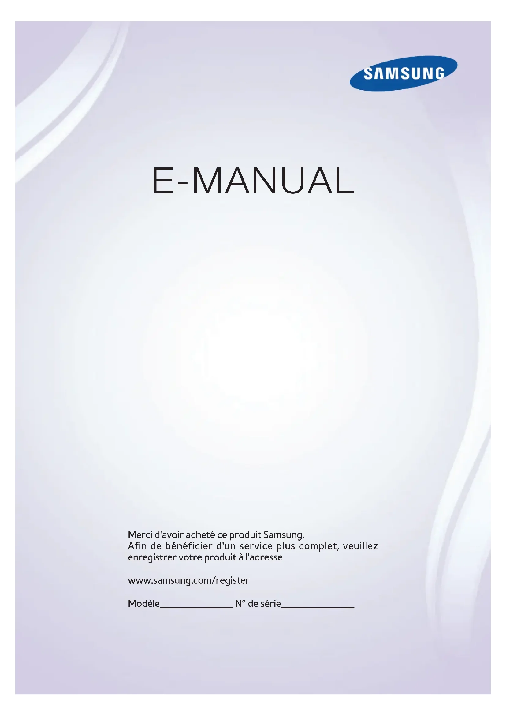 E-MANUAL Merci d'avoir acheté ce produit Samsung. Afin de bénéficier d'un service plus complet, veuillez enregistrer votre produit à l'adresse www.samsung.com/register Modèle______________ N° de série______________Contenu Guide e-Manual Affichage de l'e-Manual 1 Défilement d'une page 1 Utilisation des icônes principales 1 Retour à la page d'accueil1 Recherche dans l'index2 Recherche de pages2 Fermeture du manuel électronique 2 Accès à une option de menu 2 Mise à jour de l'e-Manual Connexions Connexion avec antenne Connexions de périphériques vidéo 5 Connexion HDMI 6 Connexion Composant 6 Connexion AV 7 Connexion SCART (Péritel) Connexions aux périphériques audio 8 Connexion audio numérique (Optique) 9 ARC (canal de retour audio) Connexion d'un casque Connexion d'un ordinateur 10 Connexion HDMI 11 Connexion HDMI vers DVI Mise en route Basculement entre différentes sources vidéo Programmation 13 Recherche automatique Paramètres chaînes 14 Pays (zone) 15 Recherche manuelle 15 Lorsque l'option Aerial Source est réglée sur Air ou Cable 16 Transf. liste chaînes 16 Supprimer profil opérateur CAM 17 Système satellite 19 Recherche de chaînes satellites Gestion des chaînes 22 Suppression de chaînes 22 Modification d'un numéro 22 Verr. chaîne 22 Déverrouillage de chaîne 22 Modification du nom de chaînes analogiques Interface commune Options audio Chaînes favorites 25 Ajout de chaînes 25 Suppression de chaînes 26 Réorganisation d'une liste de chaînes favorites 26 Modification du nom d'une liste de chaînes favorites 26 Copie d'une liste de chaînes favorites Paramètres réseau Configuration du réseau 27 Réseau câblé 28 Réseau sans fil 28 Série LED 530029 Précautions relatives aux réseaux sans fil29 Série LED 530029 Protocoles de sécurité de réseau Configuration Internet 30 Configuration automatique du réseau câblé 31 Configuration manuelle de réseau câblé 33 Echec de connexion filaire Configuration du réseau sans fil 34 Configuration automatique du réseau sans fil 35 Configuration manuelle du réseau sans fil 37 Bouton WPS 37 Echec de connexion sans fil 38 Adresses IP dynamiques ou statiques Vérification de l'état du réseau 40 Wi-Fi Direct 40 Paramètres AllShare II40 Renommer le téléviseur Commande du téléviseur Smart Touch Control 41 Insertion des piles (AAA x 2) 41 Connexion au téléviseur 42 Reconnexion du Smart Touch Control 42 Alarme de batterie faible 43 Boutons et descriptions 45 Fonctions spécifiques Touch Pad 46 Faire glisser 46 Appuyez sur 47 Mouvement rapide 47 Maintenez appuyé 47 Appuyez et déplacez 48 Défilement haut/bas 48 Défilement gauche/droite 49 Changement de chaîne par la saisie de chiffres 49 Guide de saisie numérique 49 Réglage du Touch Pad 49 Affichage du bandeau d'état et de notification 50 Recommandations 50 Historique 50 Supprimer des données de l'historique 50 Recherche Utilisation de la télécommande virtuelle 51 Modification du panneau de configuration de la télécommande virtuelle 51 Changer la position du panneau de la télécommande virtuelle 51 Utilisation du panneau numérique 51 Utilisation du panneau de configuration de la lecture 51 Utilisation du panneau d'accès rapide 51 Réglage de la télécommande virtuelle Config téléc universelle 52 Connexion du CABLE D'EXTENSION IR 52 Ajout du périphérique externe 53 Utilisation de la télécommande universelle 53 Gestion de périphérique externe enregistré Saisie de texte à l'aide du clavier à l'écran 54 Saisie de texte à l'aide du clavier QWERTY 54 Fonctionnalités supplémentaires Interaction intelligente Interaction INTELLIGENTE 55 Précautions 55 Reconnaissance faciale 55 Utilisation de la caméra TV 56 Commande par mouv. 56 Reconnaissance vocale Reconnaissance vocale 58 Environnement d'utilisation 58 Didacticiel reconnaissance vocale 58 Activation de Reconnaissance vocale 59 Utilisation de base de la Reconnaissance vocale 59 Paramètres de la Reconnaissance vocale 60 Commandes de Reconnaissance vocale interactive 60 Désactivation de la fonction Reconnaissance vocale Commande par mouv. 61 Environnement d'utilisation 62 Test environnement Commande par mouv. 62 Didacticiel sur la commande par mouvement 62 Activation de la commande par mouvements 63 Utilisation des commandes par mouvements de base 63 Options de commande par mouvements 64 Ecran Commande par mouv. 64 Composition de l'écran lorsque vous regardez la télévision 65 Composition de l'écran Smart Hub Reconnaissance faciale 67 Environnement d'utilisation 67 Gardez à l'esprit les informations suivantes lorsque vous utilisez la reconnaissance faciale : 68 Enregistrement du visage 68 Login par reconnaissance faciale Utilisation de dispositifs périphériques 69 Connexion d'un clavier 69 Utilisation du clavier 70 Connexion d'une souris 70 Utilisation d'une souris Visionnement du téléviseur Visionnement du téléviseur 71 Informations sur les programmes 71 Changement de signal de diffusion 71 Guide 71 Changement de chaîne 72 Enregistrement du programme en cours de diffusion 72 Changement de catégorie II III72 Quick Navigation 72 Programmer visionnage 72 Programmer enregistrement 72 Consultation des informations sur les programmes 73 Liste des chaînes 73 Changement de chaîne 73 Tri 74 Genre 74 Changement de signal de diffusion 74 Changement de liste des chaînes Programmer visionnage 75 Programmation du visionnage de chaîne numérique 75 Guide 75 Informations sur les programmes 76 Programmation du visionnage de chaîne analogique 76 Annulation d'un visionnage programmé 76 Modifier la liste des programmes Programmer enregistrement 77 Précautions 78 Configuration de périphérique d'enregistrement dédié 78 Plug & Play 79 Gestion de périphérique d'enregistrement dédié 79 Enregistrement de programmes 79 Guide 80 Informations sur les programmes 80 Heure et date spécifiées 80 Annulation de la fonction Programmer enregistrement 80 Modification de la liste de 