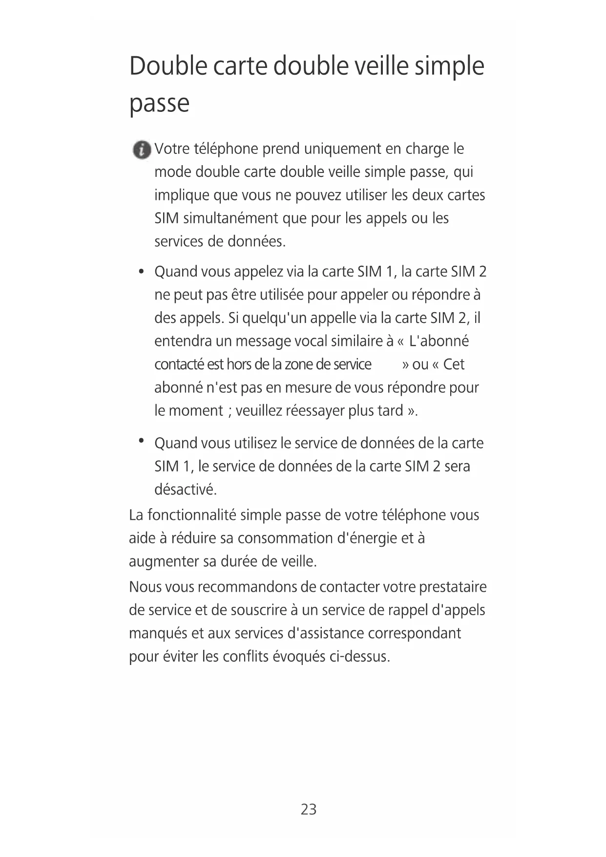 DES DOMMAGES CORPORELS DANS LA MESURE OÙ LA LOI EN VIGUEUR AUTORISE CETTE LIMITATION), RÉSULTANT DE L'UTILISATION DU PRODUIT DÉCRIT DANS LE PRÉSENT DOCUMENT EST LIMITÉE AU MONTANT PAYÉ PAR LES CLIENTS À L'ACHAT DU PRODUIT. Réglementations relatives à l'importation/ exportation Les clients doivent se conformer aux lois et aux réglementations en vigueur relatives à l'exportation et à l'importation et il leur incombe d'obtenir toutes les autorisations et licences administratives nécessaires pour l'exportation, la réexportation ou l'importation du produit mentionné dans ce manuel, y compris le logiciel et les données techniques. Politique de confidentialité Pour une meilleure compréhension de la protection des informations personnelles, référez-vous à la politique de confidentialité à l'adresse http://consumer.huawei.com/privacy-policy.49 Dual-SIM-Standby Ihr Telefon unterstützt nur Dual-SIM-Standby, was bedeutet, dass Sie nicht beide SIM-Karten gleichzeitig für Anrufe oder Datendienste verwenden können.