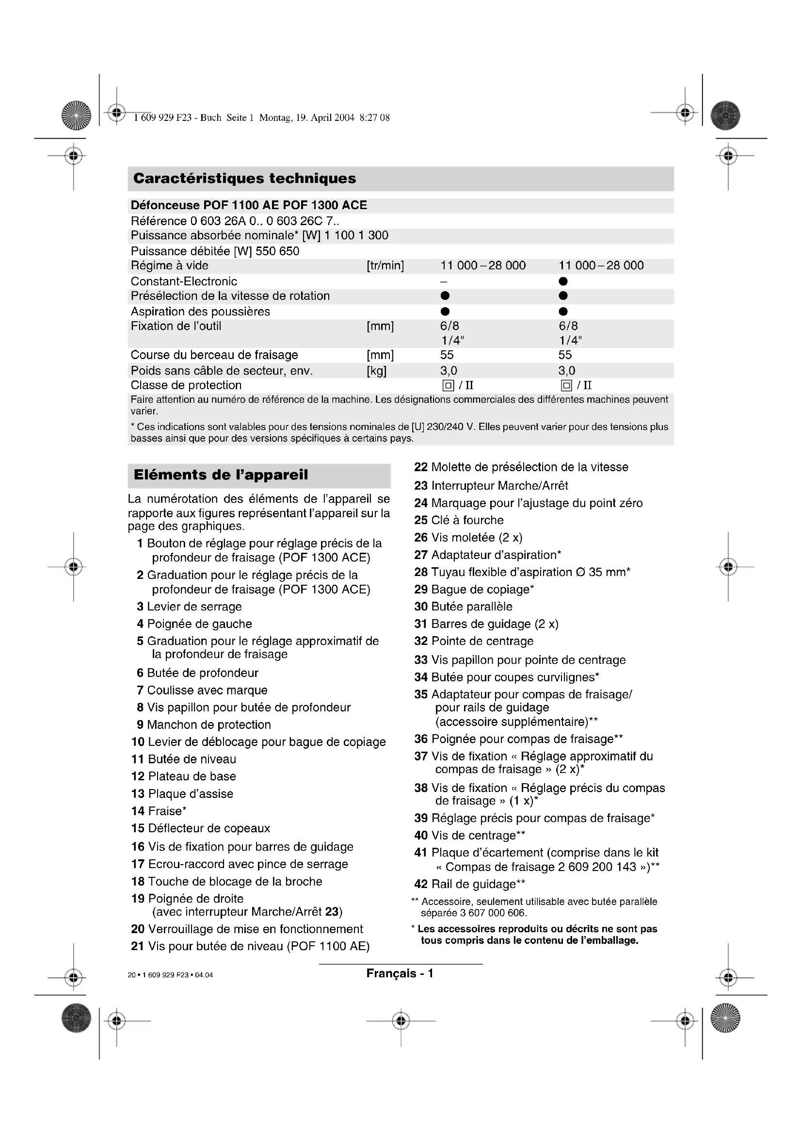 Exploded views and information on spare parts can be found under: www.bosch-pt.com Great Britain Robert Bosch Ltd. (B.S.C.) P.O. Box 98 Broadwater Park North Orbital Road Denham-Uxbridge Middlesex UB 9 5HJ ✆ Service............................ +44 (0) 18 95 / 83 87 82 ✆ Advice line .................... +44 (0) 18 95 / 83 87 91 Fax ............................................. +44 (0) 18 95 / 83 87 89 Ireland Beaver Distribution Ltd. Greenhills Road Tallaght-Dublin 24 ✆ Service................................... +353 (0)1 / 414 9400 Fax .................................................... +353 (0)1 / 459 8030 Australia Robert Bosch Australia Ltd. RBAU/SPT2 1555 Centre Road P.O. Box 66 Clayton 3168 Clayton/Victoria ✆ ............................................... +61 (0)1 / 800 804 777 Fax ............................................... +61 (0)1 / 800 819 520 www.bosch.com.au E-Mail: CustomerSupportSPT@au.bosch.com New Zealand Robert Bosch Limited 14-16 Constellation Drive Mairangi Bay Auckland New Zealand ✆ ..................................................... +64 (0)9 / 47 86 158 Fax ..................................................... +64 (0)9 / 47 82 914 We declare under our sole responsibility that this product is in conformity with the following stand- ards or standardization documents: EN 60 745 according to the provisions of the directives 89/336/EEC, 98/37/EC. Dr. Egbert Schneider Dr. Eckerhard Strötgen Senior Vice President Head of Product Engineering Certification Robert Bosch GmbH, Geschäftsbereich Elektrowerkzeuge Subject to change without notice Environmental Protection Noise/Vibration Information Service and Customer Assistance Declaration of Conformity 1 609 929 F23 - Buch Seite 7 Montag, 19. April 2004 8:27 08 19 • 1 609 929 F23 • 04.04Français - 1 La numérotation des éléments de l’appareil se rapporte aux figures représentant l’appareil sur la page des graphiques. 1 Bouton de réglage pour réglage précis de la profondeur de fraisage (POF 1300 ACE) 2 Graduation pour le réglage précis de la profondeur de fraisage (POF 1300 ACE) 3 Levier de serrage 4 Poignée de gauche 5 Graduation pour le réglage approximatif de la profondeur de fraisage 6 Butée de profondeur 7 Coulisse avec marque 8 Vis papillon pour butée de profondeur 9 Manchon de protection 10 Levier de déblocage pour bague de copiage 11 Butée de niveau 12 Plateau de base 13 Plaque d’assise 14 Fraise* 15 Déflecteur de copeaux 16 Vis de fixation pour barres de guidage 17 Ecrou-raccord avec pince de serrage 18 Touche de blocage de la broche 19 Poignée de droite (avec interrupteur Marche/Arrêt 23) 20 Verrouillage de mise en fonctionnement 21 Vis pour butée de niveau (POF 1100 AE) 22 Molette de présélection de la vitesse 23 Interrupteur Marche/Arrêt 24 Marquage pour l’ajustage du point zéro 25 Clé à fourche 26 Vis moletée (2 x) 27 Adaptateur d’aspiration* 28 Tuyau flexible d’aspiration Ø 35 mm* 29 Bague de copiage* 30 Butée parallèle 31 Barres de guidage (2 x) 32 Pointe de centrage 33 Vis papillon pour pointe de centrage 34 Butée pour coupes curvilignes* 35 Adaptateur pour compas de fraisage/ pour rails de guidage (accessoire supplémentaire)** 36 Poignée pour compas de fraisage** 37 Vis de fixation « Réglage approximatif du compas de fraisage » (2 x)* 38 Vis de fixation « Réglage précis du compas de fraisage » (1 x)* 39 Réglage précis pour compas de fraisage* 40 Vis de centrage** 41 Plaque d’écartement (comprise dans le kit « Compas de fraisage 2 609 200 143 »)** 42 Rail de guidage** ** Accessoire, seulement utilisable avec butée parallèle séparée 3 607 000 606.