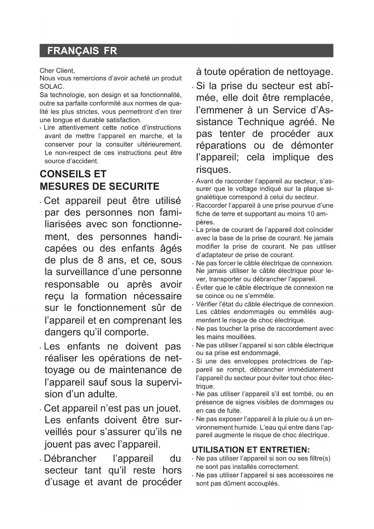 Nous vous remercions d'avoir acheté un produit SOLAC.