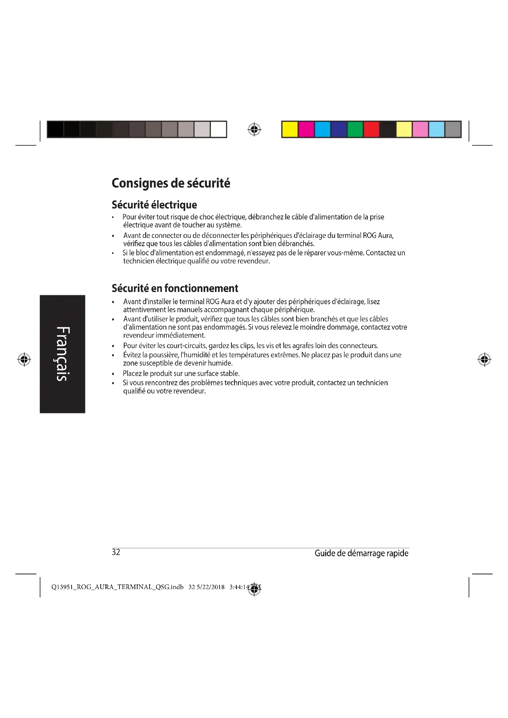 Q13951_ROG_AURA_TERMINAL_QSG.indb 31 5/22/2018 3:44:14 PM32 Guide de démarrage rapide Français Consignes de sécurité Sécurité électrique
