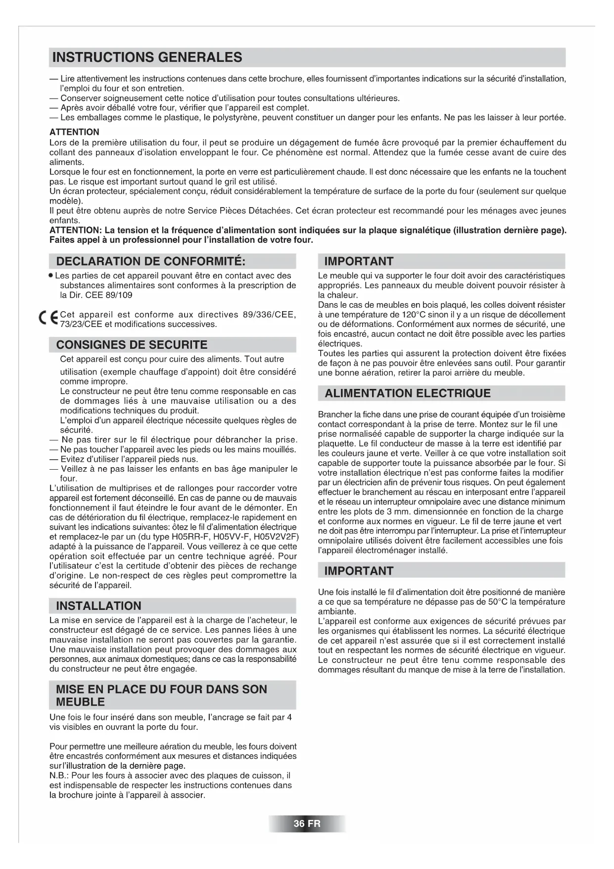 Cet appareil est conçu pour cuire des aliments. Tout autre utilisation (exemple chauffage d’appoint) doit être considéré comme impropre. Le constructeur ne peut être tenu comme responsable en cas de dommages liés à une mauvaise utilisation ou a des modifications techniques du produit. L’emploi d’un appareil électrique nécessite quelques règles de sécurité. — Ne pas tirer sur le fil électrique pour débrancher la prise. — Ne pas toucher l’appareil avec les pieds ou les mains mouillés. — Evitez d’utiliser l’appareil pieds nus. — Veillez à ne pas laisser les enfants en bas âge manipuler le four. L’utilisation de multiprises et de rallonges pour raccorder votre appareil est fortement déconseillé. En cas de panne ou de mauvais fonctionnement il faut éteindre le four avant de le démonter. En cas de détérioration du fil électrique, remplacez-le rapidement en suivant les indications suivantes: ôtez le fil d’alimentation électrique et remplacez-le par un (du type H05RR-F, H05VV-F, H05V2V2F) adapté à la puissance de l’appareil. Vous veillerez à ce que cette opération soit effectuée par un centre technique agréé. Pour l’utilisateur c’est la certitude d’obtenir des pièces de rechange d’origine. Le non-respect de ces règles peut compromettre la sécurité de l’appareil. INSTALLATION La mise en service de l’appareil est à la charge de l’acheteur, le constructeur est dégagé de ce service. Les pannes liées à une mauvaise installation ne seront pas couvertes par la garantie. Une mauvaise installation peut provoquer des dommages aux personnes, aux animaux domestiques; dans ce cas la responsabilité du constructeur ne peut être engagée. MISE EN PLACE DU FOUR DANS SON MEUBLE Une fois le four inséré dans son meuble, I’ancrage se fait par 4 vis visibles en ouvrant la porte du four. Pour permettre une meilleure aération du meuble, les fours doivent être encastrés conformément aux mesures et distances indiquées sur l’illustration de la dernière page. N.B.: Pour les fours à associer avec des plaques de cuisson, il est indispensable de respecter les instructions contenues dans la brochure jointe à l’appareil à associer. 36 FRCONSIGNES UTILES Ne jamais utiliser de grattoir, de produit chimique pour nettoyer la catalyse. Utilisez plutôt de l’eau chaude et une éponge. Si jamais vous cuisinez un plat très gras ou une viande au gril, utiliser un plat avec de grands rebords pour limiter les projections de graisse. La porosité de la catalyse est primordiale pour vous assurer un nettoyage optimal. N.B.: Les panneaux autonettoyants ont une durée de fonctionnement d’environ 300 heures. En cas de baisse d’efficacité il est alors possible de les changer.