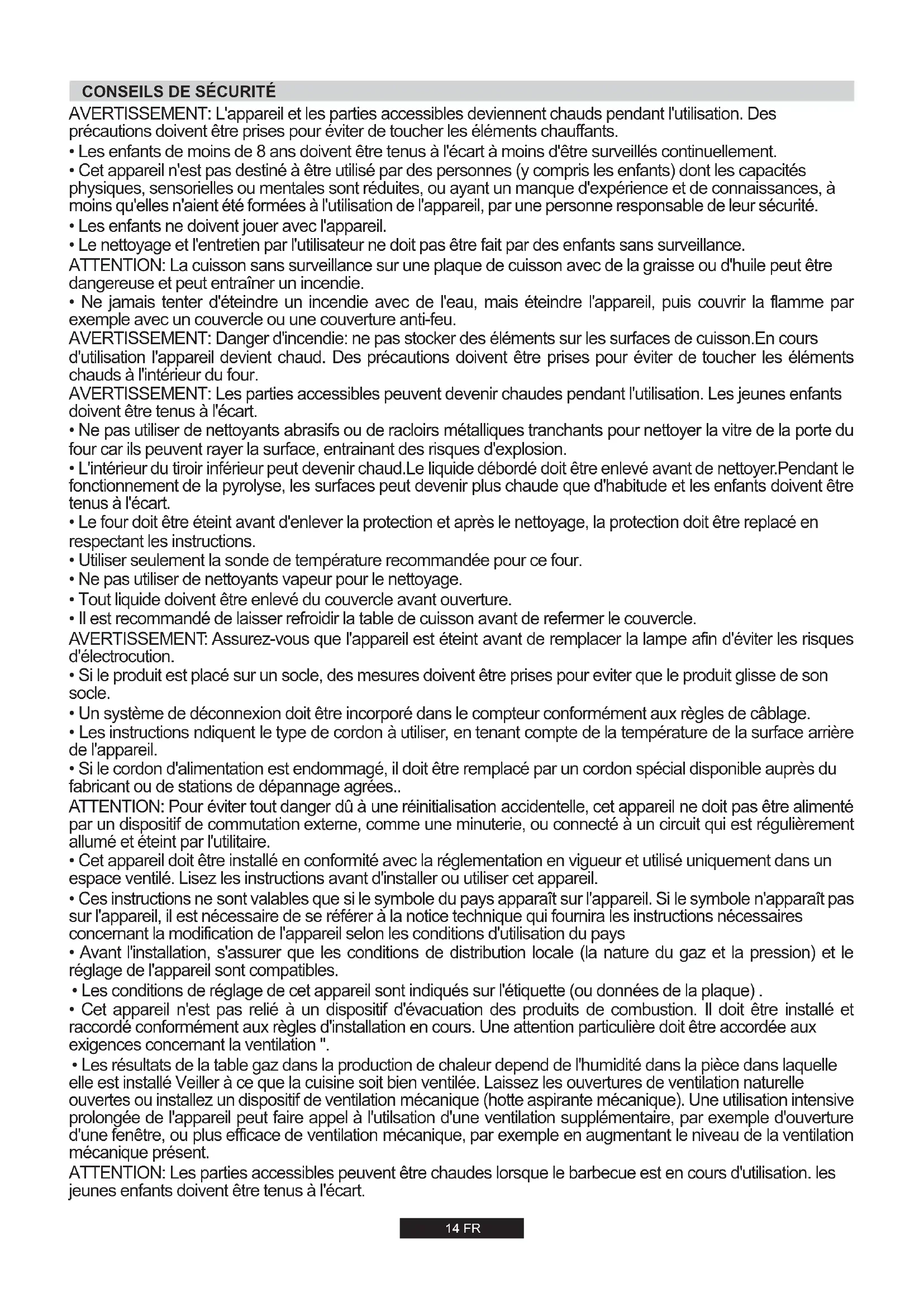 - Les résultats de la table gaz dans la production de chaleur depend de l'humidité dans la pièce dans laquelle elle est installé Veiller à ce que la cuisine soit bien ventilée. Laissez les ouvertures de ventilation naturelle ouvertes ou installez un dispositif de ventilation mécanique (hotte aspirante mécanique). Une utilisation intensive prolongée de l'appareil peut faire appel à l'utilsation d'une ventilation supplémentaire, par exemple d'ouverture d'une fenêtre, ou plus efficace de ventilation mécanique, par exemple en augmentant le niveau de la ventilation mécanique présent. ATTENTION: Les parties accessibles peuvent être chaudes lorsque le barbecue est en cours d'utilisation. les jeunes enfants doivent être tenus à l'écart. CONSEILS DE SÉCURITÉLe fabricant ne peut garantir la sécurité de la cuisinière si les règles précédemment citées ne sont pas respectées. 15 FR 1.RECOMMANDATIONS Nous vous remercions d'avoir choisi l'un de nos produits.