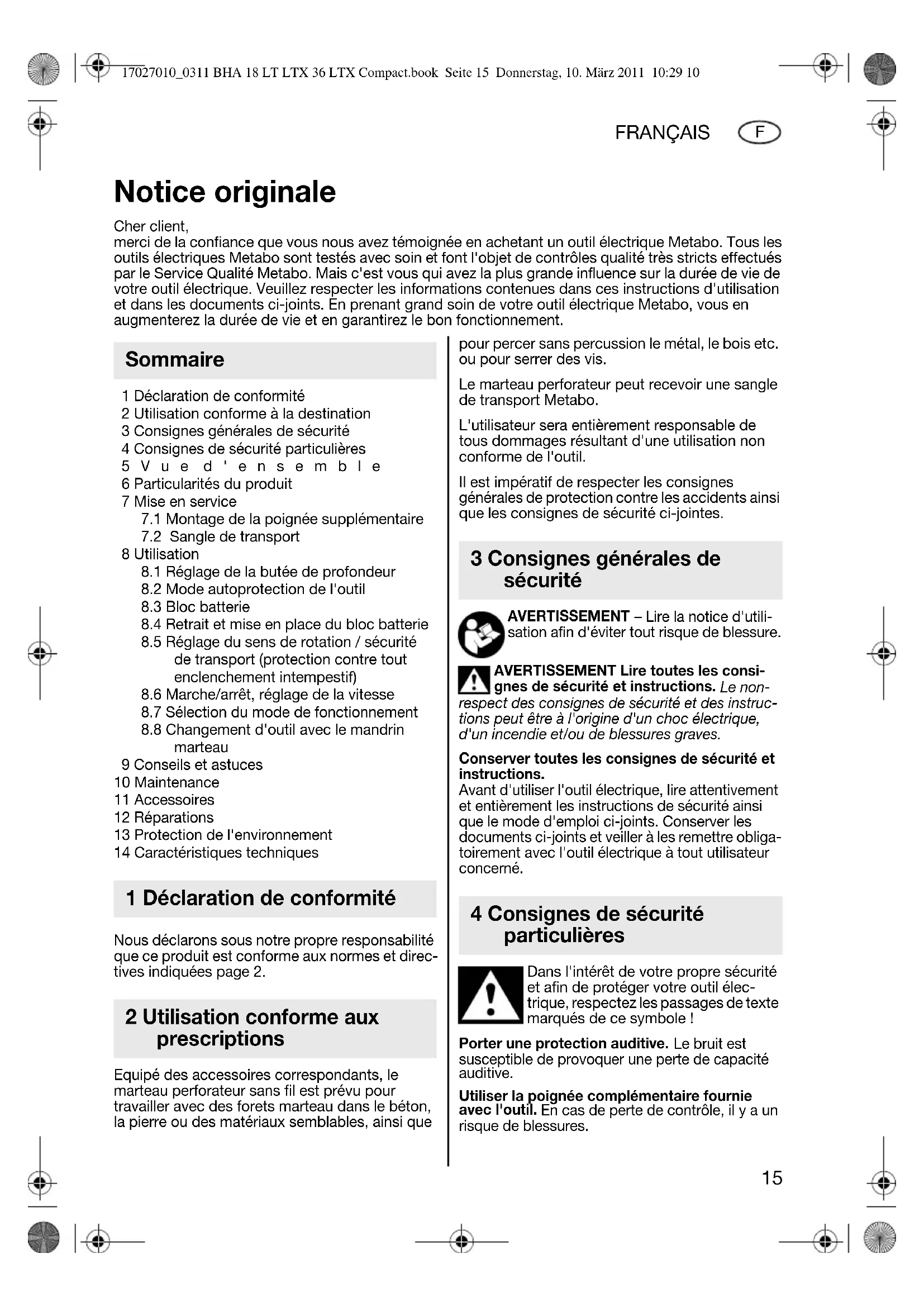 marteau 9 Conseils et astuces 10 Maintenance 11 Accessoires 12 Réparations 13 Protection de l'environnement 14 Caractéristiques techniques Nous déclarons sous notre propre responsabilité que ce produit est conforme aux normes et direc- tives indiquées page 2. Equipé des accessoires correspondants, le marteau perforateur sans fil est prévu pour travailler avec des forets marteau dans le béton, la pierre ou des matériaux semblables, ainsi que pour percer sans percussion le métal, le bois etc. ou pour serrer des vis. Le marteau perforateur peut recevoir une sangle de transport Metabo. L'utilisateur sera entièrement responsable de tous dommages résultant d'une utilisation non conforme de l'outil. Il est impératif de respecter les consignes générales de protection contre les accidents ainsi que les consignes de sécurité ci-jointes. AVERTISSEMENT – Lire la notice d'utili- sation afin d'éviter tout risque de blessure. AVERTISSEMENT Lire toutes les consi- gnes de sécurité et instructions. Le non- respect des consignes de sécurité et des instruc- tions peut être à l'origine d'un choc électrique, d'un incendie et/ou de blessures graves. Conserver toutes les consignes de sécurité et instructions. Avant d'utiliser l'outil électrique, lire attentivement et entièrement les instructions de sécurité ainsi que le mode d'emploi ci-joints. Conserver les documents ci-joints et veiller à les remettre obliga- toirement avec l'outil électrique à tout utilisateur concerné. Dans l'intérêt de votre propre sécurité et afin de protéger votre outil élec- trique, respectez les passages de texte marqués de ce symbole ! Porter une protection auditive. Le bruit est susceptible de provoquer une perte de capacité auditive. Utiliser la poignée complémentaire fournie avec l'outil. En cas de perte de contrôle, il y a un risque de blessures. Notice originale Cher client, merci de la confiance que vous nous avez témoignée en achetant un outil électrique Metabo. Tous les outils électriques Metabo sont testés avec soin et font l'objet de contrôles qualité très stricts effectués par le Service Qualité Metabo. Mais c'est vous qui avez la plus grande influence sur la durée de vie de votre outil électrique. Veuillez respecter les informations contenues dans ces instructions d'utilisation et dans les documents ci-joints. En prenant grand soin de votre outil électrique Metabo, vous en augmenterez la durée de vie et en garantirez le bon fonctionnement. Sommaire 1 Déclaration de conformité 2 Utilisation conforme aux prescriptions 3 Consignes générales de sécurité 4 Consignes de sécurité particulières 17027010_0311 BHA 18 LT LTX 36 LTX Compact.book Seite 15 Donnerstag, 10. März 2011 10:29 1016 FRANÇAIS