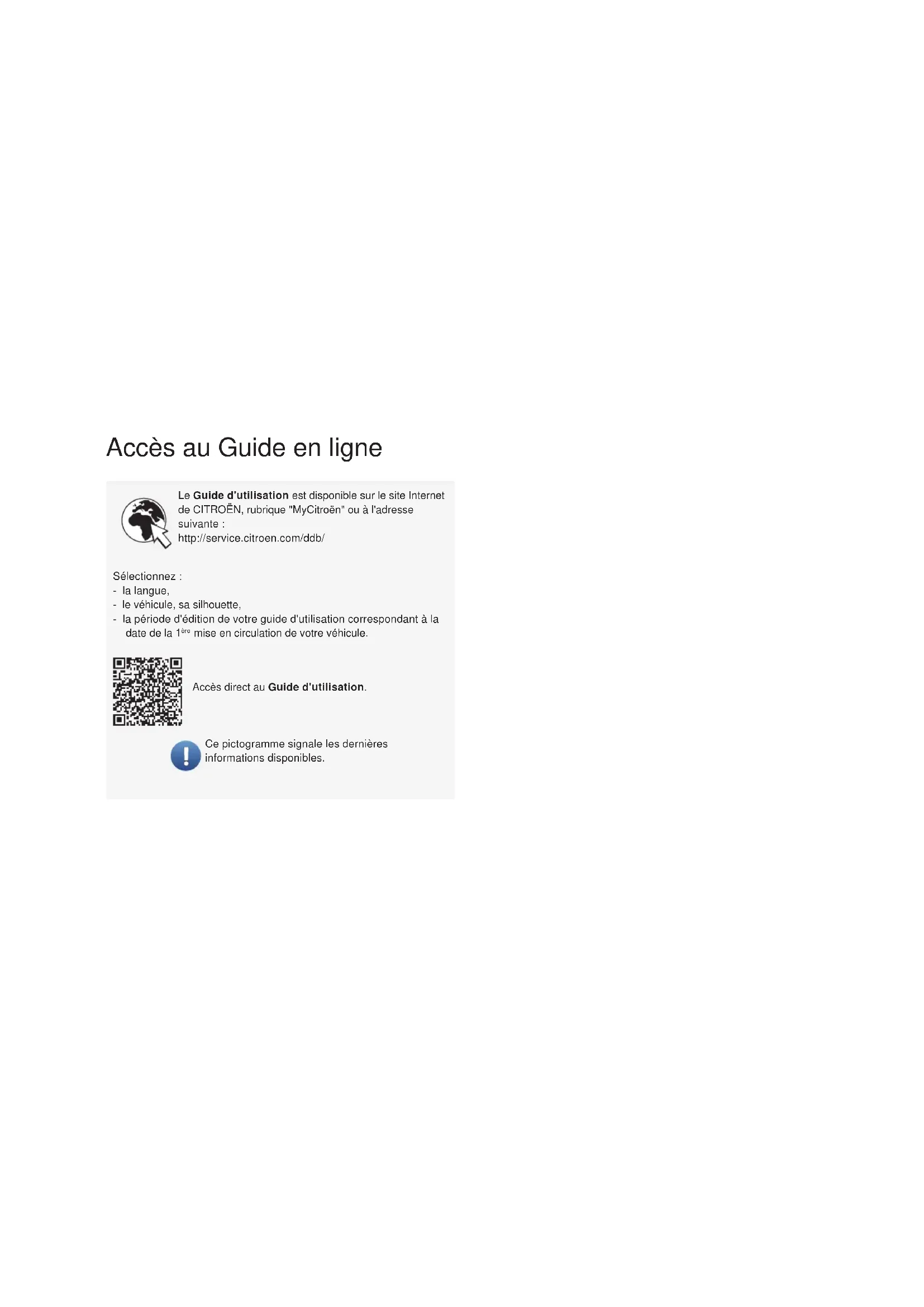 GUIDE D'UTILISATIONAccès au Guide en ligne Le Guide d'utilisation est disponible sur le site Internet de CITROËN, rubrique "MyCitroën" ou à l'adresse suivante : http://service.citroen.com/ddb/ Sélectionnez : - la langue, - le véhicule, sa silhouette, - la période d'édition de votre guide d'utilisation correspondant à la date de la 1 ère mise en circulation de votre véhicule. Ce pictogramme signale les dernières informations disponibles. Accès direct au Guide d'utilisation.Bienvenue Nous vous remercions d'avoir choisi une C3. Ce document présente les informations et recommandations indispensables à la découverte de votre véhicule, en toute sécurité. Votre véhicule reprend une partie des équipements décrits dans ce document, en fonction du niveau de finition, de la version et des caractéristiques propres au pays de commercialisation. Les descriptions et figures sont données sans engagement. Automobiles CITROËN se réserve le droit de modifier les caractéristiques techniques, équipements et accessoires sans être tenue de mettre à jour le présent guide. En cas de cession de votre véhicule, pensez à remettre ce Guide d'utilisation au nouveau propriétaire. Dans ce document, retrouvez l'ensemble des instructions et recommandations de fonctionnement qui permettront de profiter au mieux de votre véhicule. Il est fortement recommandé d'en prendre connaissance ainsi que du carnet d/entretien et de garanties qui vous renseignera sur les garanties, l'entretien et l'assistance routière associés à votre véhicule. Avertissement pour la sécurité Information complémentaire Contribution à la protection de la nature Véhicule avec conduite à gauche Véhicule avec conduite à droite Légende2