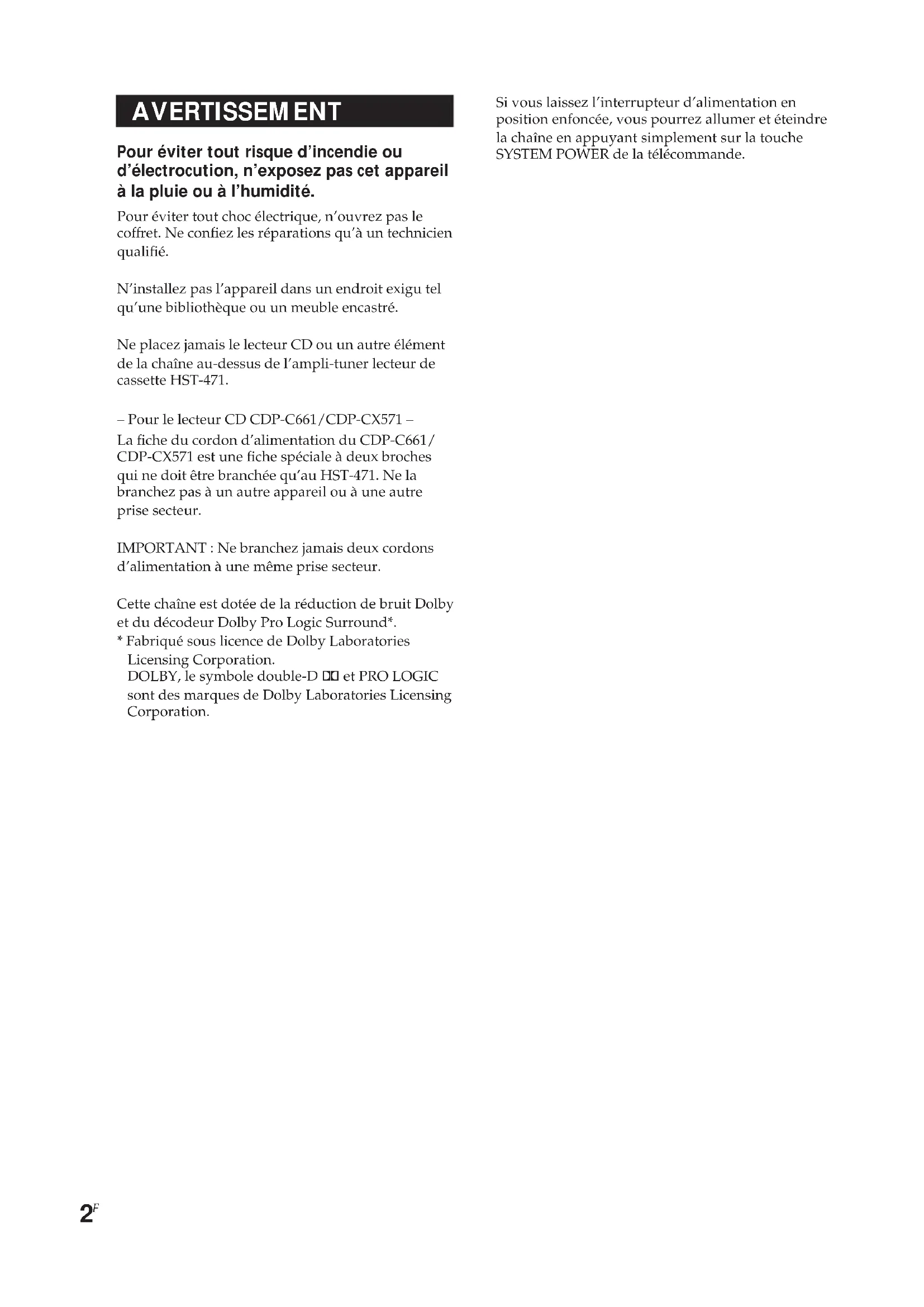 AVERTISSEMENT Pour éviter tout risque d’incendie ou d’électrocution, n’exposez pas cet appareil à la pluie ou à l’humidité. Pour éviter tout choc électrique, n’ouvrez pas le coffret. Ne confiez les réparations qu’à un technicien qualifié. N’installez pas l’appareil dans un endroit exigu tel qu’une bibliothèque ou un meuble encastré. Ne placez jamais le lecteur CD ou un autre élément de la chaîne au-dessus de l’ampli-tuner lecteur de cassette HST-471. – Pour le lecteur CD CDP-C661/CDP-CX571 – La fiche du cordon d’alimentation du CDP-C661/ CDP-CX571 est une fiche spéciale à deux broches qui ne doit être branchée qu’au HST-471. Ne la branchez pas à un autre appareil ou à une autre prise secteur. IMPORTANT : Ne branchez jamais deux cordons d’alimentation à une même prise secteur. Cette chaîne est dotée de la réduction de bruit Dolby et du décodeur Dolby Pro Logic Surround*.