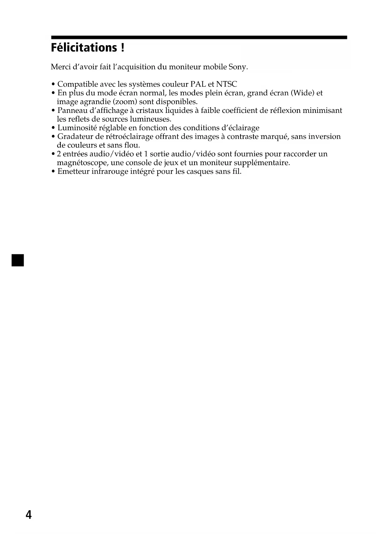 - Die Sicherung ist durchgebrannt. Drücken Sie (VOL)(+) ((VOLUME)(+) am Monitor) oder (ATT). Dies kann auf lokale Störquellen wie Automotoren oder Motorräder zurückgehen. Richten Sie die Antenne so aus, dass die Störungen möglichst gering ausfallen. Das Kabel wurde getrennt. Schließen Sie das Kabel korrekt an. Die Batterie ist möglicherweise erschöpft. Der Schalter FRONT/REAR ist auf „FRONT“ gestellt. Wenn Sie den Monitor auf einem Armaturenbrett verwenden, können Sie beim Fahren nur NAVI als Eingangsquelle verwenden. Schalten Sie das angeschlossene Gerät auf Wiedergabe, wenn das Fahrzeug steht. Nehmen Sie den Monitor aus der Halterung, um die Stromversorgung zu unterbrechen, und drücken Sie die (RESET)-Taste an der Rückseite des Monitors mit einem spitzen Gegenstand wie einem Kugelschreiber (Seite 8).2 Traitement des appareils électriques et électroniques en fin de vie (Applicable dans les pays de l'Union Européenne et aux autres pays européens disposant de systèmes de collecte sélective) Ce symbole, apposé sur le produit ou sur son emballage, indique que ce produit ne doit pas être traité avec les déchets ménagers. Il doit être remis à un point de collecte approprié pour le recyclage des équipements électriques et électroniques. En s'assurant que ce produit est bien mis au rebut de manière appropriée, vous aiderez à prévenir les conséquences négatives potentielles pour l'environnement et la santé humaine. Le recyclage des matériaux aidera à préserver les ressources naturelles. Pour toute information supplémentaire au sujet du recyclage de ce produit, vous pouvez contacter votre municipalité, votre déchetterie ou le magasin où vous avez acheté le produit. Accessoire compatible: Télécommande3 Table des matières Félicitations ! ........................................................................................................................ 4 Précautions .......................................................................................................................... 5 Emplacement des commandes ......................................................................................... 8 Fonctionnement Sélection de la source d’entrée ........................................................................................ 10 Réglage du mode écran.................................................................................................... 11 Activation/désactivation de DIMMER ......................................................................... 12 Modification des réglages du menu............................................................................... 13 Réglage du volume ........................................................................................................... 15 Informations complémentaires Entretien ............................................................................................................................. 16 Caractéristiques techniques............................................................................................. 18 Dépannage ......................................................................................................................... 194 Félicitations ! Merci d’avoir fait l’acquisition du moniteur mobile Sony.