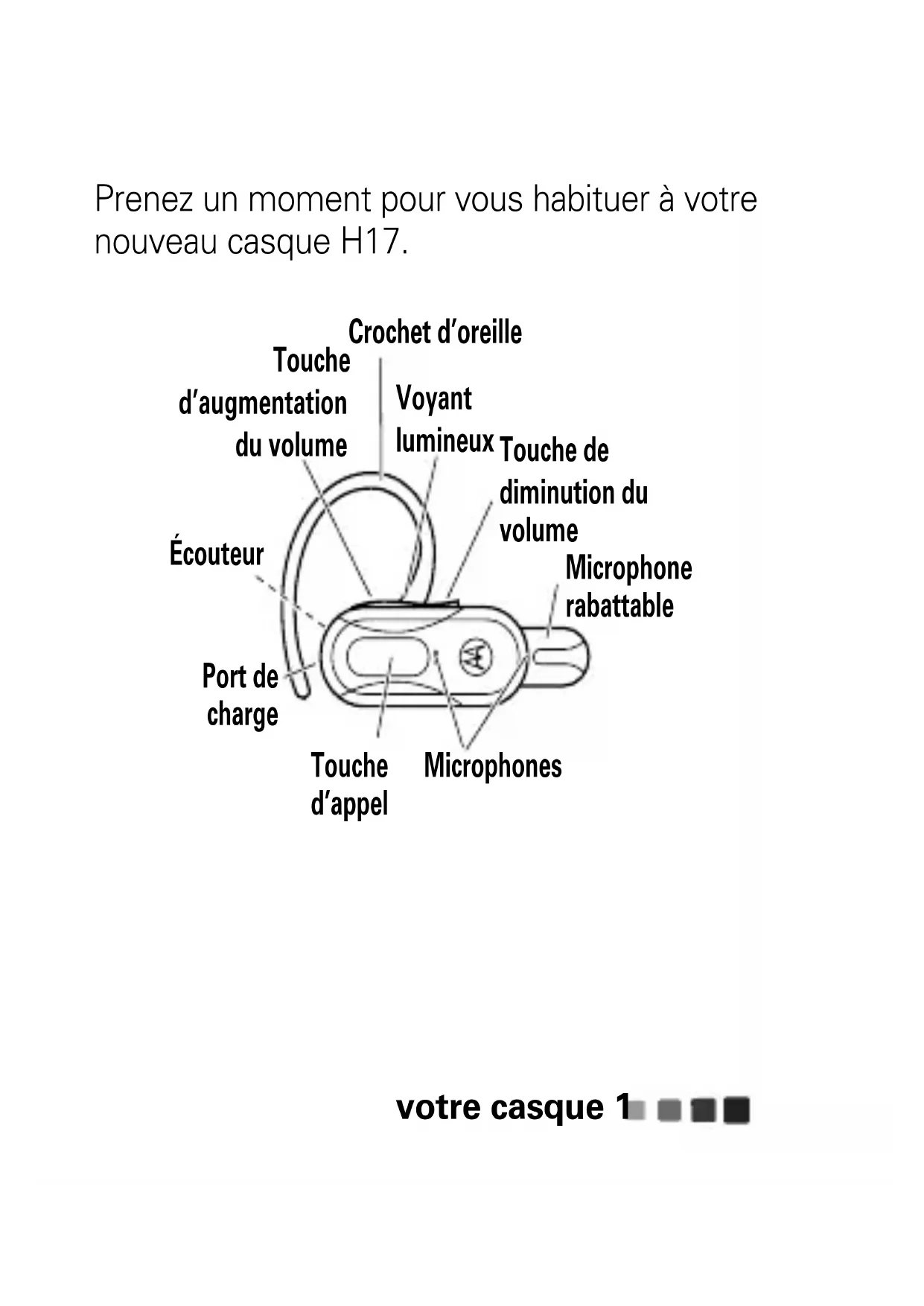 Número de manual: 68000202346-AGuide de Démarrage Rapide motorola H17votre casque 1 votre cas que Prenez un moment pour vous habituer à votre nouveau casque H17. Microphone rabattable Port de charge Touche de diminution du volume Touche d’appel Écouteur Voyant lumineux Microphones Touche d’augmentation du volume Crochet d’oreillecharge du casque2 charge du casque Vous devez charger votre casque avant de l’utiliser. Rabattez le microphone et branchez le chargeur au port de charge de votre casque et sur une prise de courant murale. Le voyant lumineux s’allume en rouge ou en jaune pour indiquer que la batterie est en cours de charge. Ce voyant lumineux devient vert lorsque la batterie est chargée à pleine capacité. Remarque : le casque n’est pas fonctionnel pendant la charge.charge du casque 3 Remarque : la batterie est conçue pour durer aussi longtemps que le produit. Elle ne devrait être retirée que lorsque l’appareil est envoyé à un centre de recyclage. Toute tentative de retrait ou de remplacement de la batterie endommagera le casque.appariement et connexion4 appari ement et co nnexion Vous pouvez apparier et connecter votre casque à un ou plusieurs téléphones dotés de la fonction Bluetooth. apparier et connecter le premier téléphone