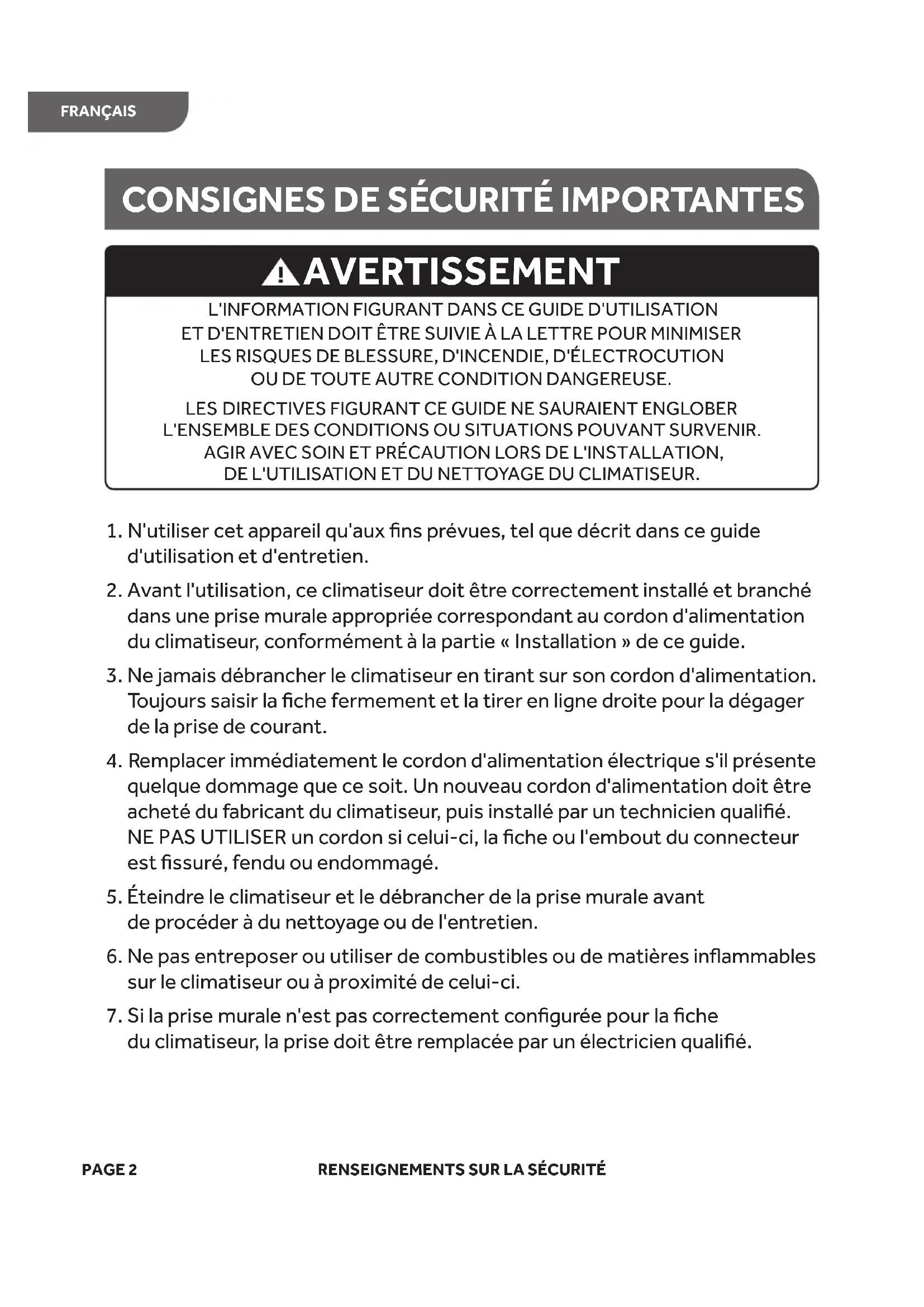 3. eN jamais débrancher le climatiseur en tirant sur son cordon d'alimentation.
