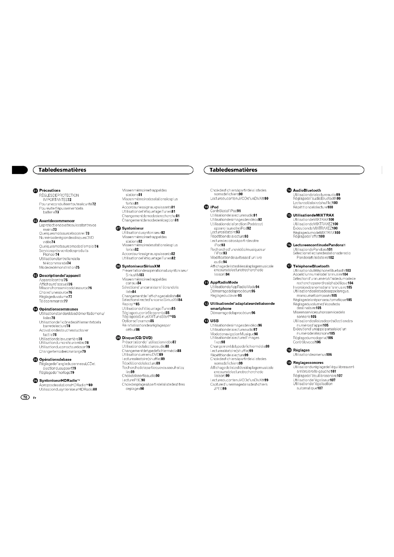 IMPORTANTES 72 Pour une conduite en toute sécurité 72 Pour éviter l’épuisement de la batterie 73 Avant de commencer La protection de votre ouïe est entre vos mains 73 Quelques mots sur cet appareil 73 Numéros de région des disques DVD vidéo 74 Quelques mots sur ce mode d’emploi 74 Service après-vente des produits Pioneer 74 Utilisation et entretien de la télécommande 74 Mode de démonstration 75 Description de l’appareil Appareil central 75 Afficheur d’accueil 76 Mise en/hors service de la source 76 Choix d’une source 76 Réglage du volume 77 Télécommande 77 Opérations communes Utilisation standard des éléments de menu/ listes 78 Utilisation de l’icône de défilement et de la barre de lecture 78 Activation des touches du clavier tactile 78 Utilisation de la vue arrière 78 Utilisation du moniteur arrière 78 Utilisation du correcteur de son 79 Changer le mode écran large 79 Opérations de base Réglage de l’angle du panneau LCD et éjection du support 79 Réglage de l’horloge 79 Syntoniseur HD Radioä À propos des stations HD Radioä 80 Utilisation du syntoniseur HD Radio 80 Mise en mémoire et rappel des stations 81 Mise en mémoire des stations les plus fortes 81 Accord sur les signaux puissants 81 Utilisation de l’étiquetage iTunes 81 Changement de mode de recherche 81 Changement de mode de réception 81 Syntoniseur Utilisation du syntoniseur 82 Mise en mémoire et rappel des stations 82 Mise en mémoire des stations les plus fortes 82 Accord sur les signaux puissants 82 Utilisation de l’étiquetage iTunes 82 Syntoniseur SiriusXM Présentation des opérations du syntoniseur SiriusXM 83 Mise en mémoire et rappel des canaux 84 Sélection d’un canal dans l’écran de la liste 84 Changement de l’affichage de la liste 84 Sélection directe d’un canal SiriusXM 84 Replayä 85 Utilisation de l’étiquetage iTunes 85 Réglage du contrôle parental 85 Réglage de SiriusXM TuneStartä 85 Options d’examen 85 Réinitialisation des réglages par défaut 86 Disque (CD/DVD) Présentation de l’utilisation vidéo 87 Utilisation de la lecture audio 88 Changement de type de fichier média 88 Utilisation du menu DVD 89 Lecture aléatoire (shuffle) 89 Répétition de la lecture 89 Recherche de la partie que vous souhaitez lire 89 Choix de la sortie audio 90 Lecture PBC 90 Choix des plages à partir de la liste des titres de plages 90 Choix des fichiers à partir de la liste des noms de fichiers 90 Lecture du contenu VOD d’un DivXâ 90 iPod Contrôle de l’iPod 91 Utilisation de la lecture audio 91 Utilisation des images de vidéos 92 Utilisation de la fonction iPod de cet appareil sur votre iPod 92 Lecture aléatoire 93 Répétition de la lecture 93 Lecture de vidéos à partir de votre iPod 93 Recherche d’une vidéo/musique sur l’iPod 93 Modification de la vitesse d’un livre audio 94 Affichage de listes liées à la plage musicale en cours de lecture (recherche de liaison) 94 AppRadio Mode Utilisation de AppRadio Mode 94 Démarrage de la procédure 95 Réglage du clavier 95 Utilisation de l’adaptateur de liaison de smartphone Démarrage de la procédure 96 USB Utilisation des images de vidéos 96 Utilisation de la lecture audio 97 Mode de navigation Musique 98 Utilisation de la lecture d’images fixes 98 Changement de type de fichier média 99 Lecture aléatoire (shuffle) 99 Répétition de la lecture 99 Choix des fichiers à partir de la liste des noms de fichiers 99 Affichage de listes liées à la plage musicale en cours de lecture (recherche de liaison) 99 Lecture du contenu VOD d’un DivXâ 99 Capture d’une image dans des fichiers JPEG 99 Audio Bluetooth Utilisation de la lecture audio 99 Réglage de l’audio Bluetooth 99 Lecture aléatoire (shuffle) 100 Répétition de la lecture 100 Utilisation de MIXTRAX Utilisation de MIXTRAX 100 Utilisation de MIXTRAX EZ 100 Exécution de MIXTRAX EZ 100 Réglage du mode MIXTRAX 100 Réglage de l’effet 100 Lecture en continu de Pandoraâ Utilisation de Pandora 101 Sélection et lecture de stations de radio Pandoraâ/aléatoire 102 Téléphone Bluetooth Utilisation du téléphone Bluetooth 103 Appel d’un numéro de l’annuaire 104 Sélection d’un numéro à l’aide du mode de recherche par ordre alphabétique 104 Inversion des noms dans l’annuaire 105 Utilisation des listes des appels reçus, manqués et composés 105 Réglage de la réponse automatique 105 Réglage du volume d’écoute du destinataire 105 Mise en service ou hors service de la sonnerie 105 Utilisation des listes de présélection des numéros d’appel 105 Exécution d’un appel par saisie d’un numéro de téléphone 105 Réglage du mode privé 106 Contrôle vocal 106 Réglages Utilisation des menus 106 Réglages sonores Utilisation du réglage de l’équilibre avant- arrière/droite-gauche 107 Réglage de l’équilibre sonore 107 Utilisation de l’égaliseur 107 Utilisation de l’égalisation automatique 107 Table des matières