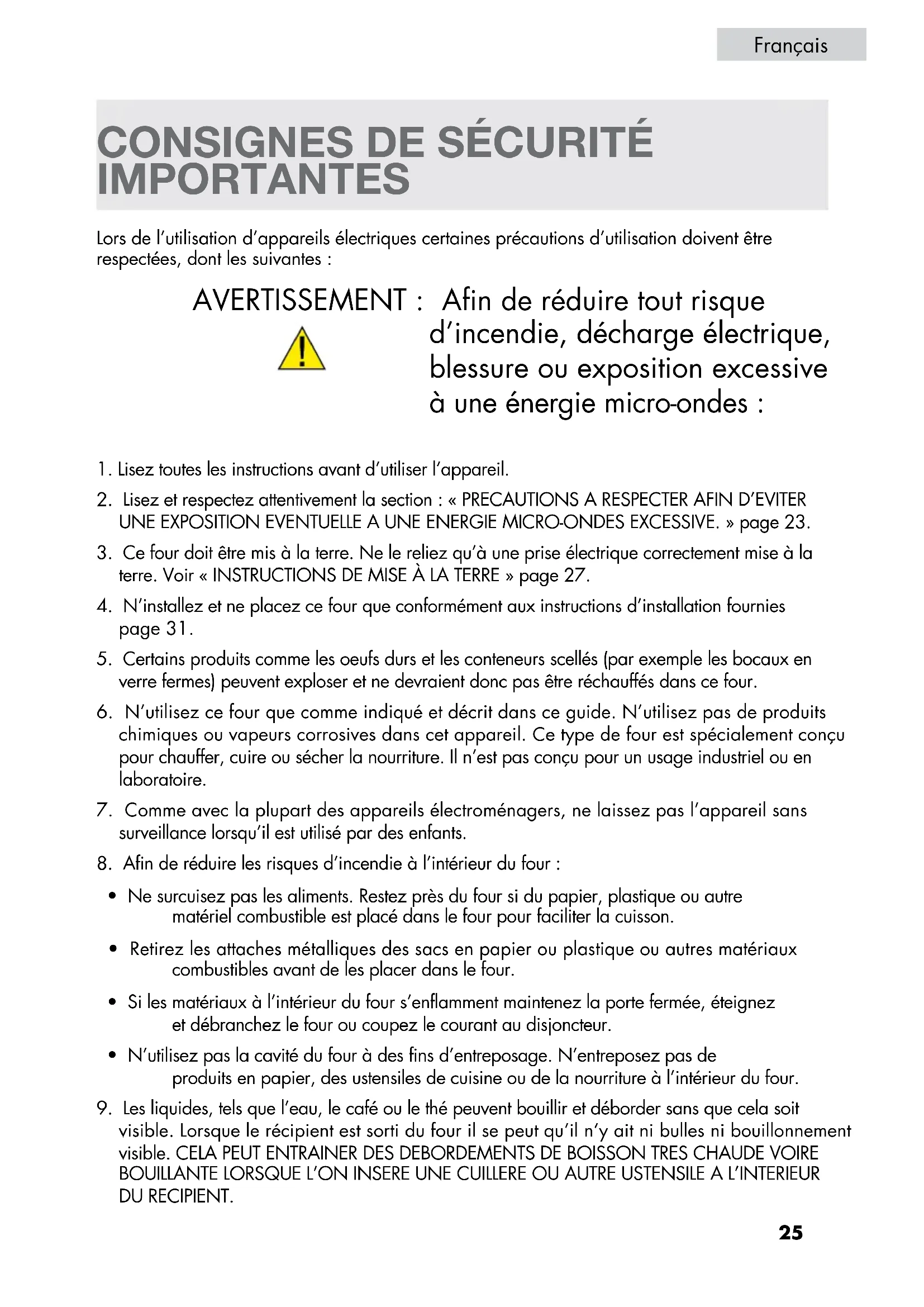d’incendie, décharge électrique, blessure ou exposition excessive à une énergie micro-ondes :