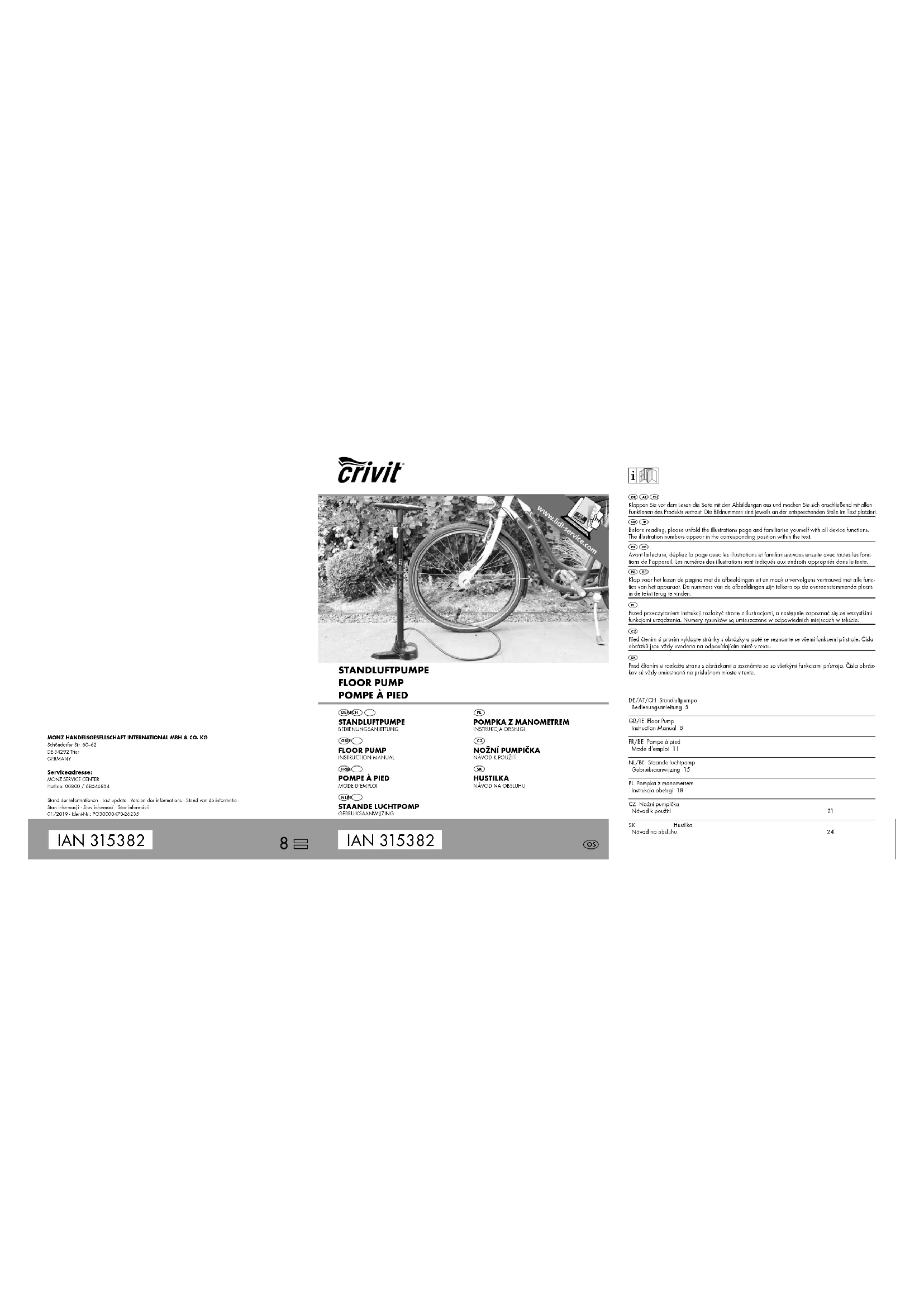 - Serviceadressen Inleiding Van harte gefeliciteerd! Met uw aankoop heeft u gekozen voor een kwalitatief hoogwaardig product. Voordat u het product gaat gebruiken, maak u zich eerst vertrouwd met het product. Lees zorgvuldig onderstaande gebruiksaanwijzing. Gebruik het product alleen zoals beschreven en alleen voor de aangegeven toepassingsgebieden. Deze gebruiksaanwijzing goed bewaren. Indien u dit product aan een derde geeft, zorg er dan voor dat u alle documenten ook overhandigt.Tekens in deze gebruiks- en montage-handleiding en op de verpakking: Dit symbool waarschuwt voor letselge-vaar. Zo wordt de aanvullende informatie gekenmerkt. Dit teken biedt informatie over het afvoe-ren van zowel de verpakking als het product. Correct gebruik:Deze Staande luchtpomp is geschikt voor het oppompen van alle courante fietswielen. Ander-soortig gebruik of wijziging aan het product gel-den als niet correct en kunnen risico‘s als letsels een beschadigingen met zich meebrengen. Voor schade die het gevolg is van niet correct gebruik is de distributeur niet aansprakelijk. Het product is niet bedoeld voor commercieel gebruik. Pakket: (A1 / A2) 1 x Staande luchtpomp1 x metalen adapter voor ballen,2 x kunststof adapter voor luchtmatrassen, opblaasbaar speelgoed enz.1 x Gebruiksaanwijzing Technische gegevens: Type: Staande luchtpompIAN 315382 Artikel-/Monz-Nr.: 26235Project: PO30000470Nominale druk: 7 bar / 100 PSIToelaatbare maximale druk: 8 bar / 116 PSIHefvolume: 370 ml / 370 cm³Lengte drukslang: 100 cmProductiedatum: 2019Garantie: 3 jaar p. 17