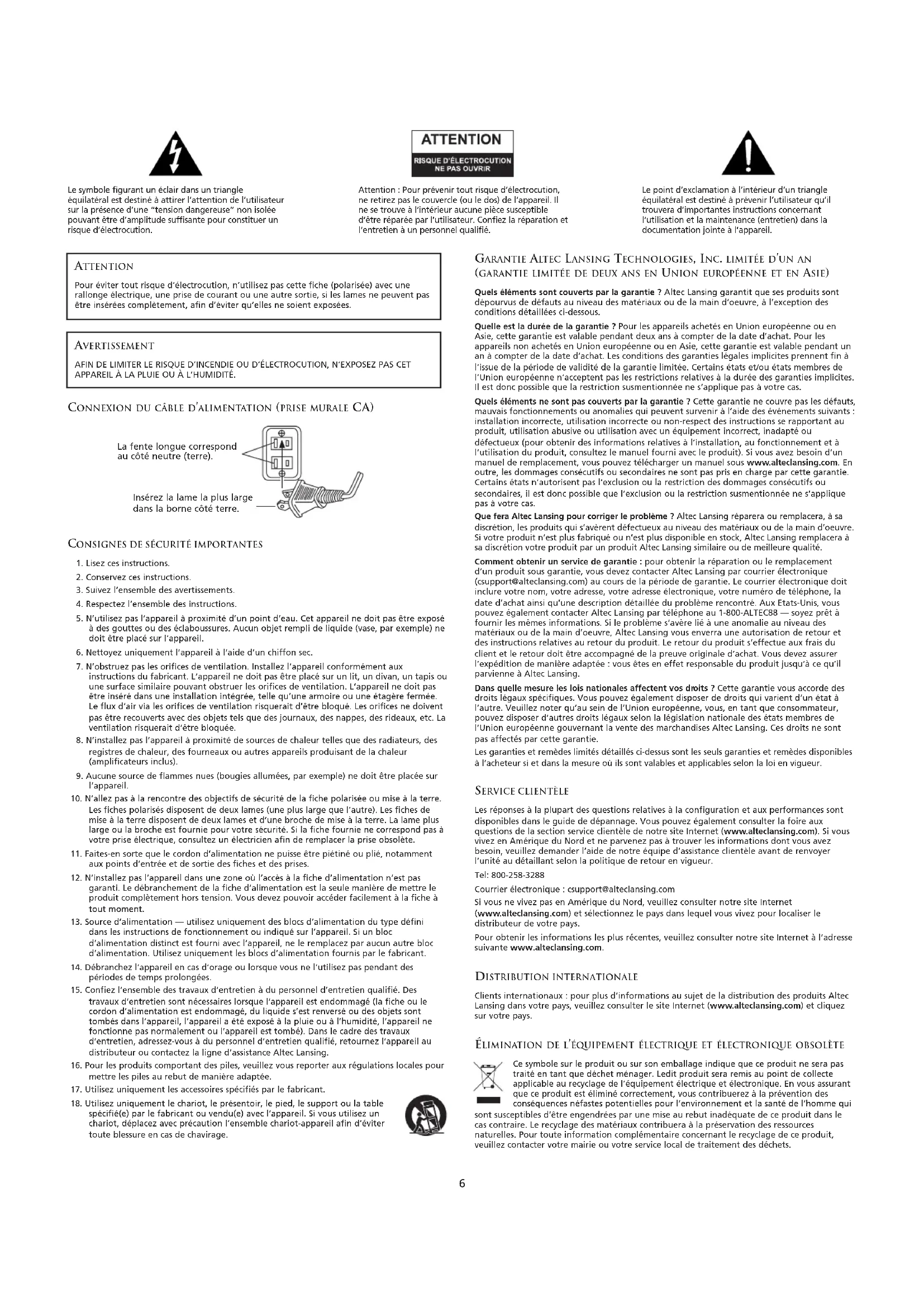 Les réponses à la plupart des questions relatives à la configuration et aux performances sont disponibles dans le guide de dépannage. Vous pouvez également consulter la foire aux questions de la section service clientèle de notre site Internet (www.alteclansing.com). Si vous vivez en Amérique du Nord et ne parvenez pas à trouver les informations dont vous avez besoin, veuillez demander l’aide de notre équipe d’assistance clientèle avant de renvoyer l’unité au détaillant selon la politique de retour en vigueur. Tel: 800-258-3288 Courrier électronique : csupport@alteclansing.com Si vous ne vivez pas en Amérique du Nord, veuillez consulter notre site Internet (www.alteclansing.com) et sélectionnez le pays dans lequel vous vivez pour localiser le distributeur de votre pays. Pour obtenir les informations les plus récentes, veuillez consulter notre site Internet à l’adresse suivante www.alteclansing.com. DISTRIBUTION INTERNATIONALE Clients internationaux : pour plus d’informations au sujet de la distribution des produits Altec Lansing dans votre pays, veuillez consulter le site Internet (www.alteclansing.com) et cliquez sur votre pays. ÉLIMINATION DE L’ÉQUIPEMENT ÉLECTRIQUE ET ÉLECTRONIQUE OBSOLÈTE Ce symbole sur le produit ou sur son emballage indique que ce produit ne sera pas traité en tant que déchet ménager. Ledit produit sera remis au point de collecte applicable au recyclage de l’équipement électrique et électronique. En vous assurant que ce produit est éliminé correctement, vous contribuerez à la prévention des conséquences néfastes potentielles pour l’environnement et la santé de l’homme qui sont susceptibles d’être engendrées par une mise au rebut inadéquate de ce produit dans le cas contraire. Le recyclage des matériaux contribuera à la préservation des ressources naturelles. Pour toute information complémentaire concernant le recyclage de ce produit, veuillez contacter votre mairie ou votre service local de traitement des déchets. ATTENTION Pour éviter tout risque d’électrocution, n’utilisez pas cette fiche (polarisée) avec une rallonge électrique, une prise de courant ou une autre sortie, si les lames ne peuvent pas être insérées complètement, afin d’éviter qu’elles ne soient exposées. AVERTISSEMENT AFIN DE LIMITER LE RISQUE D’INCENDIE OU D’ÉLECTROCUTION, N’EXPOSEZ PAS CET APPAREIL À LA PLUIE OU À L’HUMIDITÉ. La fente longue correspond au côté neutre (terre). Insérez la lame la plus large dans la borne côté terre.7 Merci d’avoir acheté ce produit Altec Lansing. Depuis des générations, Altec Lansing est le pionnier de l’innovation audio. Aujourd’hui, notre gamme d’enceintes amplifiées est celle qui a reçu le plus de récompenses en matière de performances. Dans tous les types d’environnement, dans toutes les gammes de prix, Altec Lansing offre un son remarquable et donne satisfaction aux clients les plus exigeants en leur offrant l’expérience audio plaisante qu’ils recherchent. Écoutez ça! Contenu de l’emballage