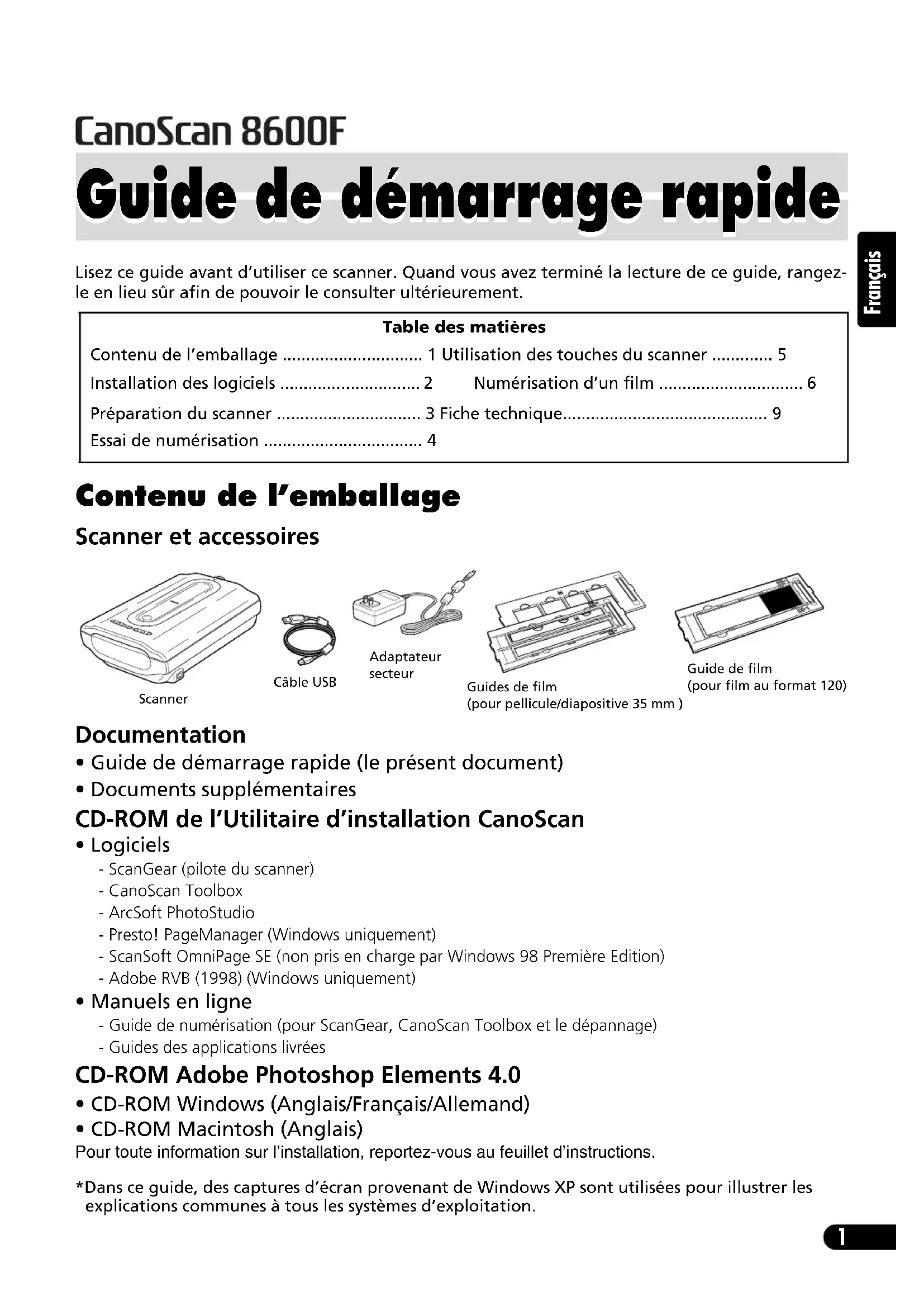 - CD-ROM Macintosh (Anglais) Pour toute information sur l’installation, reportez-vous au feuillet d’instructions. *Dans ce guide, des captures d’écran provenant de Windows XP sont utilisées pour illustrer les explications communes à tous les systèmes d’exploitation. Table des matières Contenu de l’emballage .............................. 1 Utilisation des touches du scanner ............. 5 Installation des logiciels .............................. 2 Numérisation d’un film ............................... 6 Préparation du scanner ............................... 3 Fiche technique............................................ 9 Essai de numérisation .................................. 4 Guide de démarrage rapide Guide de démarrage rapide ScannerCâble USBGuides de film(pour pellicule/diapositive 35 mm )Adaptateur secteurGuide de film(pour film au format 120)Installation des logiciels