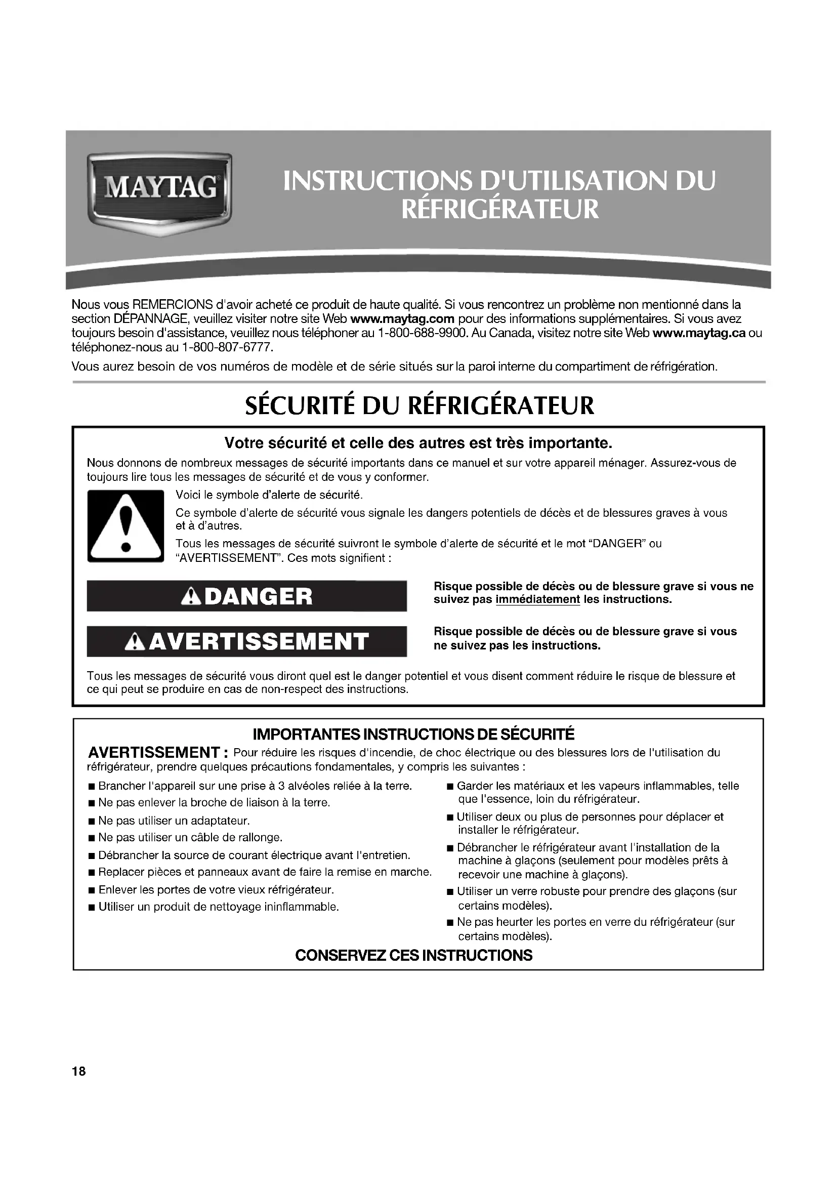 CLAUSE D'EXONÉRATION DE RESPONSABILITÉ AU TITRE DES GARANTIES IMPLICITES LES GARANTIES IMPLICITES, Y COMPRIS LES GARANTIES APPLICABLES DE QUALITÉ MARCHANDE OU D'APTITUDE À UN USAGE PARTICULIER, SONT LIMITÉES À UN AN OU À LA PLUS COURTE PÉRIODE AUTORISÉE PAR LA LOI. Certains États et provinces ne permettent pas de limitation sur la durée d’une garantie implicite de qualité marchande ou d'aptitude à un usage particulier, de sorte que la limitation ci-dessus peut ne pas être applicable dans votre cas. Cette garantie vous confère des droits juridiques spécifiques, et vous pouvez également jouir d’autres droits qui peuvent varier d’une juridiction à l'autre. LIMITATION DES RECOURS; EXCLUSION DES DOMMAGES FORTUITS OU INDIRECTS LE SEUL ET EXCLUSIF RECOURS DU CLIENT DANS LE CADRE DE LA PRÉSENTE GARANTIE LIMITÉE CONSISTE EN LA RÉPARATION PRÉVUE CI-DESSUS. MAYTAG N’ASSUME AUCUNE RESPONSABILITÉ POUR LES DOMMAGES FORTUITS OU INDIRECTS. Certains États et certaines provinces ne permettent pas l’exclusion ou la limitation des dommages fortuits ou indirects, de sorte que ces limitations et exclusions peuvent ne pas être applicables dans votre cas. Cette garantie vous confère des droits juridiques spécifiques, et vous pouvez également jouir d’autres droits qui peuvent varier d’une juridiction à l'autre. Si vous résidez à l'extérieur des 50 États des États-Unis et du Canada, contactez votre marchand Maytag autorisé pour déterminer si une autre garantie s'applique. 6/0835 Pour des informations supplémentaires sur le produit, aux É.-U., visiter www.maytag.com. Au Canada, visiter www.maytag.ca. Si vous n’avez pas accès à Internet et que vous nécessitez une assistance pendant l’utilisation du produit ou que vous souhaitez prendre un rendez-vous, vous pouvez contacter Maytag au numéro ci-dessous. Ayez votre numéro de modèle à disposition. Vous pouvez trouver vos numéros de modèle et de série sur la plaque située sur la paroi interne du compartiment de réfrigération. Pour assistance ou service aux É.-U., composez le 1-800-688-9900. Au Canada, composez le 1-800-807-6777. Si vous avez besoin de plus d’assistance, vous pouvez écrire à Maytag en soumettant toute question ou problème à l’adresse suivante : Aux États-Unis : Maytag Brand Home Appliances Customer eXperience Center 553 Benson Road Benton Harbor, MI 49022-2692 Au Canada : Maytag Brand Home Appliances Centre d'eXpérience à la clientèle 200 – 6750 Century Ave. Mississauga, Ontario L5N 0B7 Dans votre correspondance, veuillez indiquer un numéro de téléphone où l’on peut vous joindre dans la journée. Veuillez conserver le manuel de l’utilisateur et le numéro de modèle pour référence ultérieure.W10321476A SP PN W10321477A