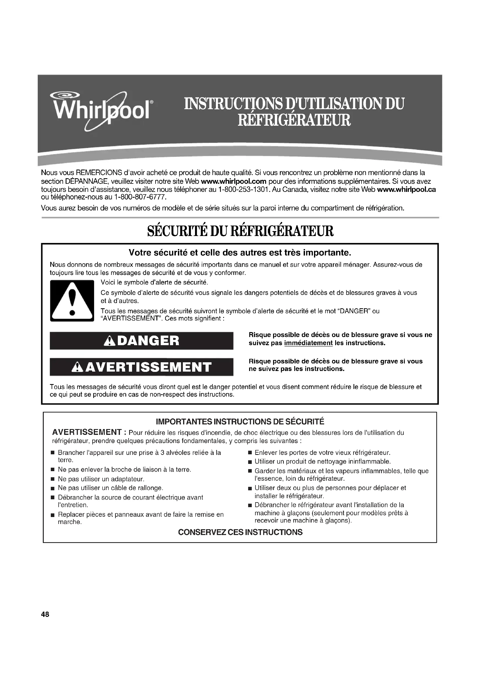 avant dans le compartiment en le poussant ensuite vers le haut jusqu'à ce qu'il s'emboîte. 5. Brancher le réfrigérateur ou reconnecter la source de courant électrique.Éclairage du compartiment de congélation (sur certains modèles)1. Débrancher le réfrigérateur ou déconnecter la source de courant électrique.2. Retirer le protège-ampoule (sur certains modèles). ■ Sommet du compartiment de congélation - Faire glisser le protège-ampoule vers l'arrière du compartiment pour le libérer de l'ensemble d'éclairage. 3. Remplacer l’ampoule grillée par une ampoule pour appareil électroménager de 25 watts maximum.4. Réinstaller le protège-ampoule.5. Brancher le réfrigérateur ou reconnecter la source de courant électrique. DÉPANNAGE Essayer d’abord les solutions suggérées ici ou visiter notre site Internet et la FAQ (foire aux questions) pour éviter le coût d’un appel de service. Aux É.-U., www.whirlpool.com Au Canada, www.whirlpool.ca Fonctionnement du réfrigérateur Le réfrigérateur ne fonctionne pas ■ Le cordon d'alimentation électrique est-il débranché? Brancher sur une prise à 3 alvéoles reliée à la terre. ■ La prise électrique fonctionne-t-elle? Brancher une lampe pour voir si la prise fonctionne.■ Un fusible est-il grillé ou un disjoncteur s'est-il déclenché? Remplacer le fusible ou réarmer le disjoncteur. Si le problème persiste, appeler un électricien. ■ Les commandes sont-elles sur ON (marche)? S'assurer que les commandes du réfrigérateur sont sur ON (marche). Voir “Utilisation de la(des) commande(s)”. ■ S'agit-il d'une nouvelle installation? Accorder 24 heures après l'installation pour que le réfrigérateur se refroidisse complètement. REMARQUE : Mettre les commandes de la température sur la position la plus froide ne refroidira aucun des compartiments plus rapidement.Le moteur semble trop tourner Il se peut que votre nouveau réfrigérateur fonctionne plus longtemps que l'ancien grâce à son compresseur à haute efficacité et ses ventilateurs. L'appareil peut fonctionner plus longtemps encore si la température de la pièce est chaude, si une importante quantité de nourriture y est ajoutée, si les portes sont fréquemment ouvertes ou si elles ont été laissées ouvertes. AVERTISSEMENT Risque de choc électrique Brancher sur une prise à 3 alvéoles reliée à la terre. Ne pas enlever la broche de liaison à la terre. Ne pas utiliser un adaptateur. Ne pas utiliser un câble de rallonge. Le non-respect de ces instructions peut causer un décès, un incendie ou un choc électrique.66 Le réfrigérateur semble bruyant Le bruit des réfrigérateurs a été réduit au cours des années. Du fait de cette réduction, il est possible d'entendre des bruits intermittents venant de votre nouveau réfrigérateur qui n'avaient pas été décelés avec votre ancien modèle. Voici une liste des sons normaux accompagnés d'explications. ■ Bourdonnement - entendu lorsque le robinet d'arrivée d'eau s'ouvre pour remplir la machine à glaçons ■ Pulsation - les ventilateurs/le compresseur se règlent afin d'optimiser la performance ■ Sifflement/cliquetis - écoulement de liquide réfrigérant, mouvement des conduites d'eau ou d'objets posés sur le dessus du réfrigérateur ■ Grésillement/gargouillement - de l'eau tombe sur l'élément de chauffage durant le programme de dégivrage ■ Bruit d'éclatement - contraction/expansion des parois internes, particulièrement lors du refroidissement initial ■ Bruit d'écoulement d'eau - peut être entendu lorsque la glace fond lors du programme de dégivrage et que l'eau s'écoule dans le plateau de dégivrage ■ Grincement/craquement - se produit lorsque la glace est éjectée du moule à glaçons. Les portes ne ferment pas complètement ■ La porte est-elle bloquée en position ouverte? Déplacer les emballages d'aliments pour libérer la porte. ■ Un compartiment ou une tablette bloquent-ils le passage? Replacer le compartiment ou la tablette en position correcte. Les portes sont difficiles à ouvrir ■ Les joints d'étanchéité sont-ils sales ou collants? Nettoyer les joints et les surfaces de contact au savon doux et à l'eau tiède. Rincer et sécher avec un linge doux. Les ampoules ne fonctionnent pas ■ Une ampoule est-elle desserrée dans la douille ou grillée? Voir “Remplacement des ampoules d'éclairage”. ■ La lumière du distributeur est-elle réglée à OFF (arrêt)? Sur certains modèles, la lumière du distributeur ne fonctionne que si l’on appuie sur un levier/la plaque du distributeur. Si on désire que la lumière du distributeur reste allumée en permanence, régler la lumière du distributeur à ON (allumée). Voir “Distributeur d'eau”. Température et humidité La température est trop élevée ■ S'agit-il d'une nouvelle installation? Accorder 24 heures après l'installation pour que le réfrigérateur se refroidisse complètement. ■ La/Les porte(s) est/sont-elle(s) fréquemment ouverte(s) ou laissée(s) ouverte(s)? Ceci permet à l'air chaud de pénétrer dans le réfrigérateur. Minimiser les ouvertures de porte et garder les portes complètement fermées. ■ Une importante quantité d'aliments a-t-elle été ajoutée? Accorder quelques heures pour que le réfrigérateur revienne à sa température normale. ■ Les réglages sont-ils corrects pour les conditions existantes? Ajuster les commandes un cran plus froid. Vérifier la température au bout de 24 heures. Voir “Utilisation de la(des) commande(s)”. Il y a une accumulation d'humidité à l'intérieur REMARQUE : Une certaine accumulation d'humidité est normale. ■ La pièce est-elle humide? Ceci contribue à l'accumulation de l'humidité. ■ La/Les porte(s) est/sont-elle(s) fréquemment ouverte(s) ou laissée(s) ouverte(s)? Ceci permet à l'air humide de pénétrer dans le réfrigérateur. Minimiser les ouvertures de porte et garder les portes complètement fermées. G