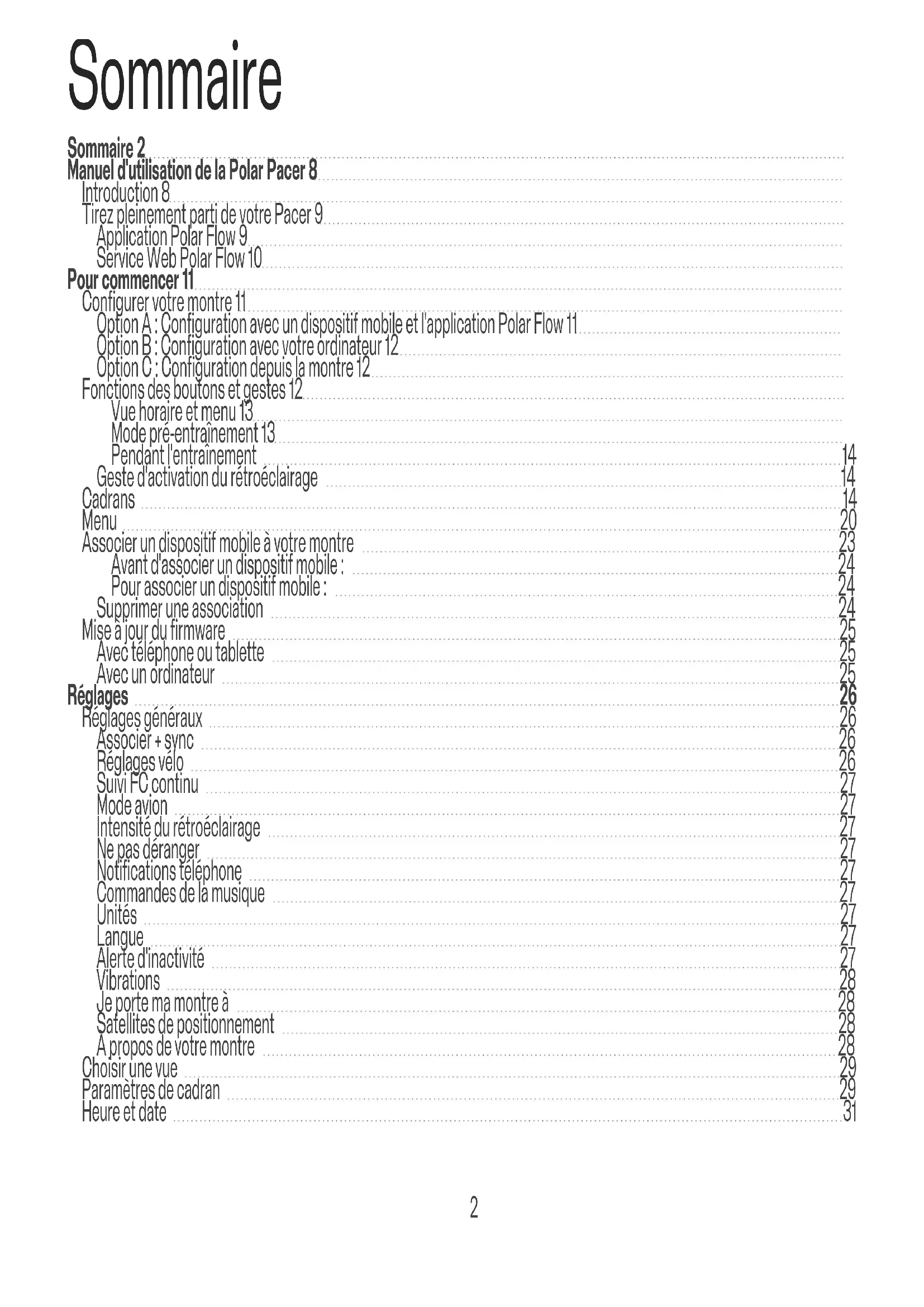 MANUEL D'UTILISATION2 Sommaire Sommaire 2 Manuel d'utilisation de la Polar Pacer 8 Introduction 8 Tirez pleinement parti de votre Pacer 9 Application Polar Flow 9 Service Web Polar Flow 10 Pour commencer 11 Configurer votre montre 11 OptionA: Configuration avec un dispositif mobile et l'application Polar Flow 11 OptionB: Configuration avec votre ordinateur 12 OptionC: Configuration depuis la montre 12 Fonctions des boutons et gestes 12 Vue horaire et menu 13 Mode pré-entraînement 13 Pendant l'entraînement 14 Geste d'activation du rétroéclairage 14 Cadrans 14 Menu 20 Associer un dispositif mobile à votre montre 23 Avant d'associer un dispositif mobile: 24 Pour associer un dispositif mobile: 24 Supprimer une association 24 Mise à jour du firmware 25 Avec téléphone ou tablette 25 Avec un ordinateur 25 Réglages 26 Réglages généraux 26 Associer + sync 26 Réglages vélo 26 Suivi FC continu 27 Mode avion 27 Intensité du rétroéclairage 27 Ne pas déranger 27 Notifications téléphone 27 Commandes de la musique 27 Unités 27 Langue 27 Alerte d'inactivité 27 Vibrations 28 Je porte ma montre à 28 Satellites de positionnement 28 À propos de votre montre 28 Choisir une vue 29 Paramètres de cadran 29 Heure et date 313 Heure 31 Date 31 Format de la date 31 Premier jour de la semaine 32 Réglages physiques 32 Poids 32 Taille 32 Date de naissance 32 Sexe 32 Historique d'entraînement 32 Objectif d'activité 33 Temps de sommeil préféré 33 Fréquence cardiaque maximale 34 Fréquence cardiaque au repos 34 VO2max 34 Icônes à l'écran 34 Redémarrage et réinitialisation 35 Pour redémarrer la montre 35 Pour rétablir la configuration d'usine de la montre 35 Rétablir la configuration d’usine via FlowSync 35 Rétablir la configuration d’usine depuis la montre 35 Entraînement 37 Mesure de la fréquence cardiaque au poignet 37 Mettre en place votre montre lors de la mesure de la fréquence cardiaque au poignet ou du suivi de votre sommeil 37 Mettre en place votre montre en l'absence de mesure de la fréquence cardiaque au poignet ou de suivi de votre som- meil/Nightly Recharge 38 Démarrer une séance d'entraînement 38 Démarrer une séance d'entraînement planifiée 39 Démarrer une session d'entraînement multisport 40 Menu rapide 40 Pendant l'entraînement 43 Parcourir les vues d'entraînement 43 Régler les chronos 44 Temps de l'intervalle 45 Compte à rebours 45 Verrouiller une zone de fréquence cardiaque, une zone de vitesse ou une zone de puissance 46 Verrouiller une zone de fréquence cardiaque 46 Verrouiller une zone de vitesse/allure 46 Verrouiller une zone de puissance 47 Marquer un tour 47 Changer de sport pendant une séance d'entraînement multisport 47 S'entraîner avec un objectif 47 Changer de phase pendant une séance d'entraînement par phases 48 Consulter les informations relatives à l'objectif d'entraînement 48 Notifications 48 Mettre en pause/arrêter une séance d'entraînement 48 Résumé de l'entraînement 48 Après l'entraînement 48 Données d'entraînement dans l'application Polar Flow 514 Données d'entraînement sur le service Web Polar Flow 51 Fonctions 52 Smart Coaching 52 Training Load Pro 52 Charge cardiaque 53 Charge ressentie 53 Charge musculaire (via capteur de puissance tiers) 53 Charge d'entraînement d'une séance d'entraînement individuelle 53 Fatigue et tolérance 54 Statut de charge cardiaque 54 Statut de charge cardiaque sur votre montre 55 Analyse à long terme dans l'application et sur le service Web Flow 55 FuelWise™ 57 S'entraîner avec FuelWise 58 Rappel glucides automatique 58 Rappel glucides manuel 59 Rappel hydratation 59 Test de performance de course à pied 61 Exécution du test 61 Résultats du test 62 Analyse détaillée dans le service Web Flow et l’application 64 Test de marche 65 Exécution du test 65 Résultats du test 66 Analyse détaillée dans le service Web Flow et l’application 67 Programme de course à pied Polar 67 Créer un programme de course Polar 68 Démarrer un objectif de course à pied 68 Suivre votre progression 68 Running Index 68 Analyse à court terme 69 Analyse à long terme 70 Bénéfice de l'entraînement 71 Compteur personnalisé de calories 72 Suivi de la fréquence cardiaque continu 73 Suivi de la fréquence cardiaque continu sur votre montre 73 Suivi permanent de l'activité 75 Objectif d'activité 75 Données d'activité sur votre montre 75 Alerte d'inactivité 76 Données d'activité dans l'application et sur le service Web Polar Flow 76 Guide d'activité 77 Bénéfices de l'activité 77 Mesure de la récupération Nightly Recharge™ 78 Détails du statut SNA dans l'application Polar Flow 80 Détails du statut du sommeil dans Polar Flow 81 Pour vos exercices 81 Pour votre sommeil 82 Pour mieux gérer votre énergie 825 Suivi du sommeil Sleep Plus Stages™ 83 SleepWise™ 88 Boost du sommeil de la journée 88 Sommeil hebdomadaire 90 Contexte scientifique 92 Exercice de respiration guidé Serene™ 93 Test fitness avec fréquence cardiaque au poignet 94 Avant le test 95 Exécution du test 95 Résultats du test 95 Catégories de niveau de condition physique 96 Hommes 96 Femmes 96 VO2max 97 Guide d'entraînement quotidien FitSpark™ 97 Pendant l'entraînement 99 Satellites de positionnement 100 GPS assisté 101 Date d'expiration des données de GPS assisté 101 Retour au point de départ 101 Contre la montre 102 Segments Strava Live 102 Associer vos comptes Strava et Polar Flow 103 Importer des segments Strava sur votre compte Polar Flow 103 Lancez une séance d'entraînement avec les Segments Strava Live 103 Zones de fréquence cardiaque 105 Zones de vitesse 105 Réglages des zones de vitesse 105 Objectif d'entraînement avec zones de vitesse 105 Pendant l'entraînement 106 Après l'entraînement 106 Vitesse et distance au poignet 106 Cadence au poignet 106 Sources d'énergie 106 Résumé des sources d'énergie 107 Analyse détaillée dans l'application mobile Polar Flow 107 Mesures d
