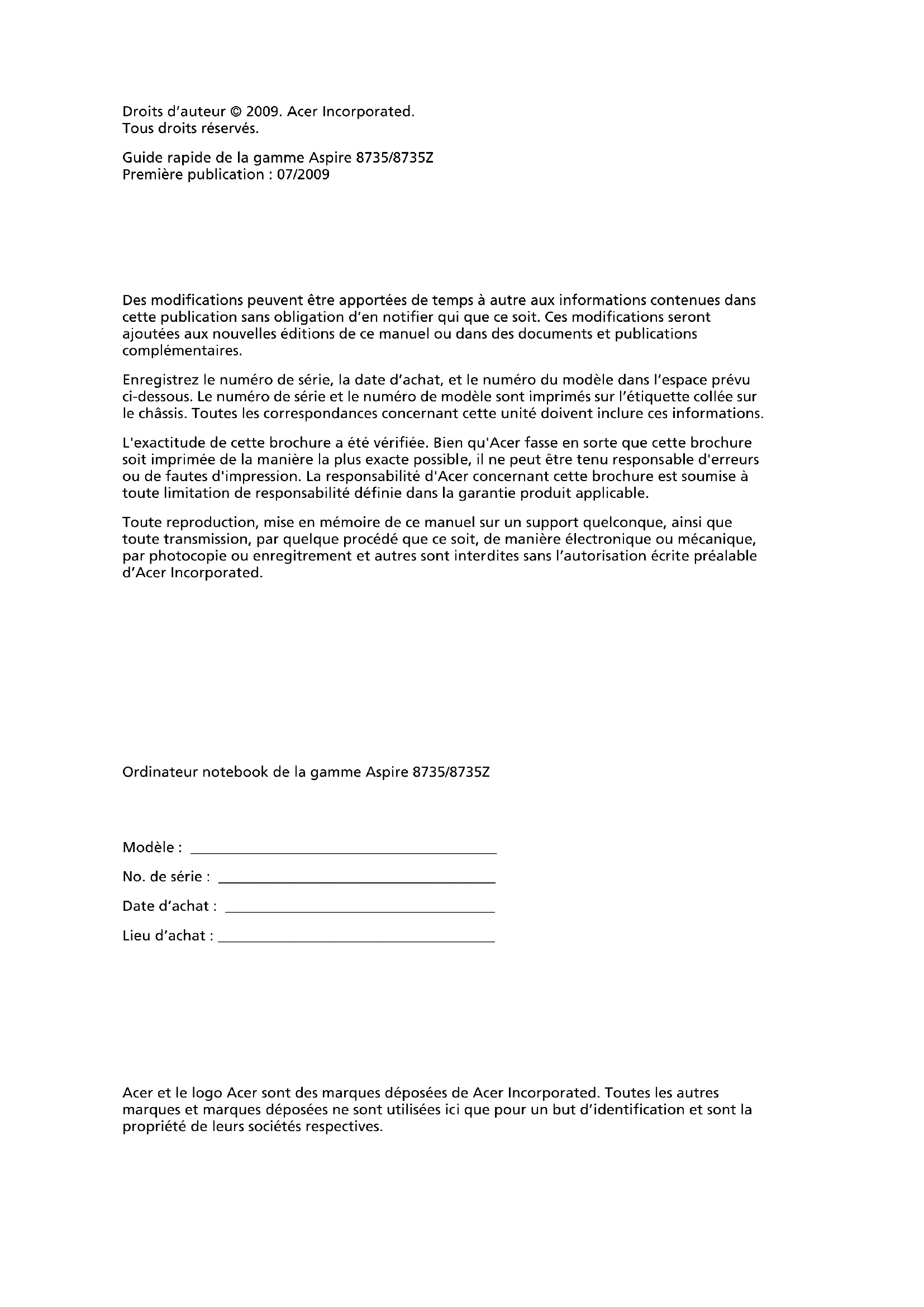 Gamme Aspire 8735/8735Z Guide rapideDes modifications peuvent être apportées de temps à autre aux informations contenues dans cette publication sans obligation d’en notifier qui que ce soit. Ces modifications seront ajoutées aux nouvelles éditions de ce manuel ou dans des documents et publications complémentaires. Enregistrez le numéro de série, la date d’achat, et le numéro du modèle dans l’espace prévu ci-dessous. Le numéro de série et le numéro de modèle sont imprimés sur l’étiquette collée sur le châssis. Toutes les correspondances concernant cette unité doivent inclure ces informations. L'exactitude de cette brochure a été vérifiée. Bien qu'Acer fasse en sorte que cette brochure soit imprimée de la manière la plus exacte possible, il ne peut être tenu responsable d'erreurs ou de fautes d'impression. La responsabilité d'Acer concernant cette brochure est soumise à toute limitation de responsabilité définie dans la garantie produit applicable. Toute reproduction, mise en mémoire de ce manuel sur un support quelconque, ainsi que toute transmission, par quelque procédé que ce soit, de manière électronique ou mécanique, par photocopie ou enregitrement et autres sont interdites sans l’autorisation écrite préalable d’Acer Incorporated. Modèle : __________________________________________ No. de série : ______________________________________ Date d’achat : _____________________________________ Lieu d’achat : ______________________________________ Droits d’auteur © 2009. Acer Incorporated. Tous droits réservés. Guide rapide de la gamme Aspire 8735/8735Z Première publication : 07/2009 Ordinateur notebook de la gamme Aspire 8735/8735Z Acer et le logo Acer sont des marques déposées de Acer Incorporated. Toutes les autres marques et marques déposées ne sont utilisées ici que pour un but d’identification et sont la propriété de leurs sociétés respectives.3 Pour commencer Nous désirons vous remercier d’avoir fait d’un notebook Acer votre choix pour répondre à vos besoins informatiques mobiles. Vos guides Pour vous aider à utiliser votre notebook Acer, nous avons conçu plusieurs guides : Tout d’abord, le poster Pour partir du bon pied... vous aide à configurer votre ordinateur. Le Guide utilisateur générique de la gamme Aspire contient des informations utiles qui s’appliquent à tous les modèles de la gamme des produits Aspire. Il couvre les sujet de base, telles que l'utilisation du clavier, du son, etc. Il faut comprendre que du fait de sa nature, le Guide utilisateur générique ainsi que le AcerSystem User Guide mentionné ci-dessous fera référence parfois à des fonctions ou des caractéristiques qui ne sont contenues que dans certains modèles de la gamme, mais pas nécessaire dans le modèle que vous avez acheté. Ces cas sont marqués dans le texte avec des mentions telles que « seulement pour certains modèles ». Le Guide rapide présente les fonctionnalités et fonctions de base de votre ordinateur. Pour plus d’information sur l’aide que peut vous apporter pour être plus productif, veuillez vous reporter à AcerSystem User Guide. Ce guide contient des informations détaillées sur des sujets tels que les utilitaires systèmes, la récupération des données, les options d’extension et le dépannage. De plus, il contient des informations de garantie et les réglementations générales et les avis de sécurité pour votre notebook. Il est disponible au format PDF (Portable Document Format) et est préchargé sur votre notebook. Procédez comme suit pour y accéder : 1 Cliquez sur Démarrer, Tous les programmes, puis AcerSystem. 2 Cliquez sur AcerSystem User Guide. Remarque : L’affichage du fichier nécessite Adobe Reader. Si Adobe Reader n’est pas installé dans votre ordinateur, le clic sur AcerSystem User Guide va exécuter le programme d’installation d’Adobe Reader. Suivez les instructions à l’écran pour terminer l’installation. Pour des instructions sur l’utilisation de Adobe Reader, accédez au menu Aide et Support.4 Français Votre visite guidée du notebook Acer Après avoir configuré votre ordinateur comme illustré dans le poster Pour partir du bon pied..., nous allons vous faire explorer votre nouveau notebook Acer. Vue supérieure # Icône Élément Description1Webcam Acer Crystal EyeWebcam pour communication video.