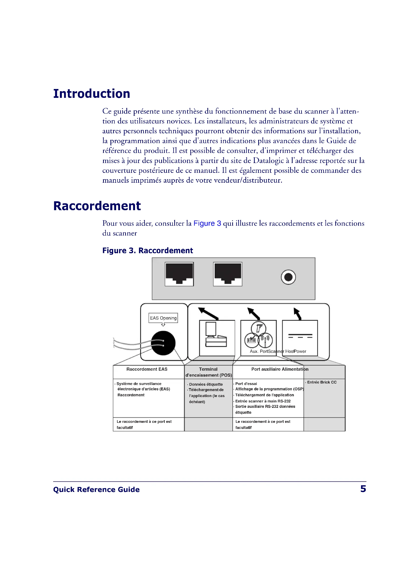 Pour vous aider, consulter la Figure 3 qui illustrate les raccordements et les fonctions du scanner