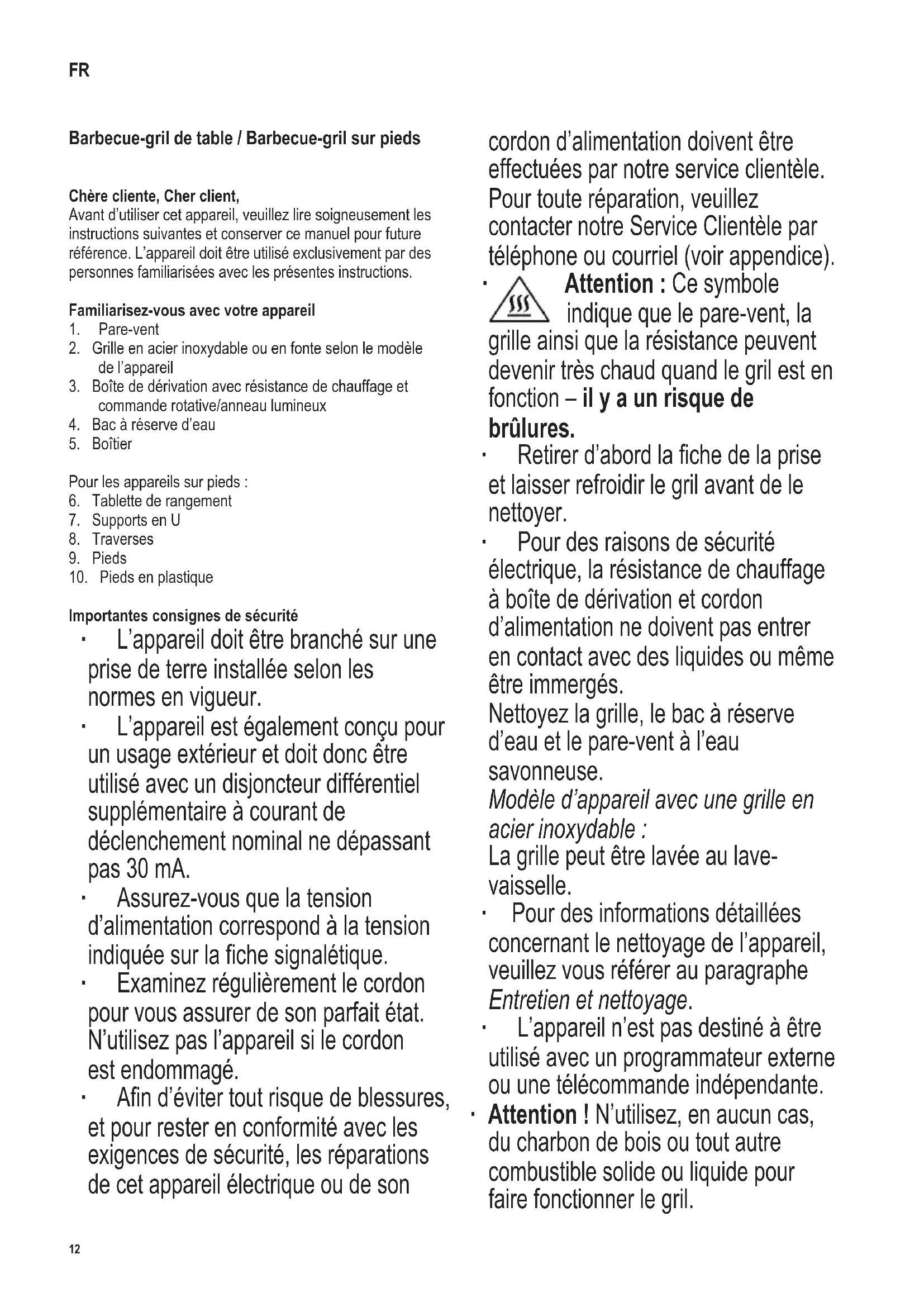 indique que le pare-vent, la grille et la résistance peuvent être très chauds quand le grill est en fonctionnement - il y a un risque de brûlure.