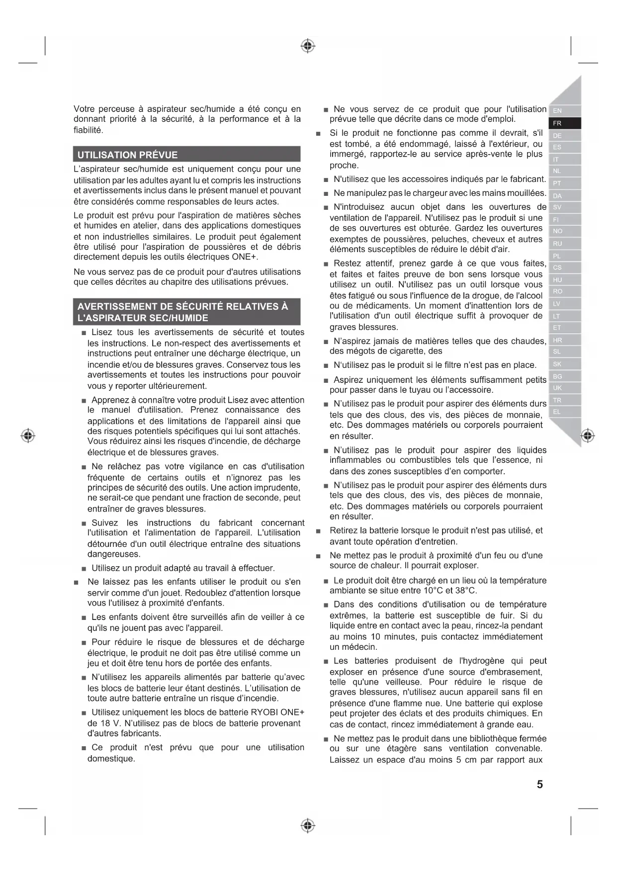 ■ Lisez tous les avertissements de sécurité et toutes les instructions. Le non-respect des avertissements et instructions peut entraîner une décharge électrique, un incendie et/ou de blessures graves. Conservez tous les avertissements et toutes les instructions pour pouvoir vous y reporter ultérieurement. ■ Apprenez à connaître votre produit Lisez avec attention le manuel d'utilisation. Prenez connaissance des applications et des limitations de l'appareil ainsi que des risques potentiels spécifiques qui lui sont attachés. Vous réduirez ainsi les risques d'incendie, de décharge électrique et de blessures graves. ■ Ne relâchez pas votre vigilance en cas d'utilisation fréquente de certains outils et n’ignorez pas les principes de sécurité des outils. Une action imprudente, ne serait-ce que pendant une fraction de seconde, peut entraîner de graves blessures. ■ Suivez les instructions du fabricant concernant l'utilisation et l'alimentation de l'appareil. L'utilisation détournée d'un outil électrique entraîne des situations dangereuses. ■ Utilisez un produit adapté au travail à effectuer. ■ Ne laissez pas les enfants utiliser le produit ou s'en servir comme d'un jouet. Redoublez d'attention lorsque vous l'utilisez à proximité d'enfants. ■ Les enfants doivent être surveillés afin de veiller à ce qu'ils ne jouent pas avec l'appareil. ■ Pour réduire le risque de blessures et de décharge électrique, le produit ne doit pas être utilisé comme un jeu et doit être tenu hors de portée des enfants. ■ N’utilisez les appareils alimentés par batterie qu’avec les blocs de batterie leur étant destinés. L’utilisation de toute autre batterie entraîne un risque d’incendie. ■ Utilisez uniquement les blocs de batterie RYOBI ONE+ de 18 V. N’utilisez pas de blocs de batterie provenant d'autres fabricants. ■ Ce produit n'est prévu que pour une utilisation domestique. ■ Ne vous servez de ce produit que pour l'utilisation prévue telle que décrite dans ce mode d'emploi. ■ Si le produit ne fonctionne pas comme il devrait, s'il est tombé, a été endommagé, laissé à l'extérieur, ou immergé, rapportez-le au service après-vente le plus proche. ■ N'utilisez que les accessoires indiqués par le fabricant. ■ Ne manipulez pas le chargeur avec les mains mouillées. ■ N'introduisez aucun objet dans les ouvertures de ventilation de l'appareil. N'utilisez pas le produit si une de ses ouvertures est obturée. Gardez les ouvertures exemptes de poussières, peluches, cheveux et autres éléments susceptibles de réduire le débit d'air. ■ Restez attentif, prenez garde à ce que vous faites, et faites et faites preuve de bon sens lorsque vous utilisez un outil. N'utilisez pas un outil lorsque vous êtes fatigué ou sous l'influence de la drogue, de l'alcool ou de médicaments. Un moment d'inattention lors de l'utilisation d'un outil électrique suffit à provoquer de graves blessures. ■ N’aspirez jamais de matières telles que des chaudes, des mégots de cigarette, des ■ N‘utilisez pas le produit si le filtre n’est pas en place. ■ Aspirez uniquement les éléments suffisamment petits pour passer dans le tuyau ou l’accessoire. ■ N’utilisez pas le produit pour aspirer des éléments durs tels que des clous, des vis, des pièces de monnaie, etc. Des dommages matériels ou corporels pourraient en résulter. ■ N’utilisez pas le produit pour aspirer des liquides inflammables ou combustibles tels que l’essence, ni dans des zones susceptibles d’en comporter. ■ N’utilisez pas le produit pour aspirer des éléments durs tels que des clous, des vis, des pièces de monnaie, etc. Des dommages matériels ou corporels pourraient en résulter. ■ Retirez la batterie lorsque le produit n'est pas utilisé, et avant toute opération d'entretien. ■ Ne mettez pas le produit à proximité d'un feu ou d'une source de chaleur. Il pourrait exploser. ■ Le produit doit être chargé en un lieu où la température ambiante se situe entre 10°C et 38°C. ■ Dans des conditions d'utilisation ou de température extrêmes, la batterie est susceptible de fuir. Si du liquide entre en contact avec la peau, rincez-la pendant au moins 10 minutes, puis contactez immédiatement un médecin. ■ Les batteries produisent de l'hydrogène qui peut exploser en présence d'une source d'embrasement, telle qu'une veilleuse. Pour réduire le risque de graves blessures, n'utilisez aucun appareil sans fil en présence d'une flamme nue. Une batterie qui explose peut projeter des éclats et des produits chimiques. En cas de contact, rincez immédiatement à grande eau. ■ Ne mettez pas le produit dans une bibliothèque fermée ou sur une étagère sans ventilation convenable. Laissez un espace d'au moins 5 cm par rapport aux6 | Français autres objets. ■ Risque de situations incontrôlées en cas d'utilisation à des températures ambiantes inférieures à 0 °C ou supérieures à +40 °C. ■ Une décharge électrique est susceptible de se produire si la batterie est chargée à l'extérieur ou sur une surface humide. ■ Gardez l'appareil sec, propre, et exempt d'huile et de graisse. Utilisez toujours un chiffon propre pour le nettoyer. ■ Maintenez les surfaces de préhension et les poignées sèches, propres et exemptes d'huile ou de graisse. Des surfaces de préhension ou des poignées glissantes empêchent de contrôler et de manipuler l'outil de façon sécurisée en cas de situation inattendue. ■ Conservez ces manuel. Reportez-vous-y fréquemment et utilisez-les pour renseigner les autres utilisateurs susceptibles d'utiliser cet outil. Si vous prêtez cet outil à quelqu'un, prêtez-lui également ce manuel. ■ Ne travaillez pas en extension. Garder une position et un équilibre adaptés à tout moment. Vous contrôlerez ainsi mieux l'outil électrique en cas d'imprévu. Tout déplacement du centre de gravité pourrait provoquer une perte d'