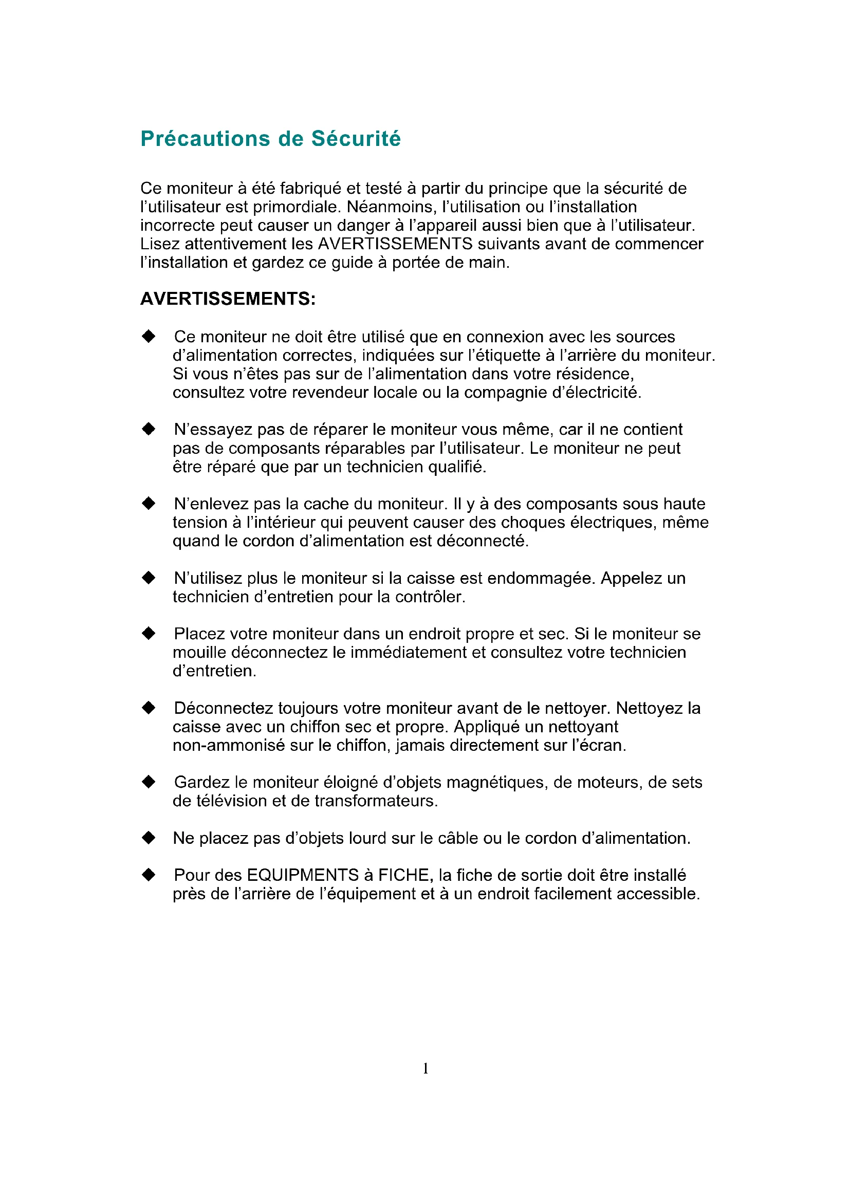 - En Cas de Problème -14Précautions de Sécurité Ce moniteur à été fabriqué et testé à partir du principe que la sécurité de l’utilisateur est primordiale. Néanmoins, l’utilisation ou l’installation incorrecte peut causer un danger à l’appareil aussi bien que à l’utilisateur. Lisez attentivement les AVERTISSEMENTS suivants avant de commencer l’installation et gardez ce guide à portée de main. AVERTISSEMENTS: Ce moniteur ne doit être utilisé que en connexion avec les sources d’alimentation correctes, indiquées sur l’étiquette à l’arrière du moniteur. Si vous n’êtes pas sur de l’alimentation dans votre résidence, consultez votre revendeur locale ou la compagnie d’électricité. N’essayez pas de réparer le moniteur vous même, car il ne contient pas de composants réparables par l’utilisateur. Le moniteur ne peut être réparé que par un technicien qualifié. N’enlevez pas la cache du moniteur. Il y à des composants sous haute tension à l’intérieur qui peuvent causer des choques électriques, même quand le cordon d’alimentation est déconnecté. N’utilisez plus le moniteur si la caisse est endommagée. Appelez un technicien d’entretien pour la contrôler. Placez votre moniteur dans un endroit propre et sec. Si le moniteur se mouille déconnectez le immédiatement et consultez votre technicien d’entretien. Déconnectez toujours votre moniteur avant de le nettoyer. Nettoyez la caisse avec un chiffon sec et propre. Appliqué un nettoyant non-ammonisé sur le chiffon, jamais directement sur l’écran. Gardez le moniteur éloigné d’objets magnétiques, de moteurs, de sets de télévision et de transformateurs. Ne placez pas d’objets lourd sur le câble ou le cordon d’alimentation. p. 13
