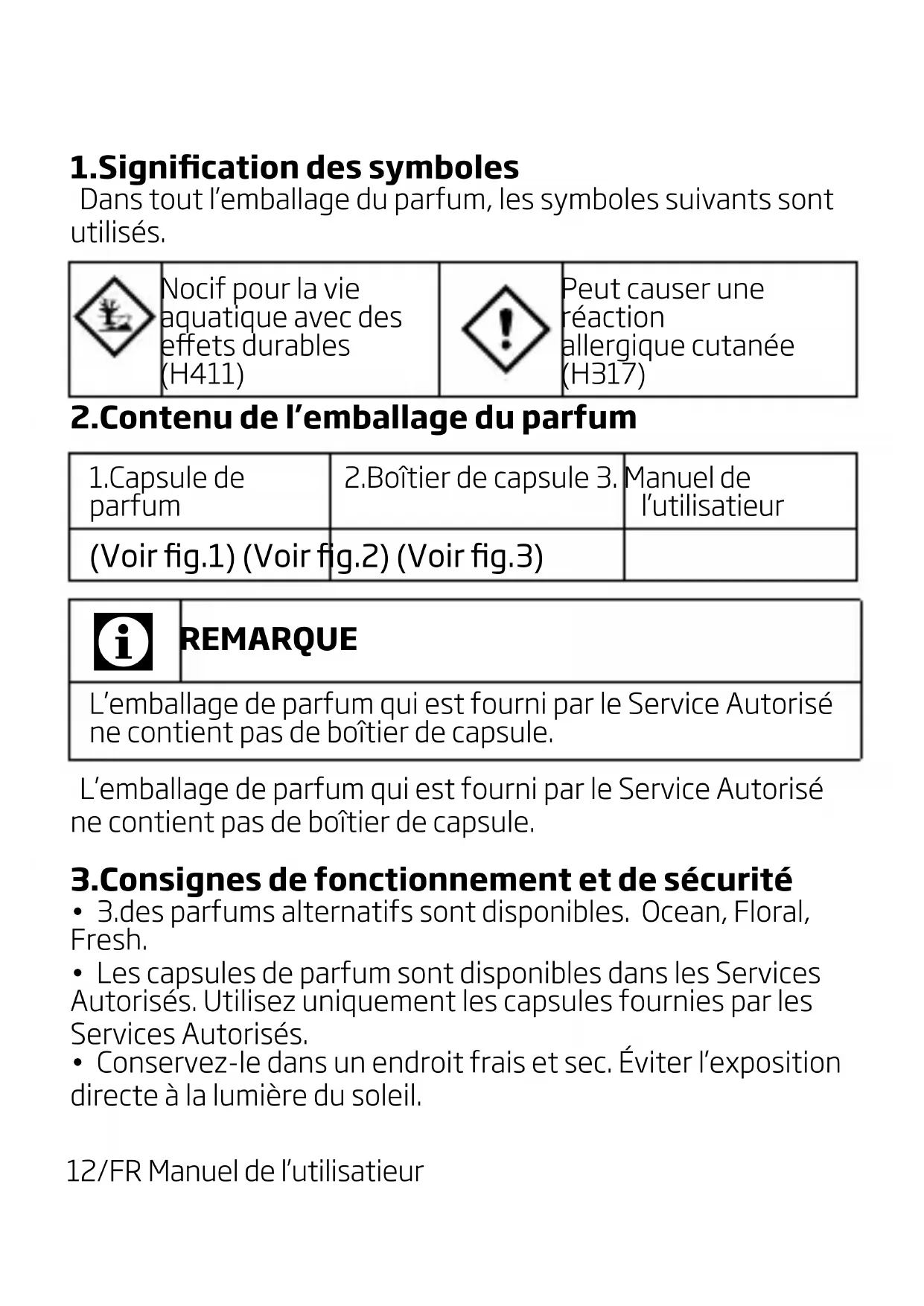 REMARQUE L’emballage de parfum qui est fourni par le Service Autorisé ne contient pas de boîtier de capsule. L’emballage de parfum qui est fourni par le Service Autorisé ne contient pas de boîtier de capsule. 3.Consignes de fonctionnement et de sécurité