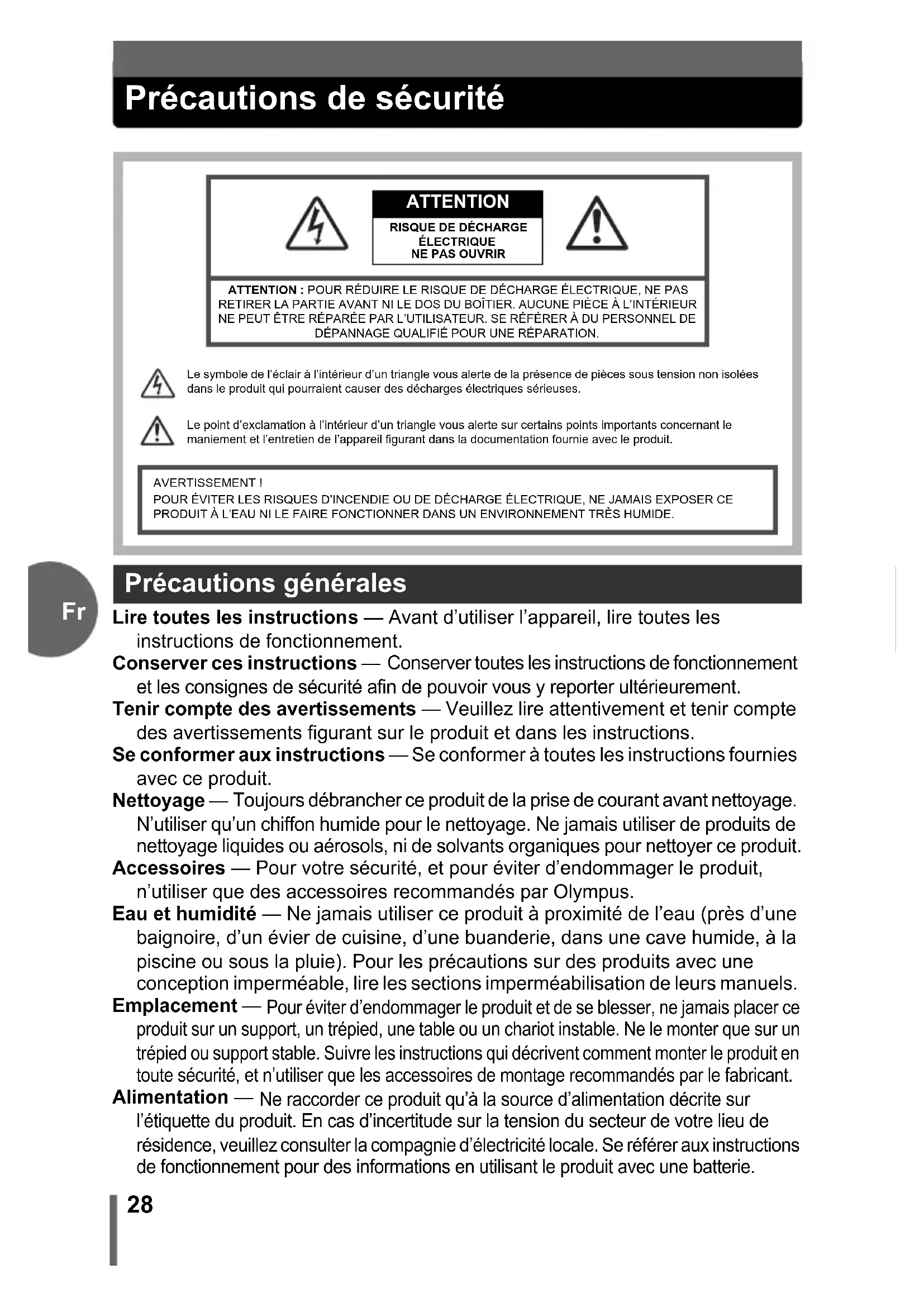 Précautions de sécurité Lire toutes les instructions — Avant d’utiliser l’appareil, lire toutes les instructions de fonctionnement. Conserver ces instructions — Conserver toutes les instructions de fonctionnement et les consignes de sécurité afin de pouvoir vous y reporter ultérieurement. Tenir compte des avertissements — Veuillez lire attentivement et tenir compte des avertissements figurant sur le produit et dans les instructions. Se conformer aux instructions — Se conformer à toutes les instructions fournies avec ce produit. Nettoyage — Toujours débrancher ce produit de la prise de courant avant nettoyage. N’utiliser qu’un chiffon humide pour le nettoyage. Ne jamais utiliser de produits de nettoyage liquides ou aérosols, ni de solvants organiques pour nettoyer ce produit. Accessoires — Pour votre sécurité, et pour éviter d’endommager le produit, n’utiliser que des accessoires recommandés par Olympus. Eau et humidité — Ne jamais utiliser ce produit à proximité de l’eau (près d’une baignoire, d’un évier de cuisine, d’une buanderie, dans une cave humide, à la piscine ou sous la pluie). Pour les précautions sur des produits avec une conception imperméable, lire les sections imperméabilisation de leurs manuels. Emplacement — Pour éviter d’endommager le produit et de se blesser, ne jamais placer ce produit sur un support, un trépied, une table ou un chariot instable. Ne le monter que sur un trépied ou support stable. Suivre les instructions qui décrivent comment monter le produit en toute sécurité, et n’utiliser que les accessoires de montage recommandés par le fabricant. Alimentation — Ne raccorder ce produit qu’à la source d’alimentation décrite sur l’étiquette du produit. En cas d’incertitude sur la tension du secteur de votre lieu de résidence, veuillez consulter la compagnie d’électricité locale. Se référer aux instructions de fonctionnement pour des informations en utilisant le produit avec une batterie. Précautions générales ATTENTION : POUR RÉDUIRE LE RISQUE DE DÉCHARGE ÉLECTRIQUE, NE PAS RETIRER LA PARTIE AVANT NI LE DOS DU BOÎTIER. AUCUNE PIÈCE À L’INTÉRIEUR NE PEUT ÊTRE RÉPARÉE PAR L’UTILISATEUR. SE RÉFÉRER À DU PERSONNEL DE DÉPANNAGE QUALIFIÉ POUR UNE RÉPARATION.Le symbole de l’éclair à l’intérieur d’un triangle vous alerte de la présence de pièces sous tension non isolées dans le produit qui pourraient causer des décharges électriques sérieuses.Le point d’exclamation à l’intérieur d’un triangle vous alerte sur certains points importants concernant le maniement et l’entretien de l’appareil figurant dans la documentation fournie avec le produit.AVERTISSEMENT !POUR ÉVITER LES RISQUES D’INCENDIE OU DE DÉCHARGE ÉLECTRIQUE, NE JAMAIS EXPOSER CE PRODUIT À L’EAU NI LE FAIRE FONCTIONNER DANS UN ENVIRONNEMENT TRÈS HUMIDE. ATTENTION RISQUE DE DÉCHARGE ÉLECTRIQUE NE PAS OUVRIR d4261_basic_f_00_bookfile_7.book Page 28 Monday, February 14, 2005 11:17 PMPrécautions de sécurité