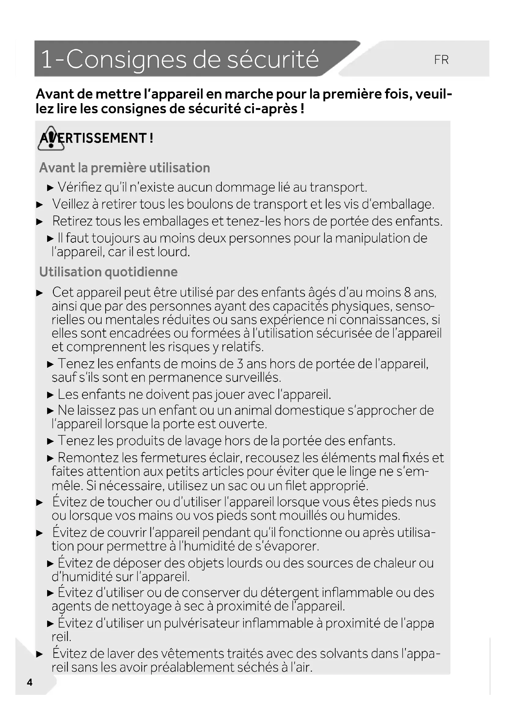 reil. ▶ Évitez de laver des vêtements traités avec des solvants dans l’appa- reil sans les avoir préalablement séchés à l’air.FR 1-Consignes de sécurité