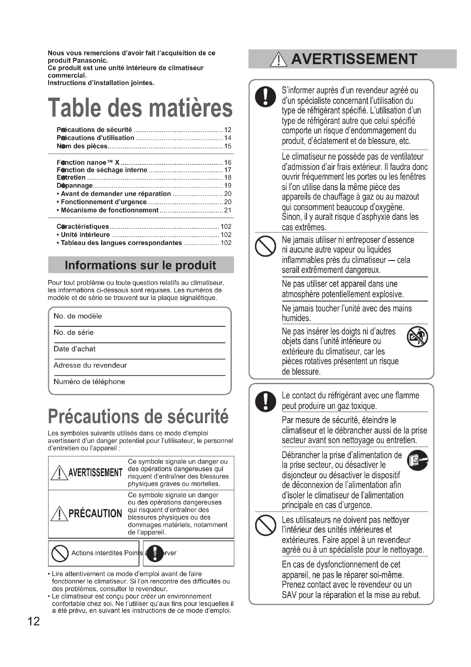 - Tableau des langues correspondantes ................... 102 Table des matières Précautions de sécurité Informations sur le produit Pour tout problème ou toute question relatifs au climatiseur, les informations ci-dessous sont requises. Les numéros de modèle et de série se trouvent sur la plaque signalétique.No. de modèle No. de série Date d’achatAdresse du revendeurNuméro de téléphoneS’informer auprès d’un revendeur agréé ou d’un spécialiste concernant l’utilisation du type de réfrigérant spécié. L’utilisation d’un type de réfrigérant autre que celui spécié comporte un risque d’endommagement du produit, d’éclatement et de blessure, etc.Le climatiseur ne possède pas de ventilateur d’admission d’air frais extérieur. Il faudra donc ouvrir fréquemment les portes ou les fenêtres si l’on utilise dans la même pièce des appareils de chauffage à gaz ou au mazout qui consomment beaucoup d’oxygène. Sinon, il y aurait risque d’asphyxie dans les cas extrêmes.Ne jamais utiliser ni entreposer d’essence ni aucune autre vapeur ou liquides inammables près du climatiseur — cela serait extrêmement dangereux.Ne pas utiliser cet appareil dans une atmosphère potentiellement explosive.Ne jamais toucher l’unité avec des mains humides.Ne pas insérer les doigts ni d’autres objets dans l’unité intérieure ou extérieure du climatiseur, car les pièces rotatives présentent un risque de blessure.Le contact du réfrigérant avec une amme peut produire un gaz toxique.Par mesure de sécurité, éteindre le climatiseur et le débrancher aussi de la prise secteur avant son nettoyage ou entretien.Débrancher la prise d’alimentation de la prise secteur, ou désactiver le disjoncteur ou désactiver le dispositif de déconnexion de l’alimentation an d’isoler le climatiseur de l’alimentation principale en cas d’urgence.Les utilisateurs ne doivent pas nettoyer l’intérieur des unités intérieures et extérieures. Faire appel à un revendeur agréé ou à un spécialiste pour le nettoyage.En cas de dysfonctionnement de cet appareil, ne pas le réparer soi-même. Prenez contact avec le revendeur ou un SAV pour la réparation et la mise au rebut.Les symboles suivants utilisés dans ce mode d’emploi avertissent d’un danger potentiel pour l’utilisateur, le personnel d’entretien ou l’appareil : AVERTISSEMENT Ce symbole signale un danger ou des opérations dangereuses qui risquent d’entraîner des blessures physiques graves ou mortelles. PRÉCAUTION Ce symbole signale un danger ou des opérations dangereuses qui risquent d’entraîner des blessures physiques ou des dommages matériels, notamment de l’appareil. AVERTISSEMENT Nous vous remercions d’avoir fait l’acquisition de ce produit Panasonic.Ce produit est une unité intérieure de climatiseur commercial.Instructions d’installation jointes.Actions interdites Points à observer• Lire attentivement ce mode d’emploi avant de faire fonctionner le climatiseur. Si l’on rencontre des difcultés ou des problèmes, consulter le revendeur.• Le climatiseur est conçu pour créer un environnement confortable chez soi. Ne l’utiliser qu’aux ns pour lesquelles il a été prévu, en suivant les instructions de ce mode d’emploi. OI_00_311238_EU.indb 12 2019/5/10 9:37:3613 FRANÇAIS Cet appareil est conçu pour être utilisé par des utilisateurs expérimentés ou conrmés en magasin, dans l’industrie légère et dans les fermes, ou pour une utilisation commerciale par les profanes. Cet appareil peut être utilisé par des enfants à partir de 8 ans et des personnes aux facultés physiques, sensorielles ou mentales diminuées ou sans expérience ni expertise sous la surveillance d’un adulte ou s’ils ont reçu des instructions concernant l’utilisation sécuritaire de l’appareil et s’ils comprennent les risques encourus.Les enfants ne doivent pas jouer avec l’appareil. Le nettoyage et la maintenance utilisateur ne doivent pas être effectués par un enfant laissé sans surveillance. Placer l’alarme incendie et la sortie d’air à au moins 1,5 m de l’unité. Ne pas trop refroidir ou chauffer une pièce où se trouvent des bébés ou des malades. Ne pas mettre le climatiseur sous et hors tension à l’aide de l’interrupteur d’alimentation du système. Utiliser le bouton de marche/arrêt de fonctionnement (ON/OFF). Ne rien introduire dans la sortie d’air de l’unité extérieure. Cela est très dangereux, car le ventilateur marche à grande vitesse. Ne pas toucher l’arrivée d’air ou les ailettes coupantes en aluminium de l’unité extérieure. Il y a un risque de blessure. Ne pas introduire d’objet dans le BOITIER DU VENTILATEUR. Il y a un risque de blessure et l’unité pourrait être endommagée. Cesser d’utiliser le produit lorsqu’une anomalie ou défaillance quelconque se produit et débrancher la che d’alimentation ou mettre hors tension l’interrupteur et le disjoncteur. (Risque de fumée/incendie/décharge électrique) Exemples d’anomalie ou défaillance :