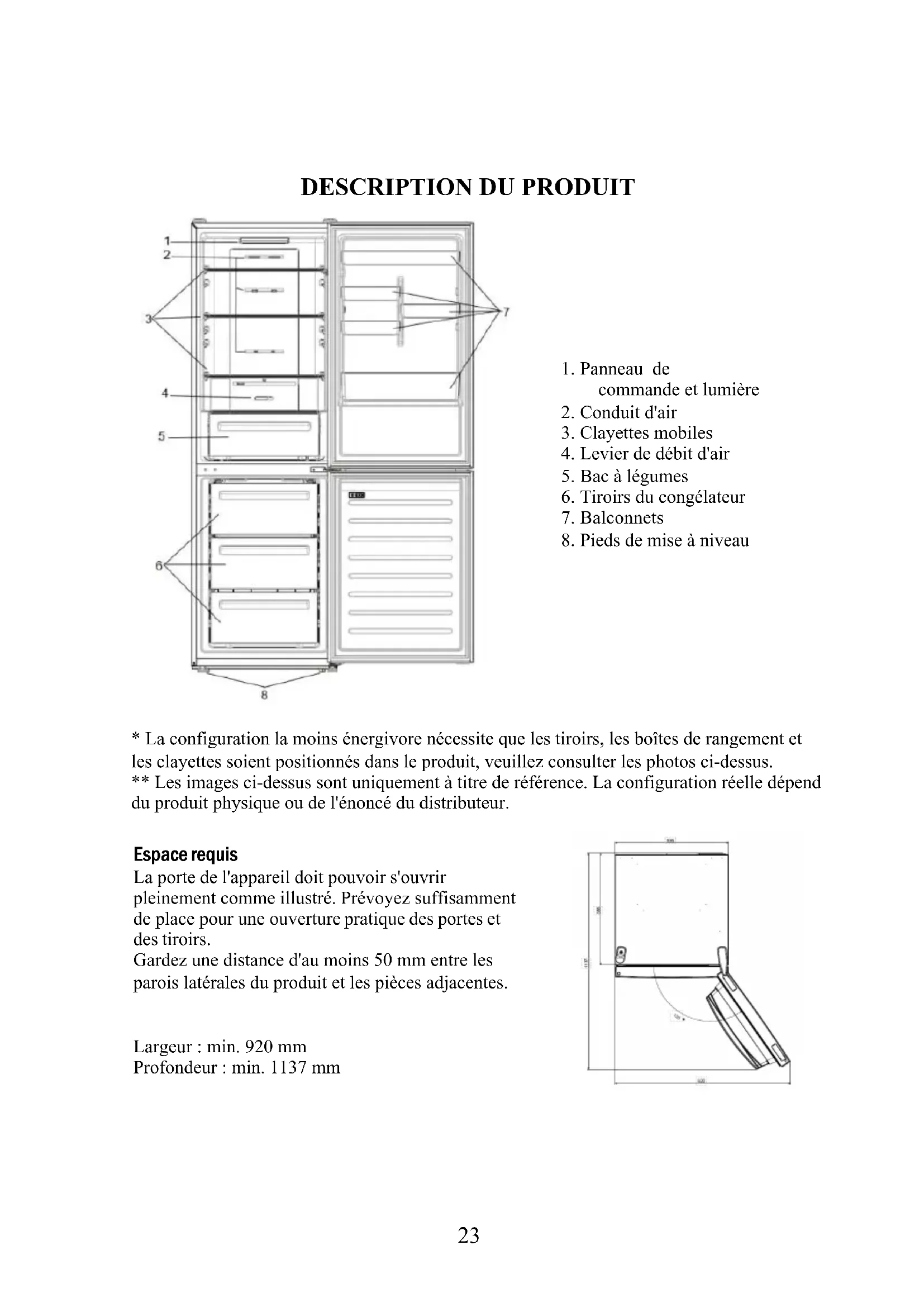 - La configuration la moins énergivore nécessite que les tiroirs, les boîtes de rangement et les clayettes soient positionnés dans le produit, veuillez consulter les photos ci-dessus. ** Les images ci-dessus sont uniquement à titre de référence. La configuration réelle dépend du produit physique ou de l'énoncé du distributeur. Espace requis La porte de l'appareil doit pouvoir s'ouvrir pleinement comme illustré. Prévoyez suffisamment de place pour une ouverture pratique des portes et des tiroirs. Gardez une distance d'au moins 50 mm entre les parois latérales du produit et les pièces adjacentes. Largeur : min. 920 mm Profondeur : min. 1137 mm24 Touche Marche/Arrêt, utilisée pour allumer/éteindre l'appareil. Touche Réglage, utilisée pour régler la température ou pour sélectionner la fonction Super refroidissement. L'icône Super refroidissement indique si la fonction est activée.