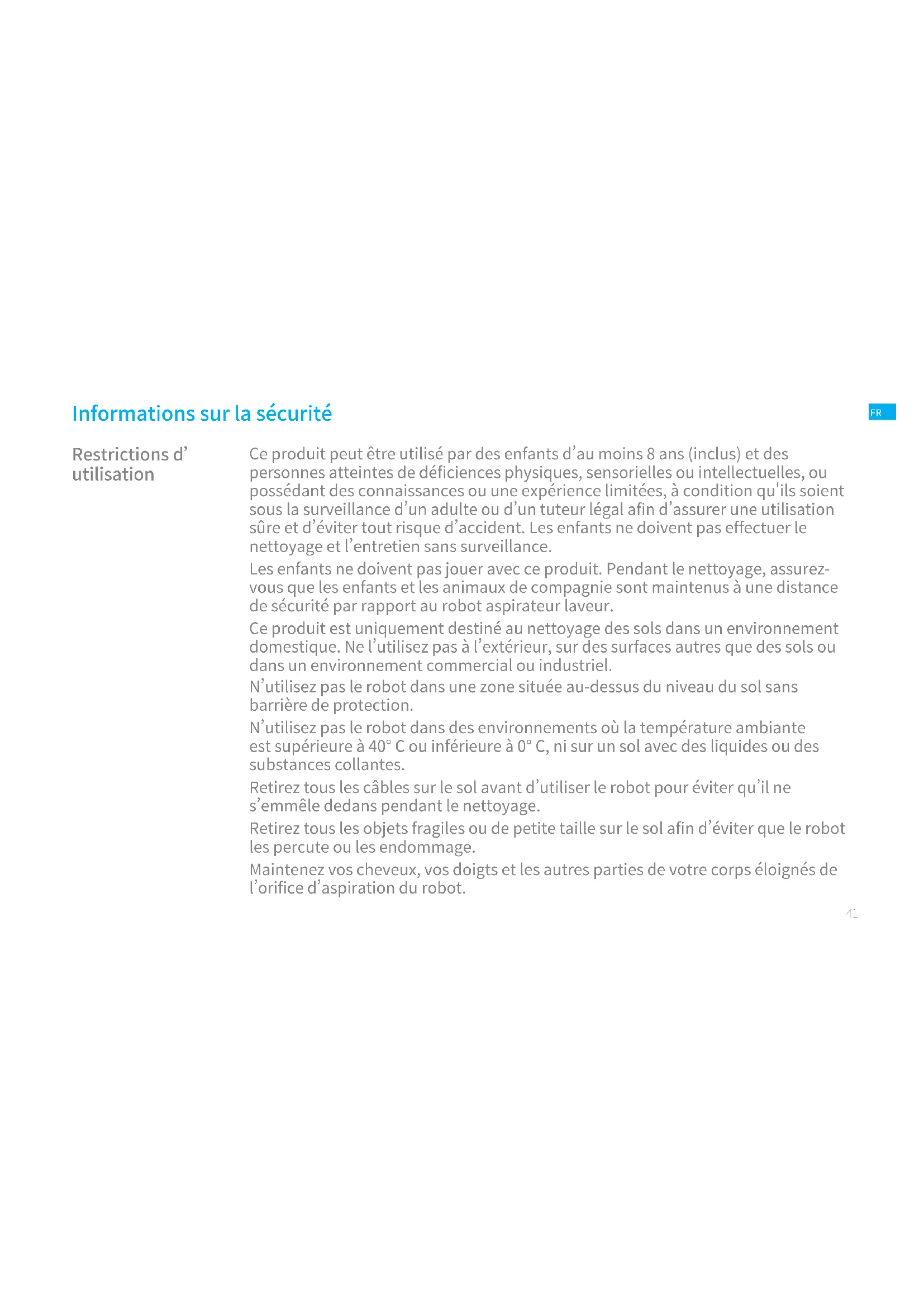 Restrictions d’ utilisation Informations sur la sécurité Ce produit peut être utilisé par des enfants d’au moins 8 ans (inclus) et des personnes atteintes de déficiences physiques, sensorielles ou intellectuelles, ou possédant des connaissances ou une expérience limitées, à condition qu'ils soient sous la surveillance d’un adulte ou d’un tuteur légal afin d’assurer une utilisation sûre et d’éviter tout risque d’accident. Les enfants ne doivent pas effectuer le nettoyage et l’entretien sans surveillance. Les enfants ne doivent pas jouer avec ce produit. Pendant le nettoyage, assurez- vous que les enfants et les animaux de compagnie sont maintenus à une distance de sécurité par rapport au robot aspirateur laveur. Ce produit est uniquement destiné au nettoyage des sols dans un environnement domestique. Ne l’utilisez pas à l’extérieur, sur des surfaces autres que des sols ou dans un environnement commercial ou industriel. N’utilisez pas le robot dans une zone située au-dessus du niveau du sol sans barrière de protection. N’utilisez pas le robot dans des environnements où la température ambiante est supérieure à 40° C ou inférieure à 0° C, ni sur un sol avec des liquides ou des substances collantes. Retirez tous les câbles sur le sol avant d’utiliser le robot pour éviter qu’il ne s’emmêle dedans pendant le nettoyage. Retirez tous les objets fragiles ou de petite taille sur le sol afin d’éviter que le robot les percute ou les endommage. Maintenez vos cheveux, vos doigts et les autres parties de votre corps éloignés de l’orifice d’aspiration du robot.42 43