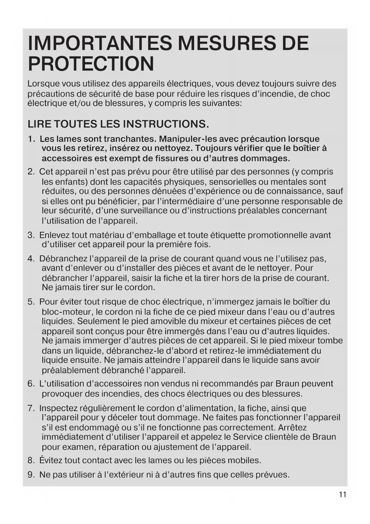 PROTECTION Lorsque vous utilisez des appareils électriques, vous devez toujours suivre des précautions de sécurité de base pour réduire les risques d’incendie, de choc électrique et/ou de blessures, y compris les suivantes: LIRE TOUTES LES INSTRUCTIONS.