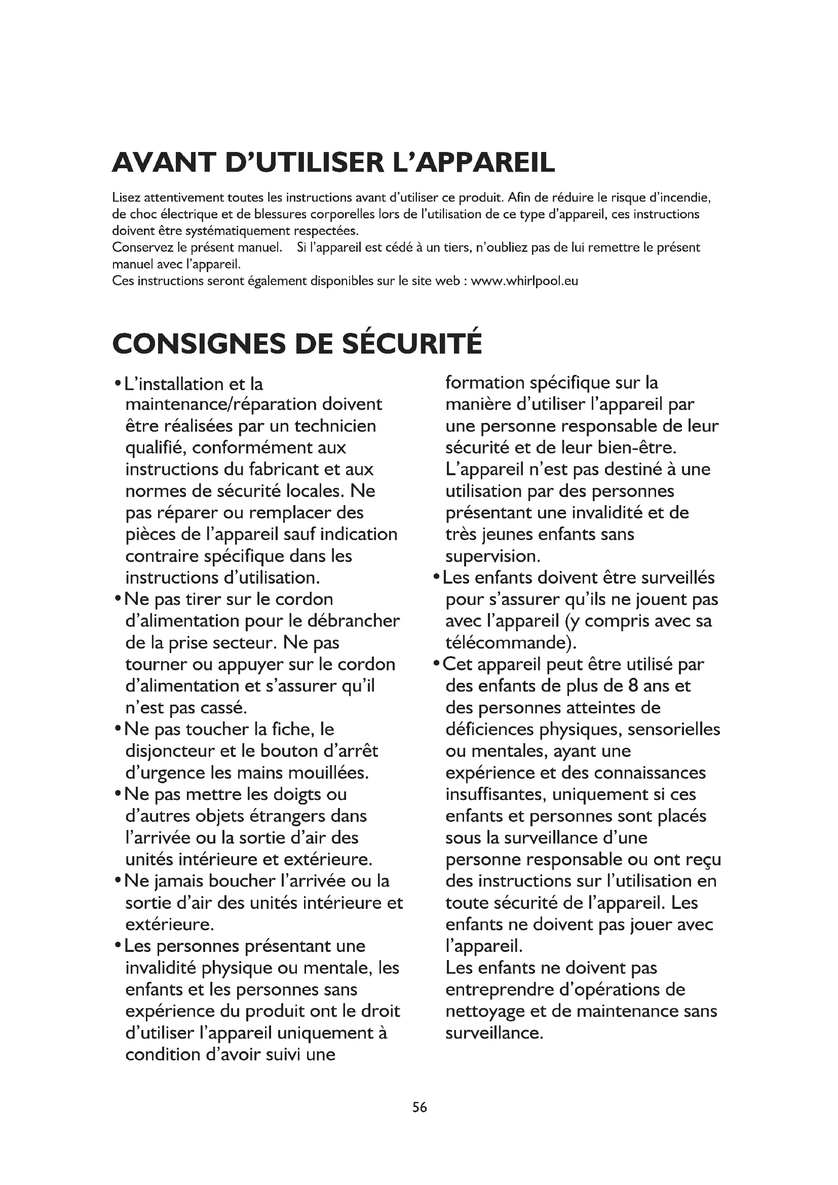 Lisez attentivement toutes les instructions avant d’utiliser ce produit. Afin de réduire le risque d’incendie, de choc électrique et de blessures corporelles lors de l’utilisation de ce type d’appareil, ces instructions doivent être systématiquement respectées. Conservez le présent manuel. Si l’appareil est cédé à un tiers, n’oubliez pas de lui remettre le présent manuel avec l’appareil. Ces instructions seront également disponibles sur le site web : www.whirlpool.eu
