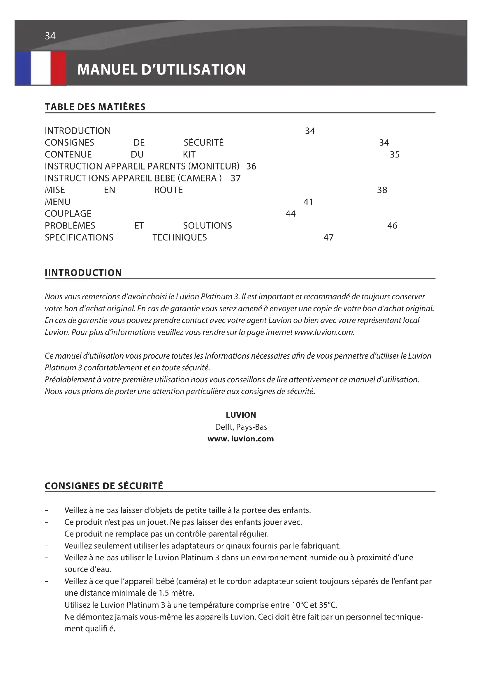 - Veillez à ne pas laisser d’objets de petite taille à la portée des enfants. - Ce produit n’est pas un jouet. Ne pas laisser des enfants jouer avec. - Ce produit ne remplace pas un contrôle parental régulier. - Veuillez seulement utiliser les adaptateurs originaux fournis par le fabriquant. - Veillez à ne pas utiliser le Luvion Platinum 3 dans un environnement humide ou à proximité d’une source d’eau. - Veillez à ce que l’appareil bébé (caméra) et le cordon adaptateur soient toujours séparés de l’enfant par une distance minimale de 1.5 mètre. - Utilisez le Luvion Platinum 3 à une température comprise entre 10°C et 35°C. - Ne démontez jamais vous-même les appareils Luvion. Ceci doit être fait par un personnel technique- ment quali é.35 LUVION