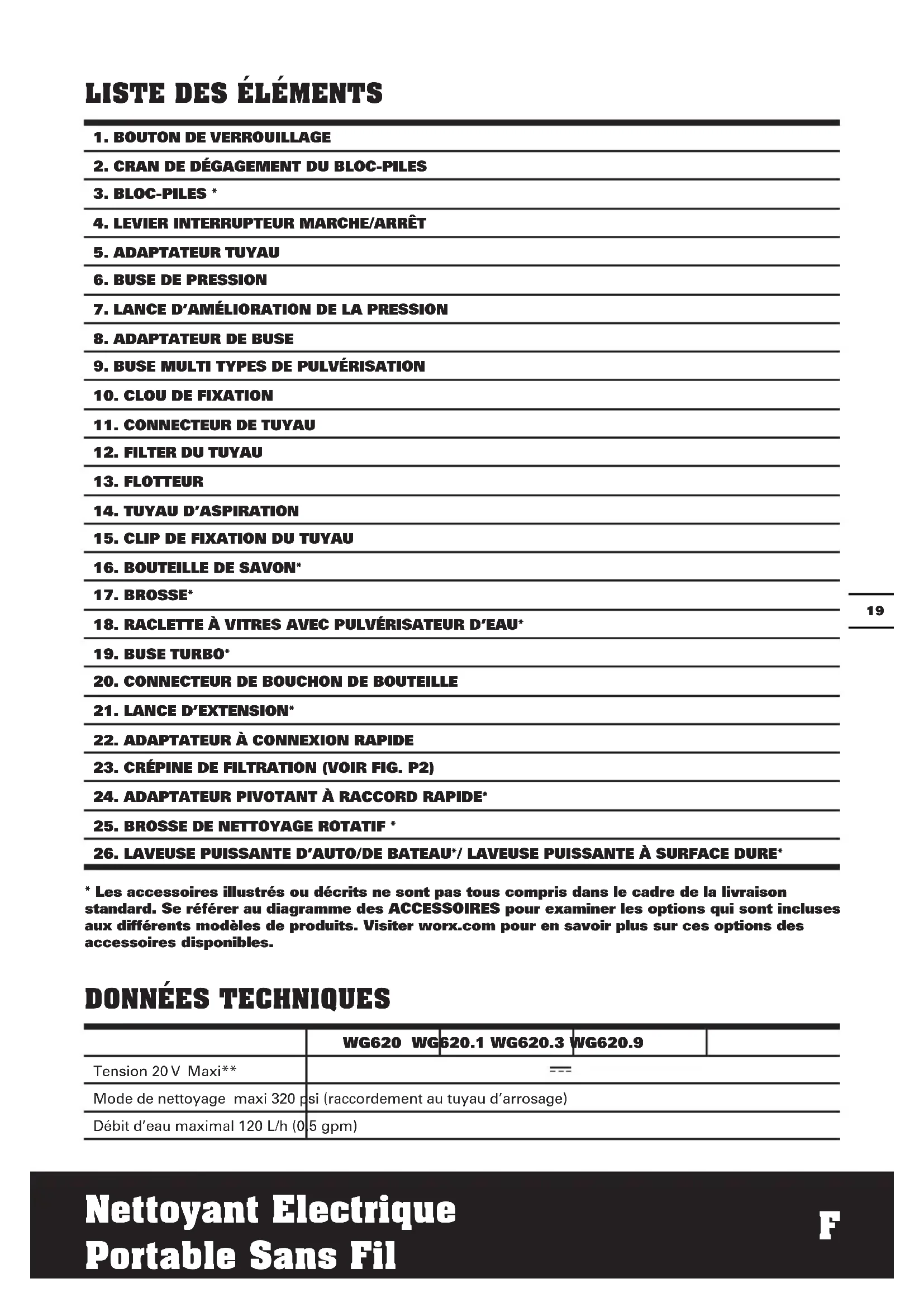 N'utilisez que les accessoires compatibles à cet outil. Les informations des accessoires peuvent être trouvées sur l'emballage du produit, chez un détaillant Worx ou sur notre site Web www.worx.com.