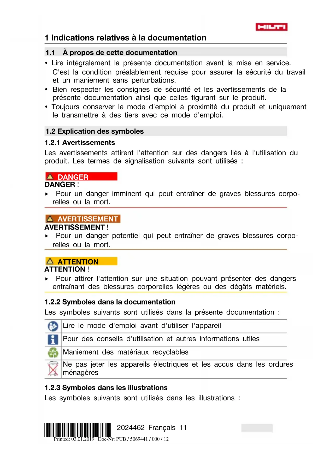 Nous déclarons sous notre seule et unique responsabilité que le produit décrit ici est conforme aux directives et normes en vigueur. Une copie de l'attestation délivrée par l'organisme de certification se trouve en fin de la présente documentation. Printed: 03.01.2019 | Doc-Nr: PUB / 5069441 / 000 / 12*2024462* 2024462 Français 13 Pour obtenir les documentations techniques, s'adresser à : Hilti Entwicklungsgesellschaft mbH | Zulassung Geräte | Hiltistraße 6 | 86916 Kaufering, DE 2 Sécurité