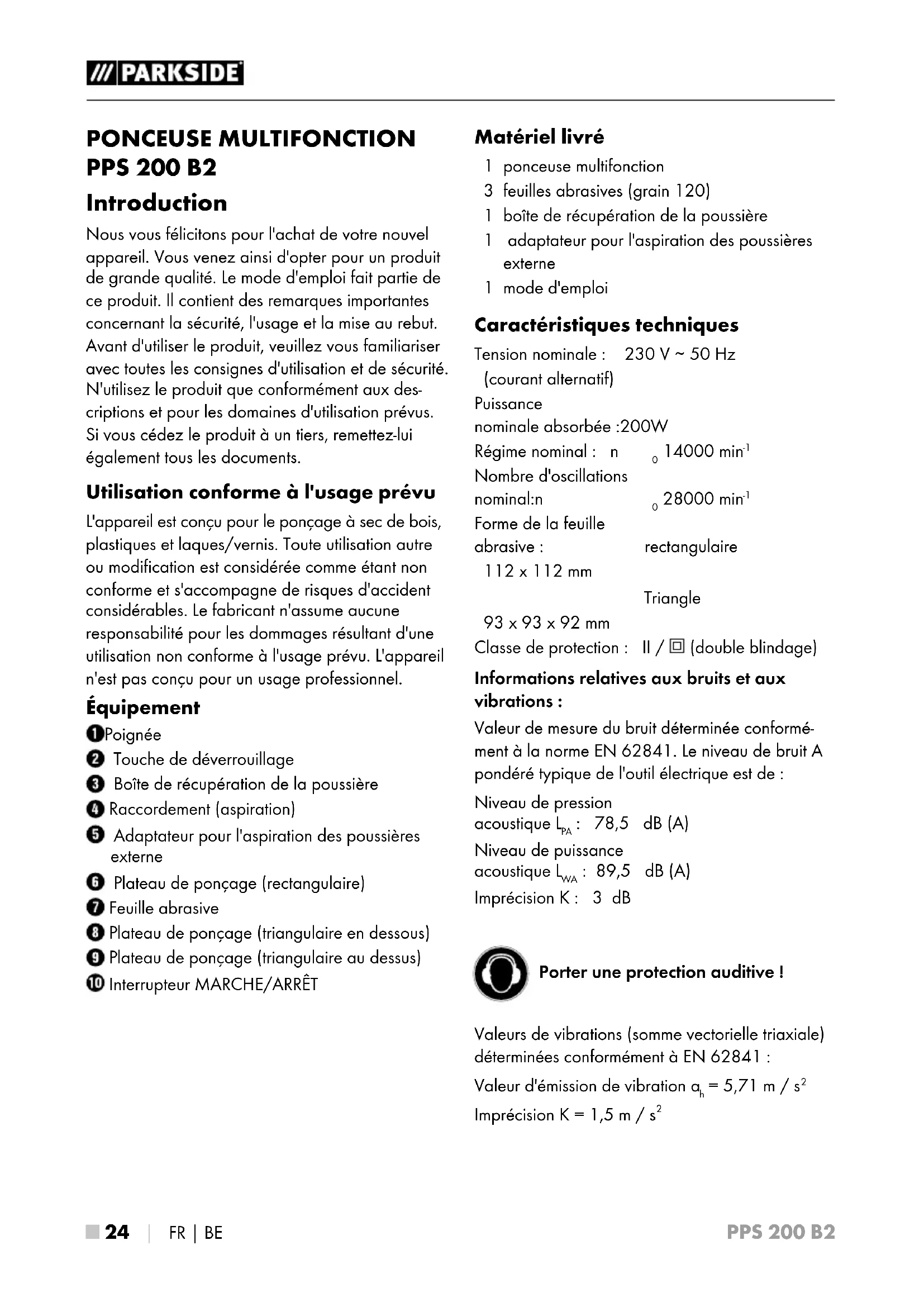 TION D'ÉTINCELLES! Lorsque vous poncez des métaux, des étincelles sont projetées. Veillez de ce fait absolument à ce que personne ne soit mis en danger et qu'aucun matériau combustible ne se trouve à proximité de la zone de travail. AVERTISSEMENT! POUSSIÈRES TOXIQUES! ► Les poussières de matériaux issues par exemple d'un enduit plombifère, de certains types de bois et de métal peuvent être dan- gereuses pour la santé. Le contact ou l'inhalation de ces poussières peut représenter un danger pour l'opérateur ou des personnes situées à proximité. AVERTISSEMENT! DANGER CAUSÉ PAR LA POUSSIÈRE! ► En cas de travail prolongé sur du bois et, en particulier, si les matériaux usinés impliquent des poussières toxiques, raccordez l'appareil à un dispositif d'aspiration des poussières externe adapté. Portez des lunettes de pro- tection et un masque anti-poussière! ■ Lors de l'usinage de matières plastiques, de peintures, de laques/vernis, etc., veillez à une ventilation suffisante. ■ N'imbibez pas les matériaux ou les surfaces à usiner de liquides à base de solvants. ■ Évitez de poncer des peintures au plomb ou d'autres matériaux nocifs pour la santé. ■ Les matériaux contenant de l'amiante ne doivent pas être usinés.L'amiante est cancéri- gène. ■ L'appareil est conçu pour le ponçage sec de surfaces pour le bois, le plastique, le métal et le mastic ainsi que les surfaces vernies.PPS 200 B2 ■ 28 │ FR│BE ■ N'usinez pas de matériaux mouillés ou de surfaces humides. La pénétration d'eau à l'intérieur d'un outil augmentera le risque de choc électrique. ■ En cours d'utilisation, maintenez toujours fermement l'appareil des deux mains. ■ N'appuyez en aucun cas les mains à côté de l'appareil, devant lui ou devant la surface à usiner, un risque de blessure existant en cas de glissement. ■ Toujours éteindre l'appareil et attendre que la feuille abrasive finisse d'osciller avant de déposer l'appareil. ■ Lors de pauses de travail, avant toute mani- pulation sur l'appareil (par ex. changement du papier à poncer) et lorsque l'appareil est inutilisé, toujours débrancher la fiche secteur de la prise. ■ L'appareil doit toujours être propre, sec et exempt d'huile ou de graisse. Accessoires/équipements supplémentaires d'origine ■ Utilisez uniquement les accessoires et les équipements supplémentaires indiqués dans le mode d'emploi. L'utilisation d'outils d'usi- nage différents de ceux recommandés dans ces instructions d'utilisation, ou bien d'autres accessoires, peut vous faire courir un risque de blessures. Utilisation Allumer et éteindre Mise en marche: ♦ Appuyez l'interrupteur MARCHE / ARRÊT en position "I". Mise hors service: ♦ Appuyez l'interrupteur MARCHE / ARRÊT en position "0". Fixation de la feuille abrasive AVERTISSEMENT! ► Avant d'effectuer des travaux sur l'appareil, débranchez toujours la fiche secteur de la prise. REMARQUE ► Avant de fixer une nouvelle feuille abrasive
