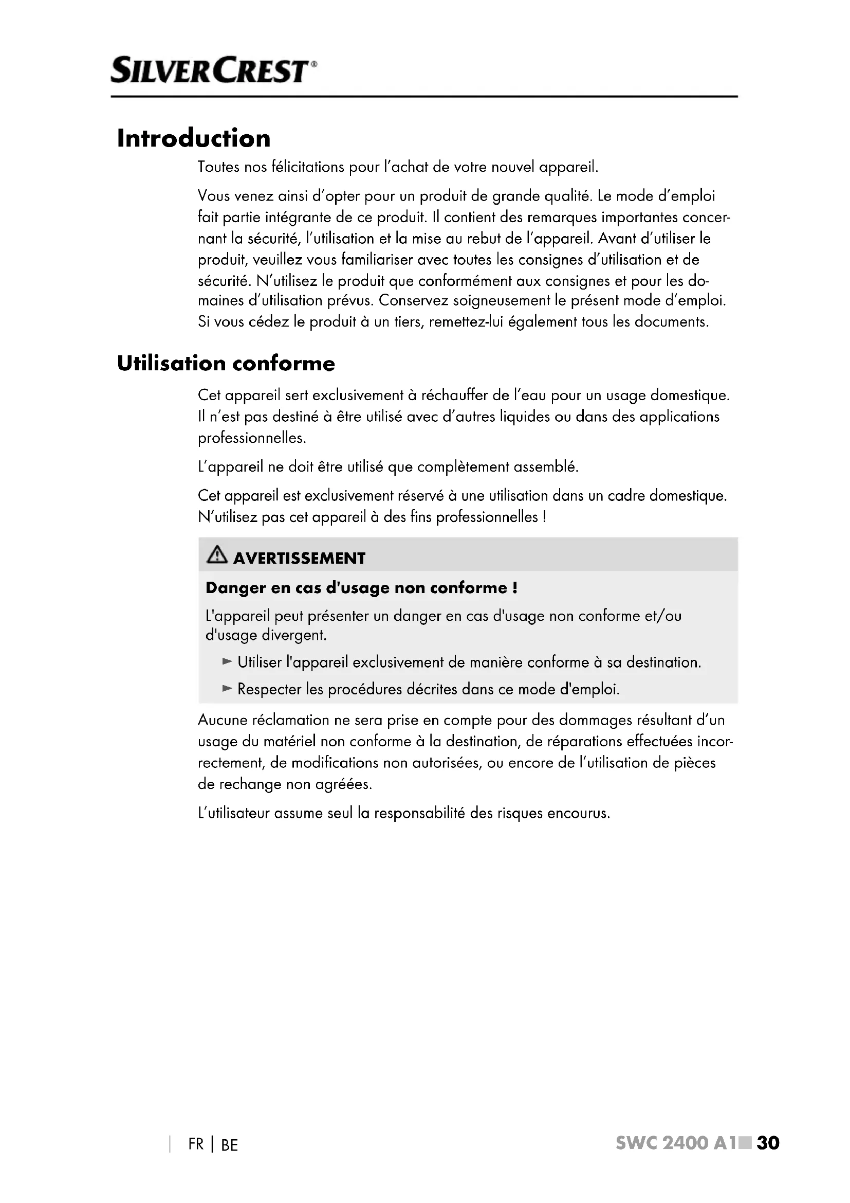 Introduction Toutes nos félicitations pour l’achat de votre nouvel appareil. Vous venez ainsi d’opter pour un produit de grande qualité. Le mode d’emploi fait partie intégrante de ce produit. Il contient des remarques importantes concer- nant la sécurité, l’utilisation et la mise au rebut de l’appareil. Avant d’utiliser le produit, veuillez vous familiariser avec toutes les consignes d’utilisation et de sécurité. N’utilisez le produit que conformément aux consignes et pour les do- maines d’utilisation prévus. Conservez soigneusement le présent mode d’emploi. Si vous cédez le produit à un tiers, remettez-lui également tous les documents. Utilisation conforme Cet appareil sert exclusivement à réchauffer de l’eau pour un usage domestique. Il n’est pas destiné à être utilisé avec d’autres liquides ou dans des applications professionnelles. L’appareil ne doit être utilisé que complètement assemblé. Cet appareil est exclusivement réservé à une utilisation dans un cadre domestique. N’utilisez pas cet appareil à des fins professionnelles ! AVERTISSEMENT Danger en cas d'usage non conforme ! L'appareil peut présenter un danger en cas d'usage non conforme et/ou d'usage divergent. ► Utiliser l'appareil exclusivement de manière conforme à sa destination. ► Respecter les procédures décrites dans ce mode d'emploi. Aucune réclamation ne sera prise en compte pour des dommages résultant d’un usage du matériel non conforme à la destination, de réparations effectuées incor- rectement, de modifications non autorisées, ou encore de l’utilisation de pièces de rechange non agréées. L’utilisateur assume seul la responsabilité des risques encourus.SWC 2400 A1 FR