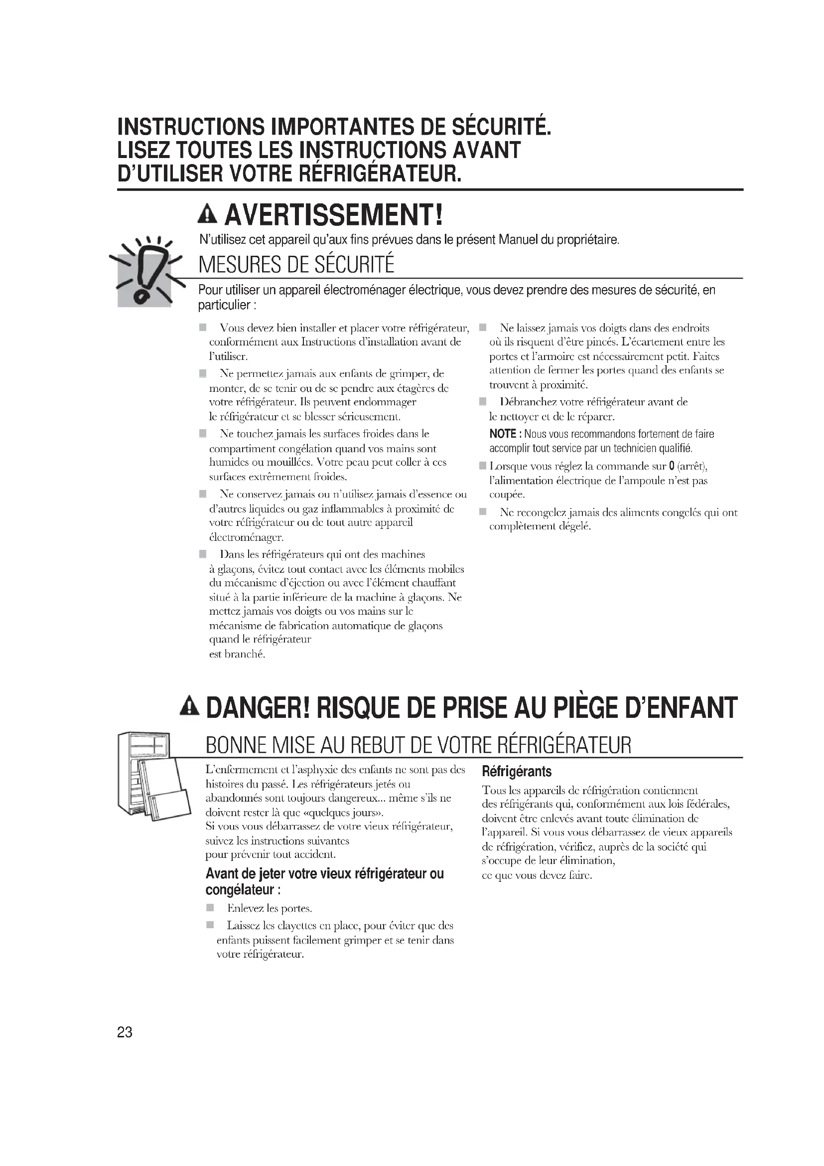 Ne permettez jamais aux enfants de grimper, de monter, de se tenir ou de se pendre aux étagères de votre réfrigérateur. Ils peuvent endommager le réfrigérateur et se blesser sérieusement.