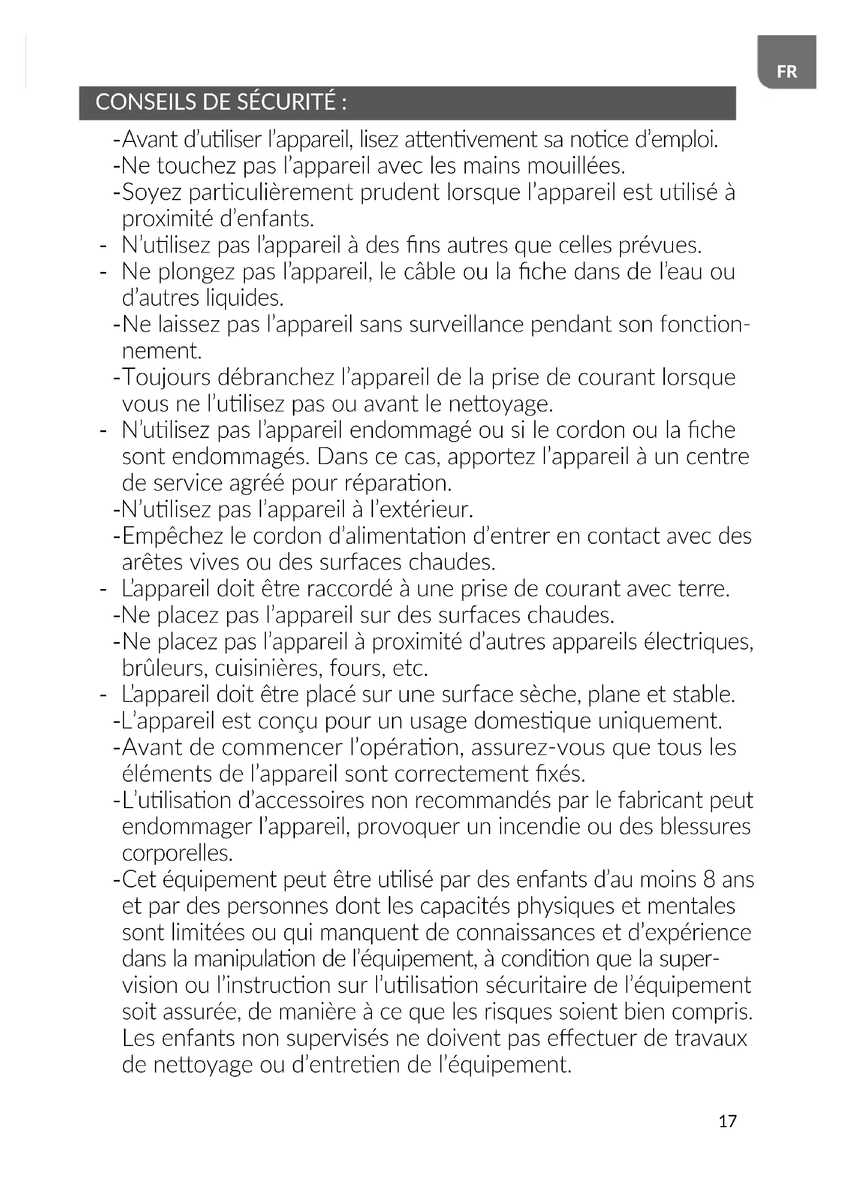 Ne placez pas l’appareil à proximité d’autres appareils électriques, brûleurs, cuisinières, fours, etc. - L’appareil doit être placé sur une surface sèche, plane et stable. - L’appareil est conçu pour un usage domesque uniquement.