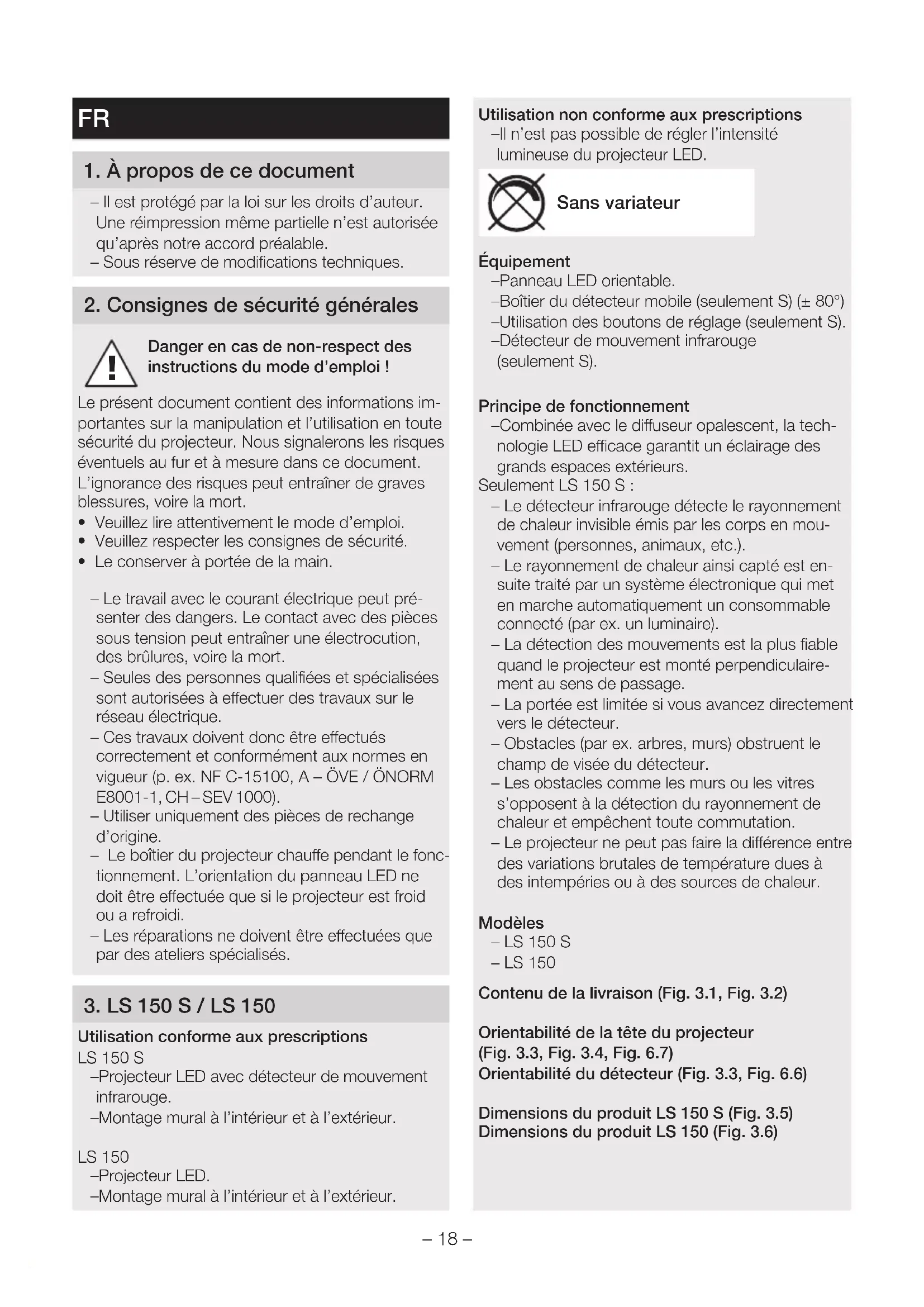 Utilisation conforme aux prescriptions LS150S – Projecteur LED avec détecteur de mouvement infrarouge. – Montage mural à l’intérieur et à l’extérieur. LS150 – Projecteur LED. – Montage mural à l’intérieur et à l’extérieur. Utilisation non conforme aux prescriptions – Il n’est pas possible de régler l’intensité lumineuse du projecteur LED. Sans variateur Équipement – Panneau LED orientable. – Boîtier du détecteur mobile (seulement S) (±80°) – Utilisation des boutons de réglage (seulement S). – Détecteur de mouvement infrarouge (seulement S). Principe de fonctionnement – Combinée avec le diuseur opalescent, la tech- nologie LED ecace garantit un éclairage des grands espaces extérieurs. Seulement LS 150 S : – Le détecteur infrarouge détecte le rayonnement de chaleur invisible émis par les corps en mou- vement (personnes, animaux, etc.). – Le rayonnement de chaleur ainsi capté est en- suite traité par un système électronique qui met en marche automatiquement un consommable connecté (par ex. un luminaire). – La détection des mouvements est la plus fiable quand le projecteur est monté perpendiculaire- ment au sens de passage. – La portée est limitée si vous avancez directement vers le détecteur. – Obstacles (par ex. arbres, murs) obstruent le champ de visée du détecteur. – Les obstacles comme les murs ou les vitres s’opposent à la détection du rayonnement de chaleur et empêchent toute commutation. – Le projecteur ne peut pas faire la diérence entre des variations brutales de température dues à des intempéries ou à des sources de chaleur. Modèles – LS150S – LS150 Contenu de la livraison (Fig. 3.1, Fig.3.2) Orientabilité de la tête du projecteur (Fig. 3.3, Fig.3.4, Fig.6.7) Orientabilité du détecteur (Fig. 3.3, Fig.6.6) Dimensions du produit LS150S (Fig. 3.5) Dimensions du produit LS150 (Fig. 3.6)– 19 – Vue d’ensemble de l’appareil LS150S (Fig. 3.7) A Panneau LED B Boîtier C Support mural D Temporisation E Réglage du seuil de déclenchement F Détecteur G Anneau de protection Vue d’ensemble de l’appareil LS150S (Fig. 3.8) A Panneau LED B Boîtier C Support mural Caractéristiques techniques – Dimensions (H×l×P): LS 150 S : 210×155×176mm LS 150 : 178×157×178mm – Puissance absorbée (P