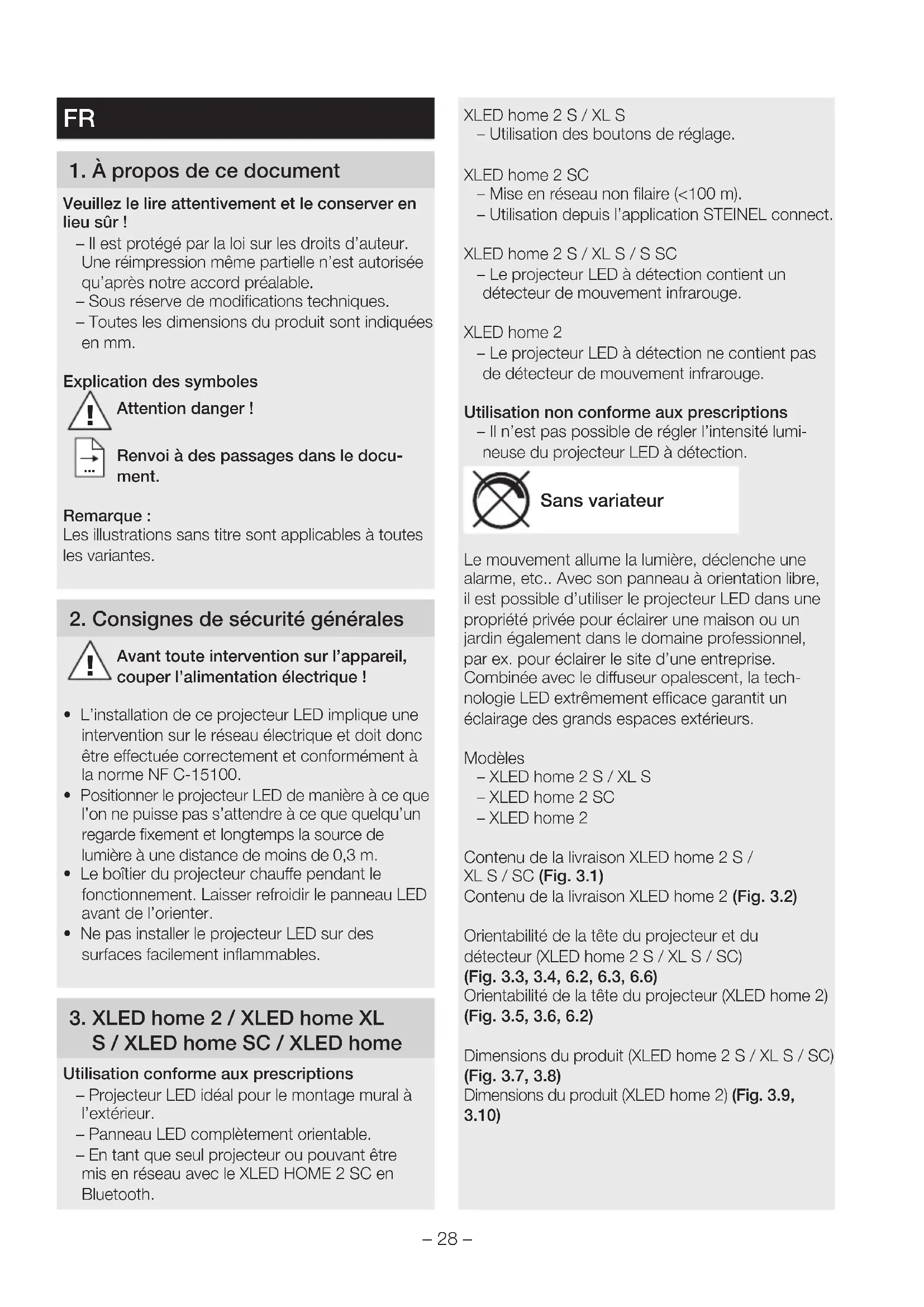S/XLEDhome SC/XLEDhome Utilisation conforme aux prescriptions – Projecteur LED idéal pour le montage mural à l’extérieur. – Panneau LED complètement orientable. – En tant que seul projecteur ou pouvant être mis en réseau avec le XLED HOME 2 SC en Bluetooth. XLEDhome2 S/XL S – Utilisation des boutons de réglage. XLEDhome2 SC – Mise en réseau non filaire (<100m). – Utilisation depuis l’application STEINEL connect. XLED home 2 S/XL S/S SC – Le projecteur LED à détection contient un détecteur de mouvement infrarouge. XLED home 2 – Le projecteur LED à détection ne contient pas de détecteur de mouvement infrarouge. Utilisation non conforme aux prescriptions – Il n’est pas possible de régler l’intensité lumi- neuse du projecteur LED à détection. Sans variateur Le mouvement allume la lumière, déclenche une alarme, etc.. Avec son panneau à orientation libre, il est possible d’utiliser le projecteur LED dans une propriété privée pour éclairer une maison ou un jardin également dans le domaine professionnel, par ex. pour éclairer le site d’une entreprise. Combinée avec le diuseur opalescent, la tech- nologie LED extrêmement ecace garantit un éclairage des grands espaces extérieurs. Modèles – XLEDhome2 S/XL S – XLEDhome2SC – XLEDhome2 Contenu de la livraison XLED home 2 S/ XL S/SC (Fig.3.1) Contenu de la livraison XLEDhome2 (Fig.3.2) Orientabilité de la tête du projecteur et du détecteur (XLED home 2 S/XL S/SC) (Fig.3.3, 3.4, 6.2, 6.3, 6.6) Orientabilité de la tête du projecteur (XLEDhome2) (Fig.3.5, 3.6, 6.2) Dimensions du produit (XLED home 2 S/XL S/SC) (Fig.3.7, 3.8) Dimensions du produit (XLEDhome2) (Fig.3.9, 3.10)– 29 – Vue d’ensemble du produit (XLED home 2 S/XL S/SC) (Fig.3.11) A Panneau LED B Boîtier C Support mural D Détecteur E Temporisation (XLED home 2 S/XLED home2XL S) F Réglage du seuil de déclenchement (XLED home 2 S/XLEDhome 2 XL S) Vue d’ensemble du produit (XLEDhome2) (Fig.3.12) A Panneau LED B Boîtier C Support mural Répartition de l’intensité lumineuse (Fig. 3.13)