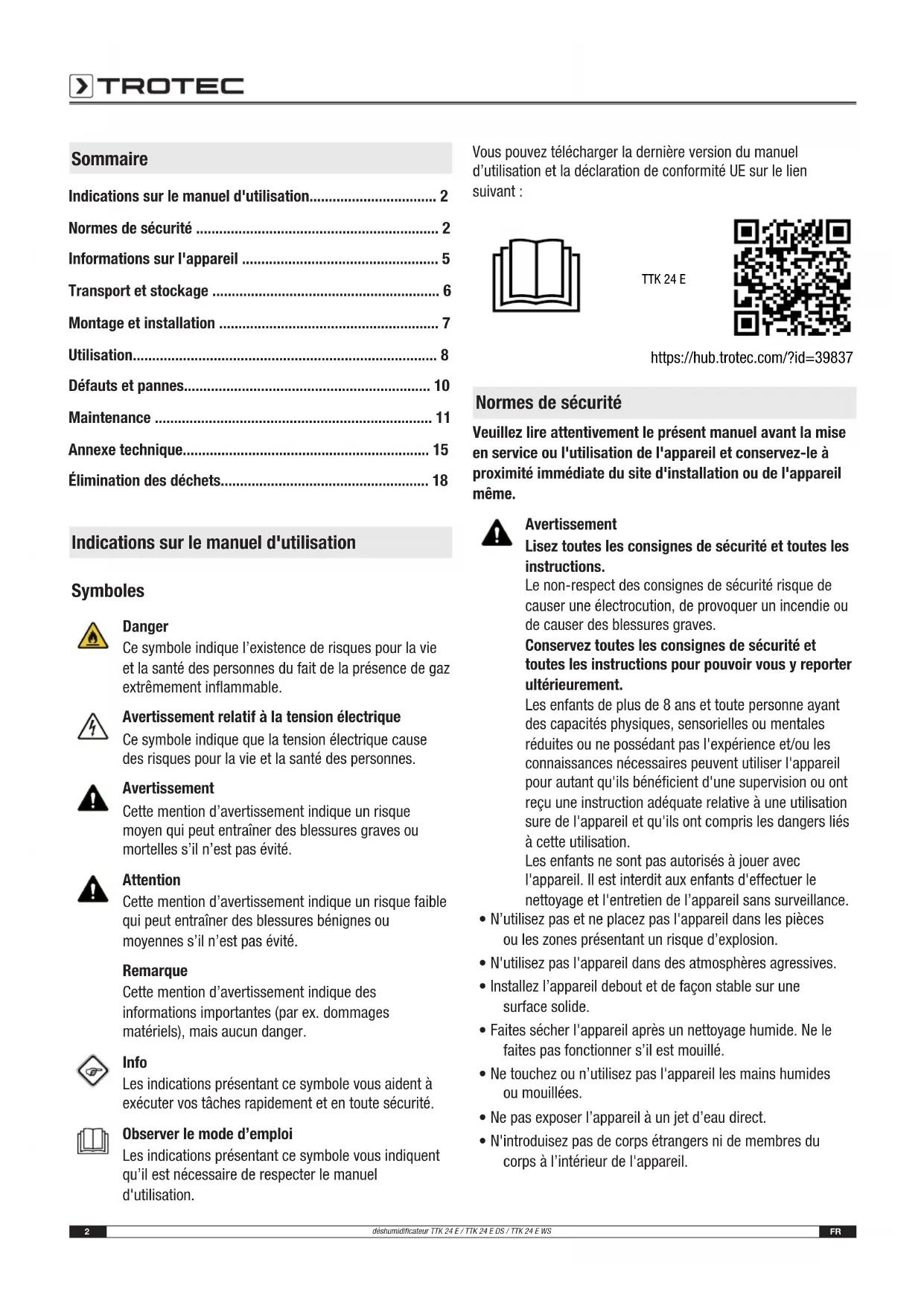 - Élimination des déchets Indications sur le manuel d'utilisation Symboles Danger Ce symbole indique l’existence de risques pour la vie et la santé des personnes du fait de la présence de gaz extrêmement inflammable. Avertissement relatif à la tension électrique Ce symbole indique que la tension électrique cause des risques pour la vie et la santé des personnes. Avertissement Cette mention d’avertissement indique un risque moyen qui peut entraîner des blessures graves ou mortelles s’il n’est pas évité. Attention Cette mention d’avertissement indique un risque faible qui peut entraîner des blessures bénignes ou moyennes s’il n’est pas évité. Remarque Cette mention d’avertissement indique des informations importantes (par ex. dommages matériels), mais aucun danger. Info Les indications présentant ce symbole vous aident à exécuter vos tâches rapidement et en toute sécurité. Observer le mode d’emploi Les indications présentant ce symbole vous indiquent qu’il est nécessaire de respecter le manuel d'utilisation. Vous pouvez télécharger la dernière version du manuel d’utilisation et la déclaration de conformité UE sur le lien suivant: TTK 24 E https://hub.trotec.com/?id=39837 Normes de sécurité Veuillez lire attentivement le présent manuel avant la mise en service ou l'utilisation de l'appareil et conservez-le à proximité immédiate du site d'installation ou de l'appareil même. Avertissement Lisez toutes les consignes de sécurité et toutes les instructions. Le non-respect des consignes de sécurité risque de causer une électrocution, de provoquer un incendie ou de causer des blessures graves. Conservez toutes les consignes de sécurité et toutes les instructions pour pouvoir vous y reporter ultérieurement. Les enfants de plus de 8ans et toute personne ayant des capacités physiques, sensorielles ou mentales réduites ou ne possédant pas l'expérience et/ou les connaissances nécessaires peuvent utiliser l'appareil pour autant qu'ils bénéficient d'une supervision ou ont reçu une instruction adéquate relative à une utilisation sure de l'appareil et qu'ils ont compris les dangers liés à cette utilisation. Les enfants ne sont pas autorisés à jouer avec l'appareil. Il est interdit aux enfants d'effectuer le nettoyage et l'entretien de l’appareil sans surveillance. p. 18