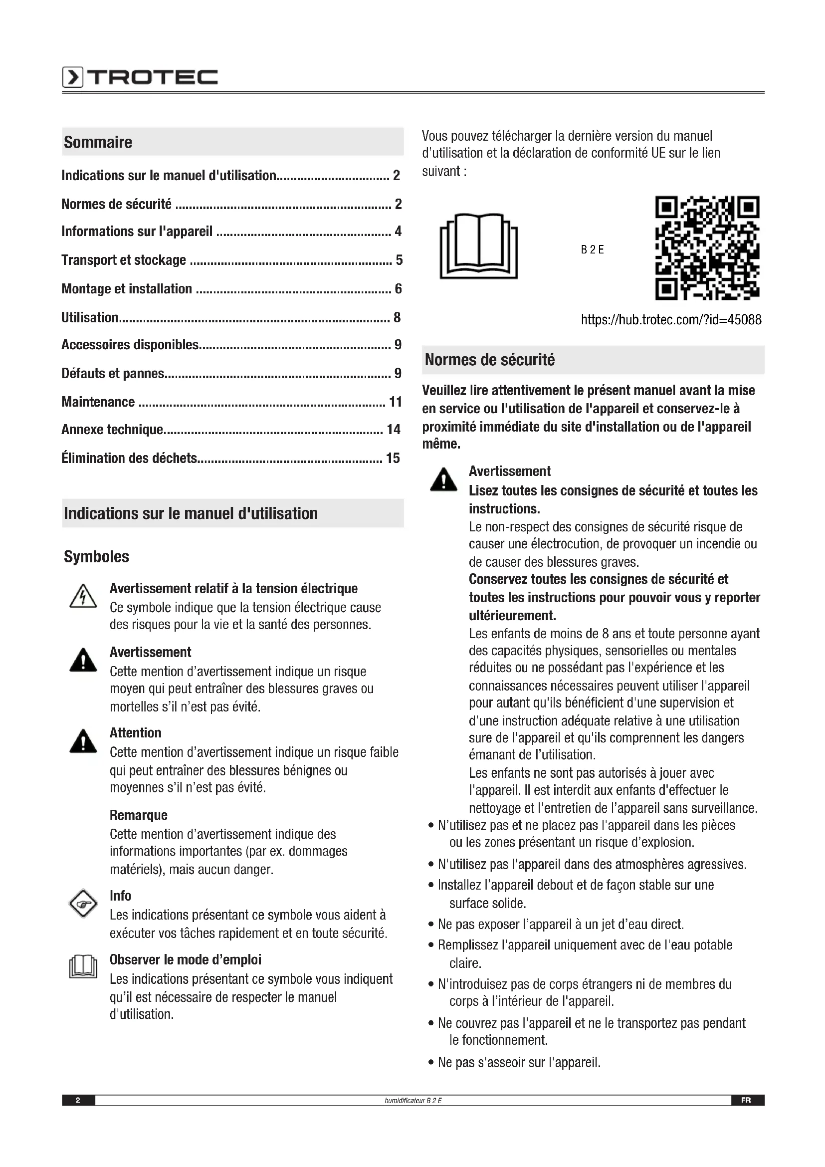 - Élimination des déchets Indications sur le manuel d'utilisation Symboles Avertissement relatif à la tension électrique Ce symbole indique que la tension électrique cause des risques pour la vie et la santé des personnes. Avertissement Cette mention d’avertissement indique un risque moyen qui peut entraîner des blessures graves ou mortelles s’il n’est pas évité. Attention Cette mention d’avertissement indique un risque faible qui peut entraîner des blessures bénignes ou moyennes s’il n’est pas évité. Remarque Cette mention d’avertissement indique des informations importantes (par ex. dommages matériels), mais aucun danger. Info Les indications présentant ce symbole vous aident à exécuter vos tâches rapidement et en toute sécurité. Observer le mode d’emploi Les indications présentant ce symbole vous indiquent qu’il est nécessaire de respecter le manuel d'utilisation. Vous pouvez télécharger la dernière version du manuel d’utilisation et la déclaration de conformité UE sur le lien suivant: B 2 E https://hub.trotec.com/?id=45088 Normes de sécurité Veuillez lire attentivement le présent manuel avant la mise en service ou l'utilisation de l'appareil et conservez-le à proximité immédiate du site d'installation ou de l'appareil même. Avertissement Lisez toutes les consignes de sécurité et toutes les instructions. Le non-respect des consignes de sécurité risque de causer une électrocution, de provoquer un incendie ou de causer des blessures graves. Conservez toutes les consignes de sécurité et toutes les instructions pour pouvoir vous y reporter ultérieurement. Les enfants de moins de 8 ans et toute personne ayant des capacités physiques, sensorielles ou mentales réduites ou ne possédant pas l'expérience et les connaissances nécessaires peuvent utiliser l'appareil pour autant qu'ils bénéficient d'une supervision et d’une instruction adéquate relative à une utilisation sure de l'appareil et qu'ils comprennent les dangers émanant de l’utilisation. Les enfants ne sont pas autorisés à jouer avec l'appareil. Il est interdit aux enfants d'effectuer le nettoyage et l'entretien de l’appareil sans surveillance. p. 15