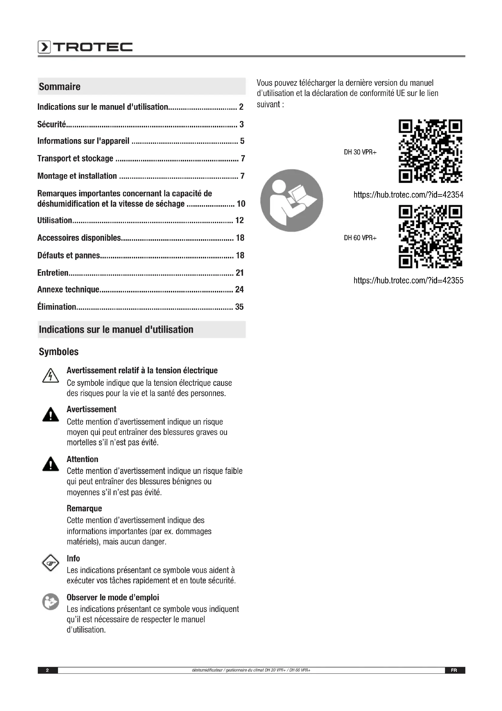 - Élimination Indications sur le manuel d'utilisation Symboles Avertissement relatif à la tension électrique Ce symbole indique que la tension électrique cause des risques pour la vie et la santé des personnes. Avertissement Cette mention d’avertissement indique un risque moyen qui peut entraîner des blessures graves ou mortelles s’il n’est pas évité. Attention Cette mention d’avertissement indique un risque faible qui peut entraîner des blessures bénignes ou moyennes s’il n’est pas évité. Remarque Cette mention d’avertissement indique des informations importantes (par ex. dommages matériels), mais aucun danger. Info Les indications présentant ce symbole vous aident à exécuter vos tâches rapidement et en toute sécurité. Observer le mode d’emploi Les indications présentant ce symbole vous indiquent qu’il est nécessaire de respecter le manuel d'utilisation. Vous pouvez télécharger la dernière version du manuel d’utilisation et la déclaration de conformité UE sur le lien suivant: DH 30 VPR+ https://hub.trotec.com/?id=42354 DH 60 VPR+ https://hub.trotec.com/?id=42355FR 3 déshumidificateur / gestionnaire du climat DH 30 VPR+ / DH 60 VPR+ Sécurité Veuillez lire attentivement le présent manuel avant la mise en service ou l'utilisation de l'appareil et conservez-le à proximité immédiate du site d'installation ou de l'appareil même. Avertissement Lisez toutes les consignes de sécurité et toutes les instructions. Le non-respect des consignes de sécurité risque de causer une électrocution, de provoquer un incendie ou de causer des blessures graves. Conservez toutes les consignes de sécurité et toutes les instructions pour pouvoir vous y reporter ultérieurement. Les enfants de moins de 8 ans et toute personne ayant des capacités physiques, sensorielles ou mentales réduites ou ne possédant pas l'expérience et les connaissances nécessaires peuvent utiliser l'appareil pour autant qu'ils bénéficient d'une supervision et d’une instruction adéquate relative à une utilisation sure de l'appareil et qu'ils comprennent les dangers émanant de l’utilisation. Les enfants ne sont pas autorisés à jouer avec l'appareil. Il est interdit aux enfants d'effectuer le nettoyage et l'entretien de l’appareil sans surveillance. p. 35