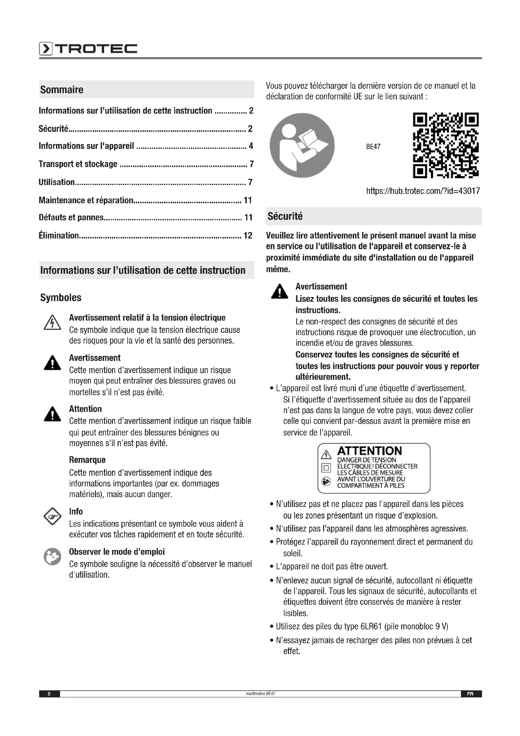 - La tension des piles est insuffisante. Remplacez les piles sans délai.12 FR multimètre BE47 Élimination Éliminez toujours le matériel d'emballage en respectant les impératifs écologiques et conformément aux prescriptions de gestion des déchets locaux applicables. Le pictogramme représentant une poubelle barrée, apposé sur un appareil électrique ou électronique, provient de la directive européenne 2012/19/UE. Il signifie que cet appareil ne doit pas être éliminé en fin de vie avec les ordures ménagères. Des points de collecte gratuits pour les appareils électriques ou électroniques usagés sont à votre disposition à proximité de chez vous. Les autorités de votre ville ou de votre commune peuvent vous en fournir les adresses. Pour de nombreux pays de l'UE, vous trouverez sur la page Internet https://hub.trotec.com/?id=45090 des informations sur d'autres possibilités de prise en charge. Sinon, adressez-vous à une entreprise homologuée dans votre pays pour le recyclage et l'élimination des appareils électriques usagés. La collecte séparée des appareils électriques et électroniques usagés permet leur réutilisation éventuelle, le recyclage des matériaux constitutifs et les autres formes de recyclage tout en évitant les conséquences négatives pour l’environnement et la santé des produits dangereux qu’ils sont susceptibles de contenir. Les piles usagées et les batteries ne doivent pas être jetées avec les ordures ménagères, mais être éliminées conformément à la directive européenne 2006/66/CE DU PARLEMENT ET DU CONSEIL EUROPEEN du6septembre2006 relative aux piles, aux piles rechargeables, aux accumulateurs et aux batteries. Veuillez éliminer les piles et les batteries conformément aux dispositions légales en vigueur. Valable uniquement en FranceTrotec GmbH Grebbener Str. 7 D-52525 Heinsberg