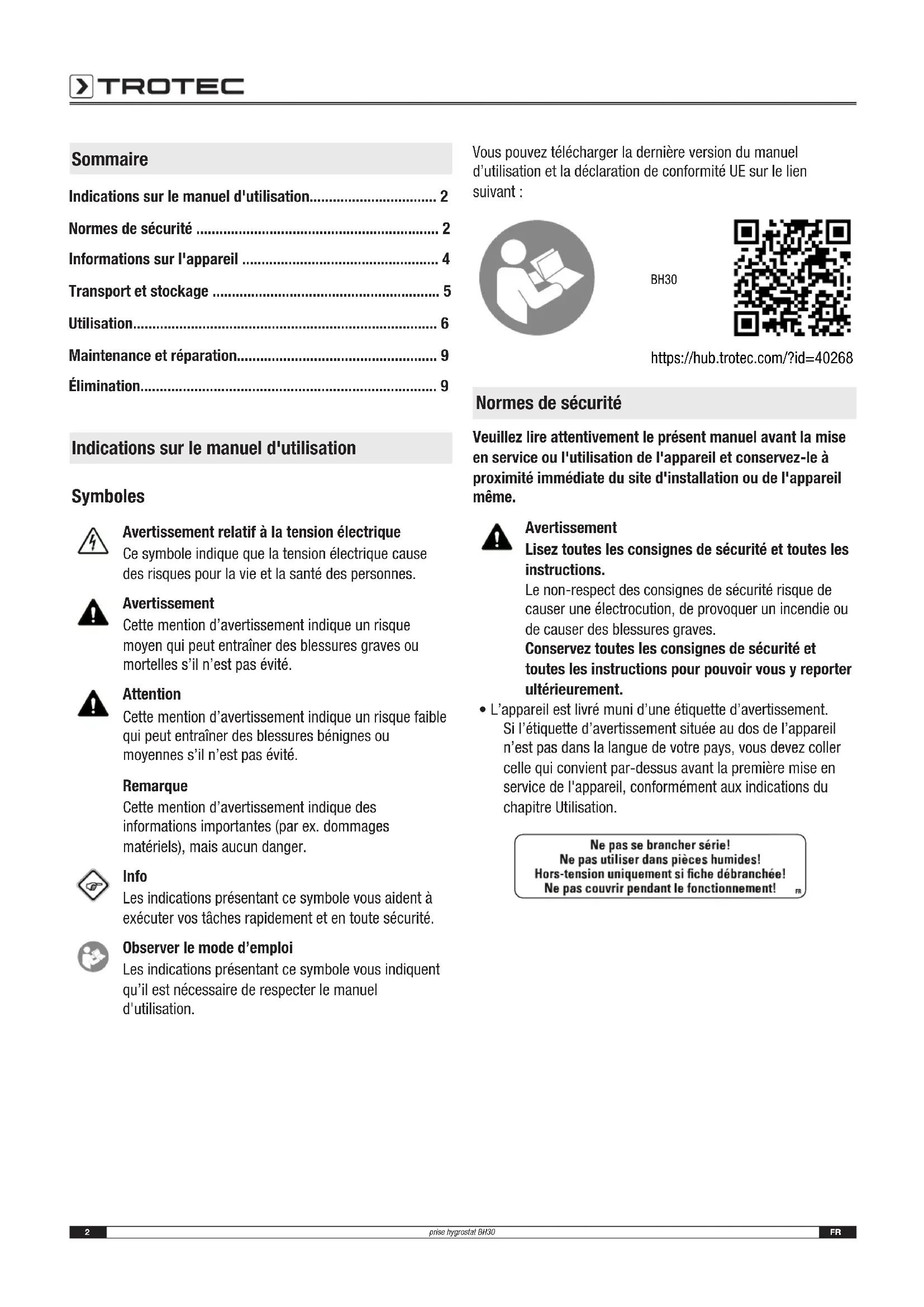 - Élimination Indications sur le manuel d'utilisation Symboles Avertissement relatif à la tension électrique Ce symbole indique que la tension électrique cause des risques pour la vie et la santé des personnes. Avertissement Cette mention d’avertissement indique un risque moyen qui peut entraîner des blessures graves ou mortelles s’il n’est pas évité. Attention Cette mention d’avertissement indique un risque faible qui peut entraîner des blessures bénignes ou moyennes s’il n’est pas évité. Remarque Cette mention d’avertissement indique des informations importantes (par ex. dommages matériels), mais aucun danger. Info Les indications présentant ce symbole vous aident à exécuter vos tâches rapidement et en toute sécurité. Observer le mode d’emploi Les indications présentant ce symbole vous indiquent qu’il est nécessaire de respecter le manuel d'utilisation. Vous pouvez télécharger la dernière version du manuel d’utilisation et la déclaration de conformité UE sur le lien suivant: BH30 https://hub.trotec.com/?id=40268 Normes de sécurité Veuillez lire attentivement le présent manuel avant la mise en service ou l'utilisation de l'appareil et conservez-le à proximité immédiate du site d'installation ou de l'appareil même. Avertissement Lisez toutes les consignes de sécurité et toutes les instructions. Le non-respect des consignes de sécurité risque de causer une électrocution, de provoquer un incendie ou de causer des blessures graves. Conservez toutes les consignes de sécurité et toutes les instructions pour pouvoir vous y reporter ultérieurement. p. 9