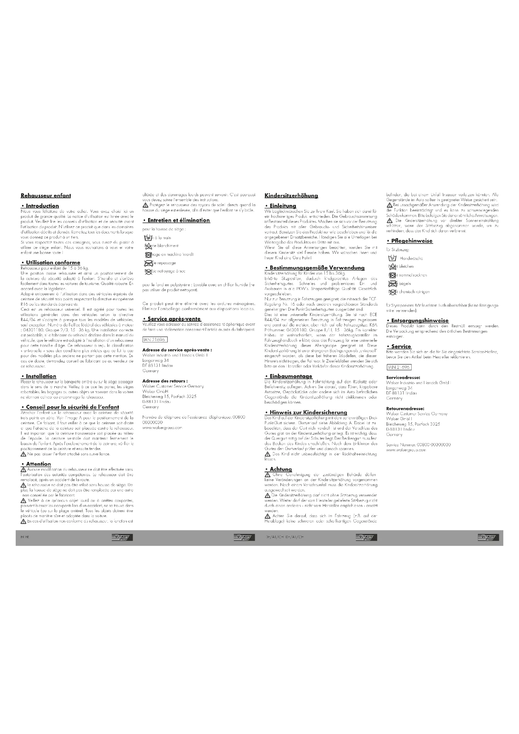 - Attention Aucune modification du rehausseur ne doit être effectuée sans l‘autorisation des autorités compétentes. Le rehausseur doit être remplacé, après un accident de la route. Le rehausseur ne doit pas être utilisé sans housse de siège. De plus, la housse de siège ne doit pas être remplacée par une autre - non conseillée par le fabricant. Veillez à ce qu‘aucun objet lourd ou à arrêtes coupantes, pouvant blesser les occupants lors d‘un accident, ne se trouve dans le véhicule (ou sur la plage arrière). Tous les objets doivent être placés de manière sûre et adaptée dans la voiture. En cas d‘utilisation non conforme du rehausseur, la fonction est altérée et des dommages lourds peuvent survenir. C‘est pourquoi vous devez suivre l‘ensemble des instructions. Protégez le rehausseur des rayons du soleil directs quand la housse du siège est enlevée, afin d‘éviter que l‘enfant ne s‘y brûle.